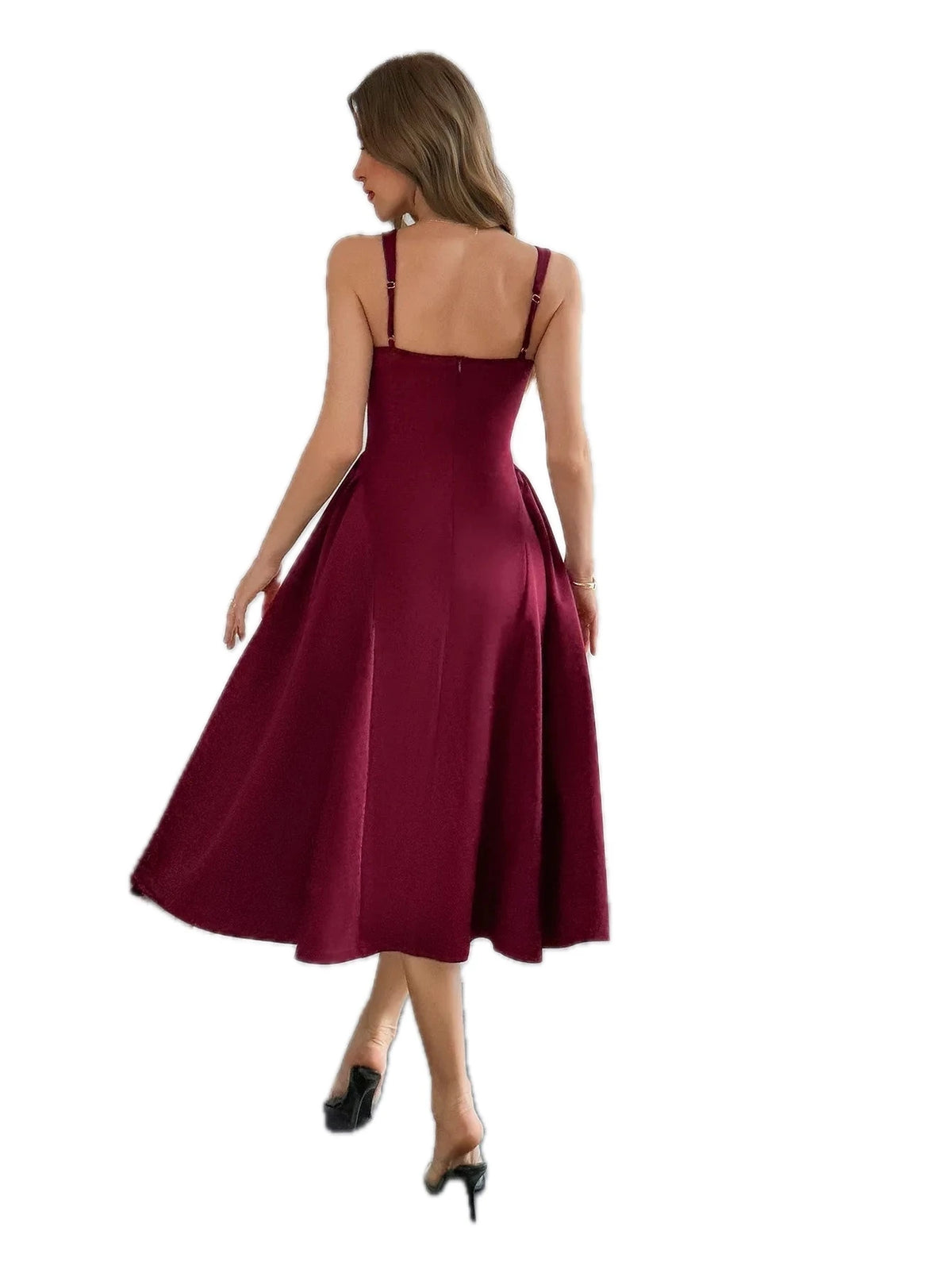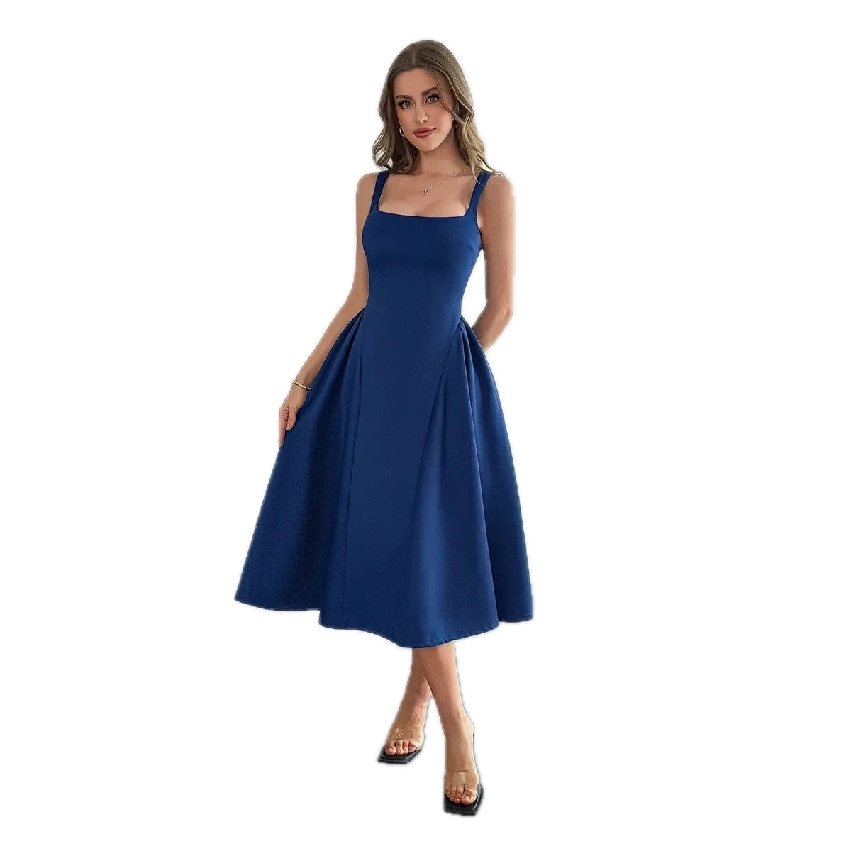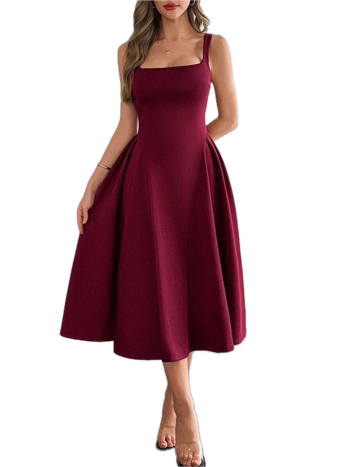 Women's Square Neck Wide Strap Midi Dress with 95% Polyester 5% Elastane for Elegant Fit and Easy Care Soft Drape
