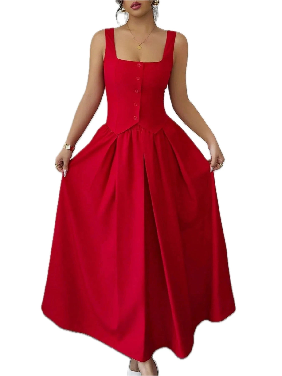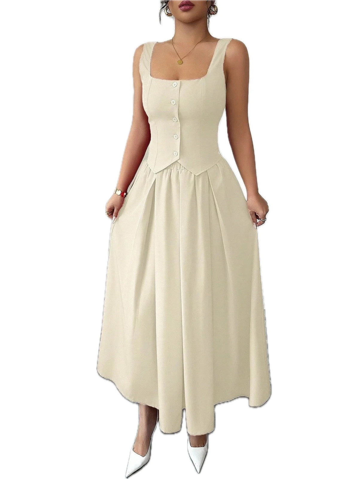 Women's Square Neck Wide Strap Midi Dress Buttoned Basic Style for Everyday Wear 95% polyester 5% elastane chic
