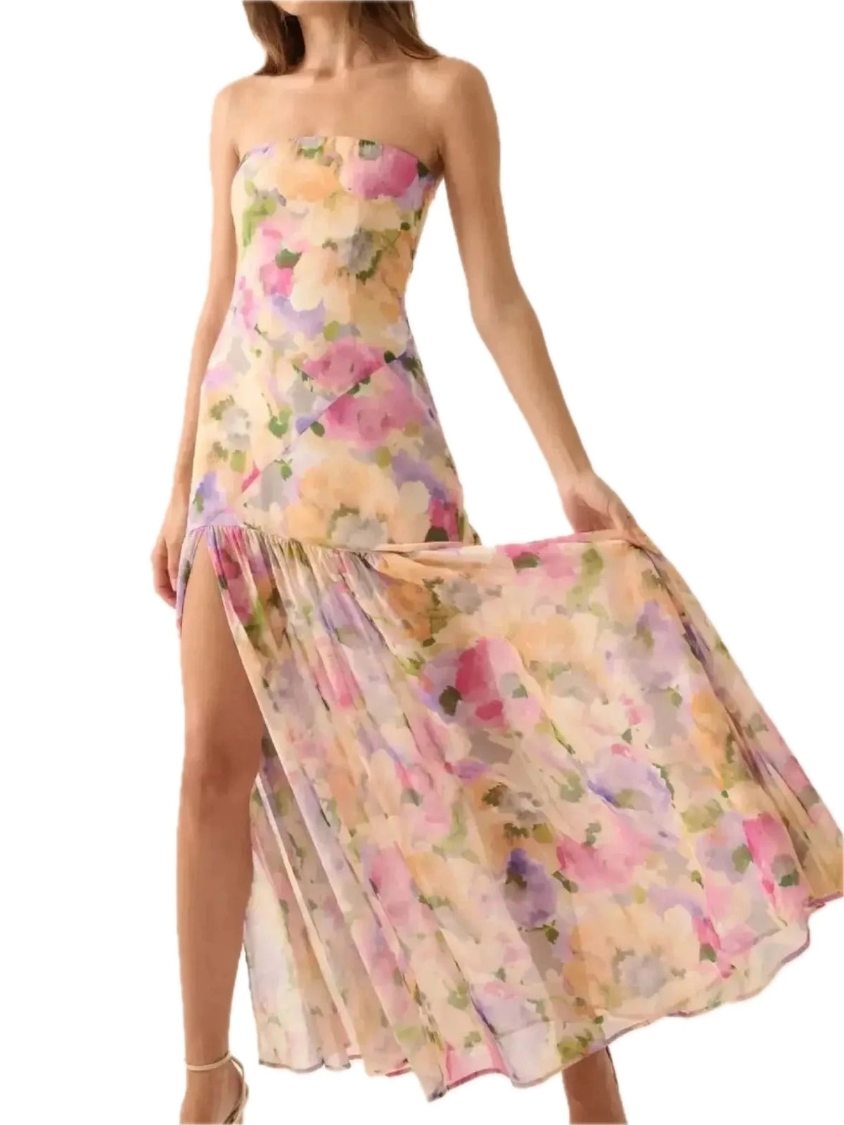 Women's Strapless Floral Maxi Dress with Side Slit Ruched Bodice Lightweight 100% Polyester Fabric for Summer Occasions