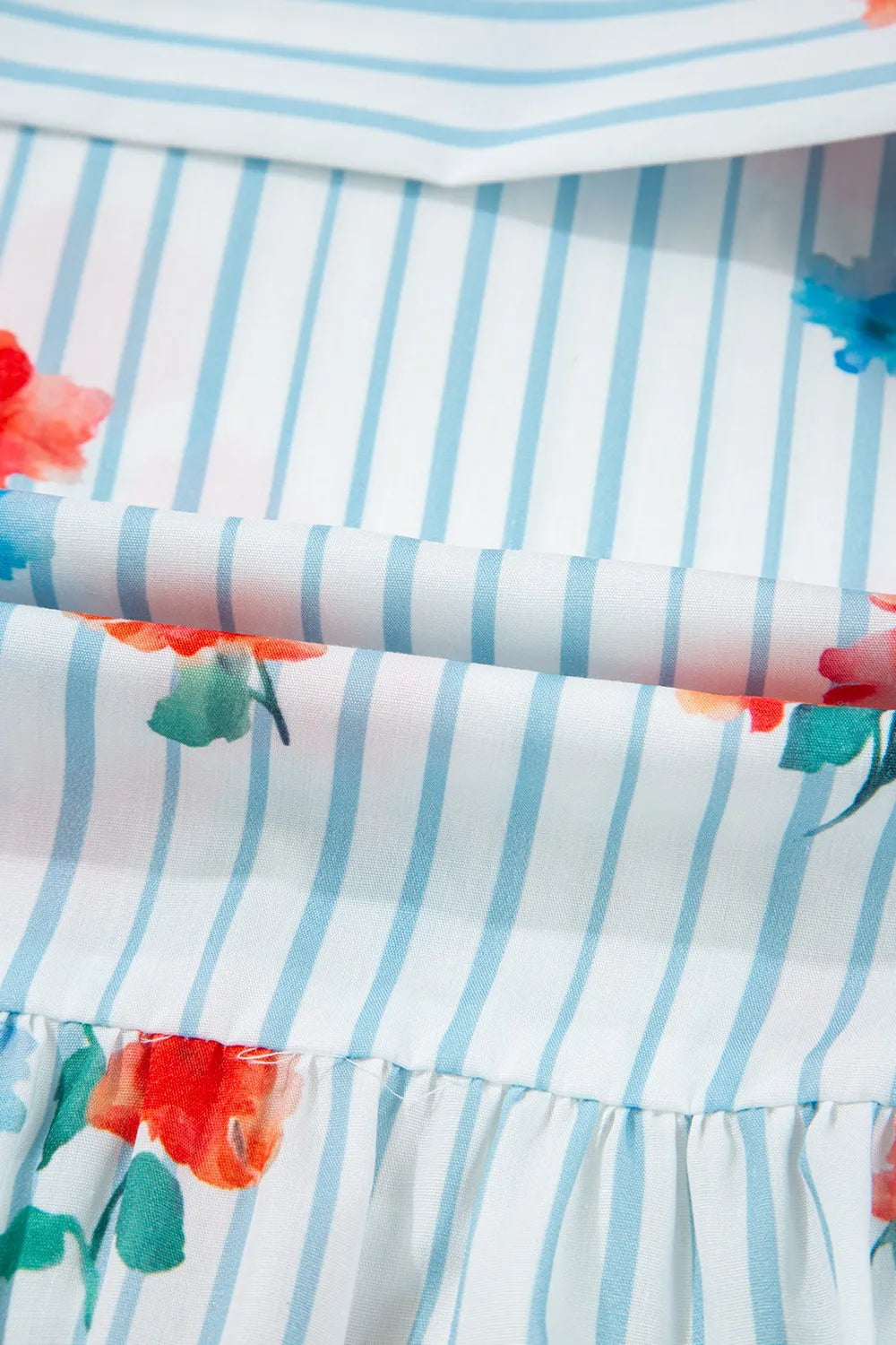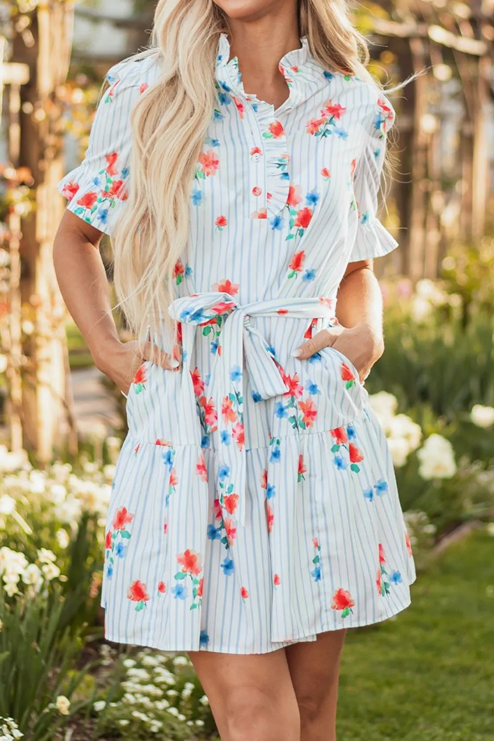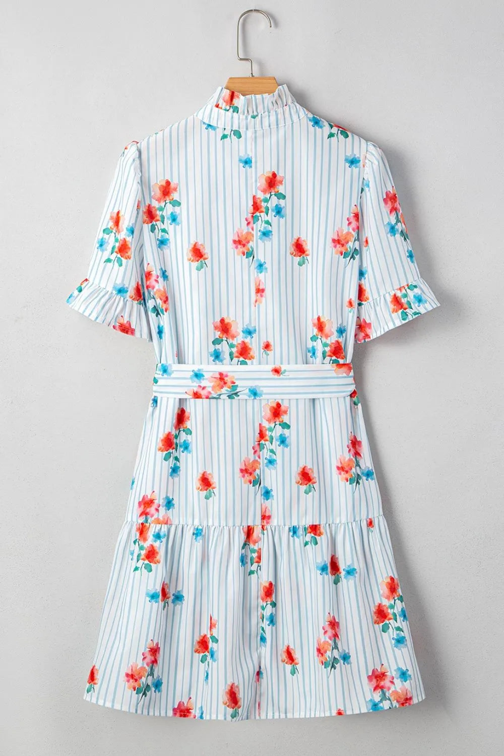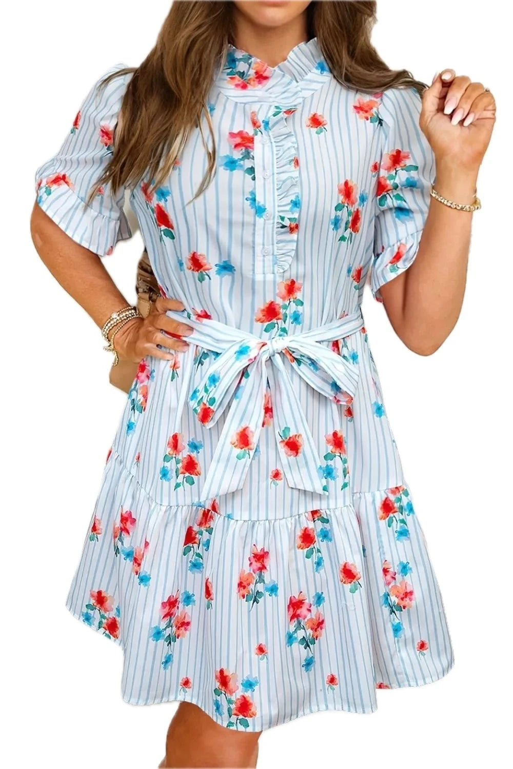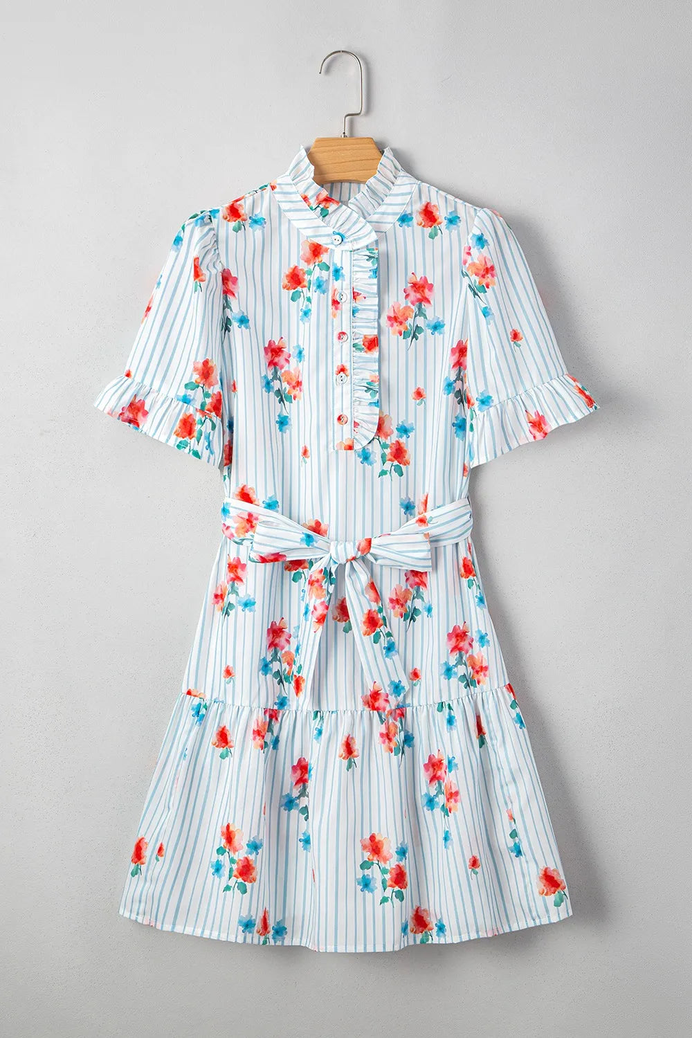 Women's Stripe Floral Pattern Ruffle Short Sleeve Belted Mini Dress with 100% Polyester Fabric ideal for daily wear