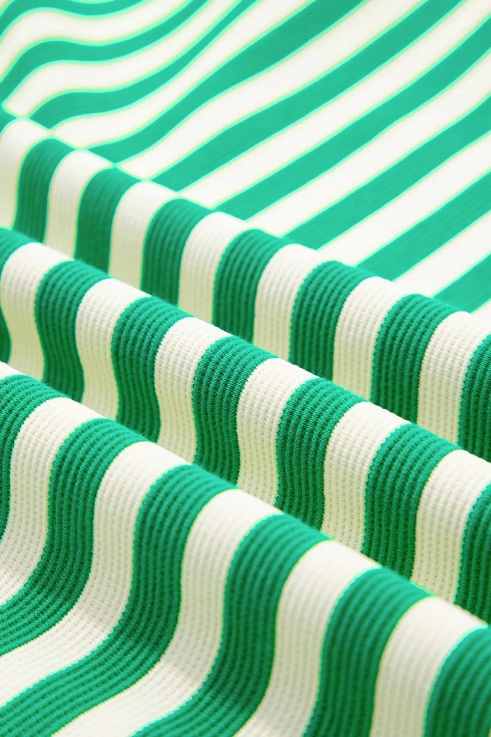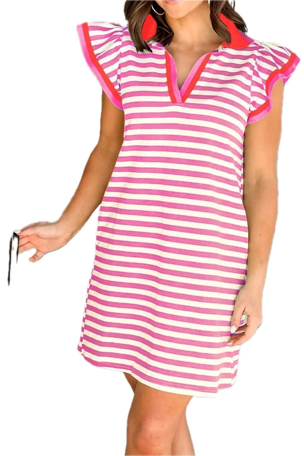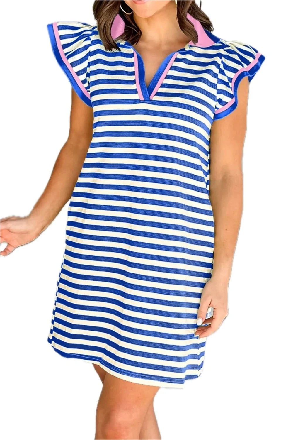 Women's Stripe Print Contrast Collar Split Neckline Flutter Sleeve Dress 65% polyester; 30% cotton; 5% elastane everyday