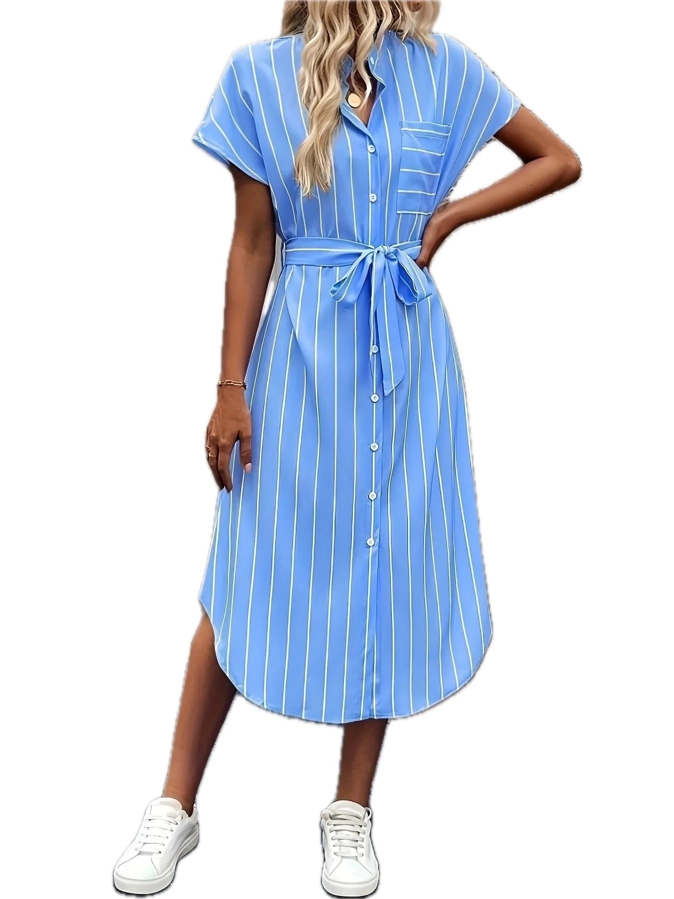 Men's Striped Button-Down Shirt Dress with Belted fabric 95% polyester fabric 5% spandex for versatile everyday wear