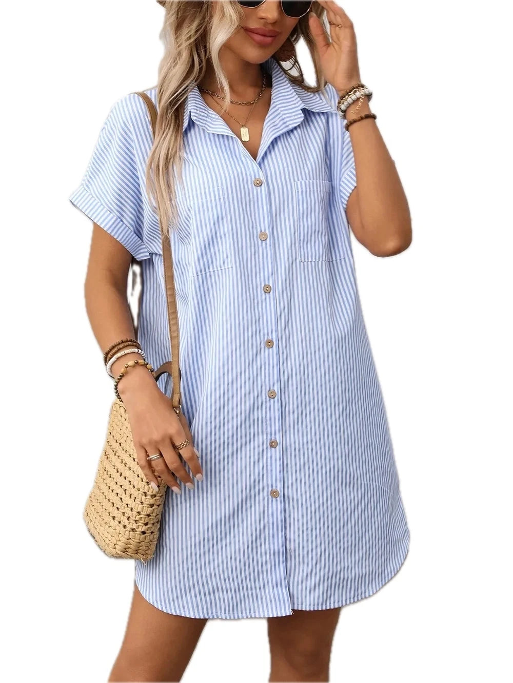 Women's Striped Button Down Short Sleeve Mini Dress with Pockets 100% Viscose Lightweight Comfort Summer Everyday