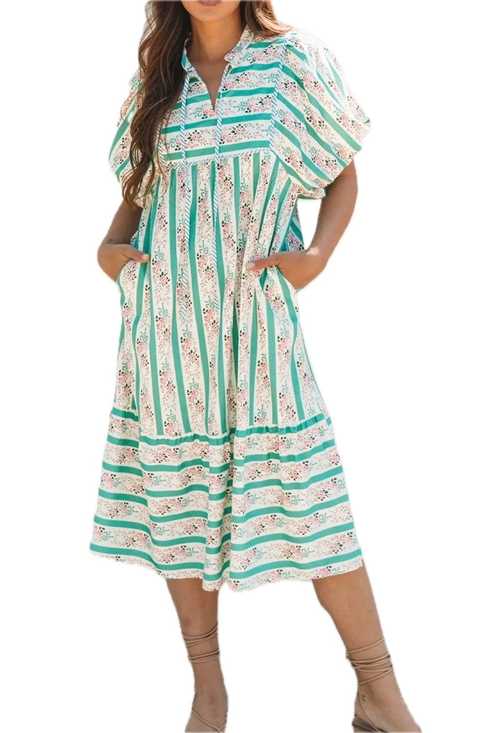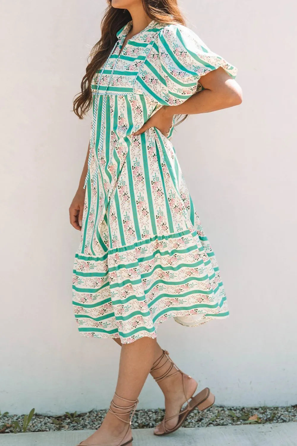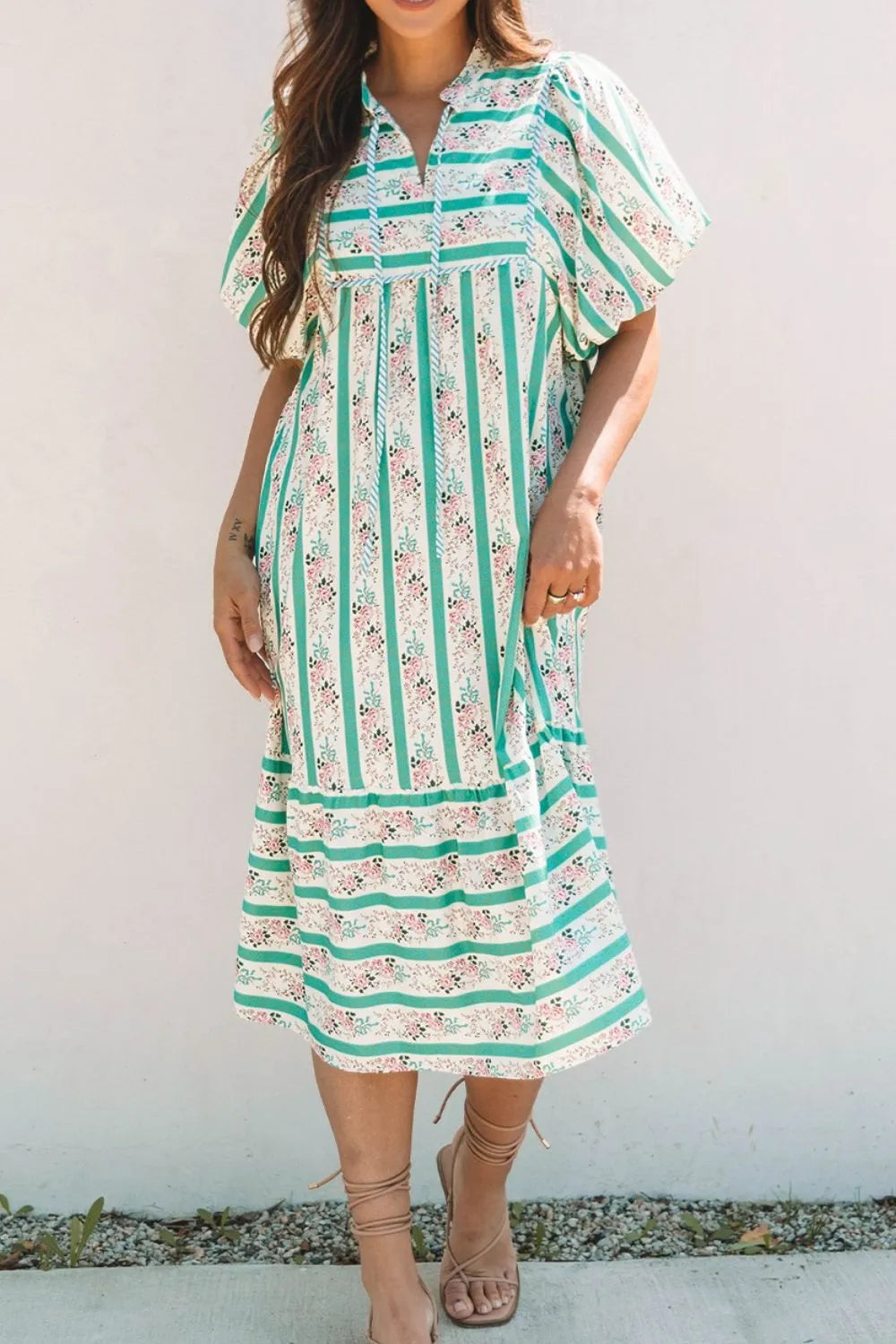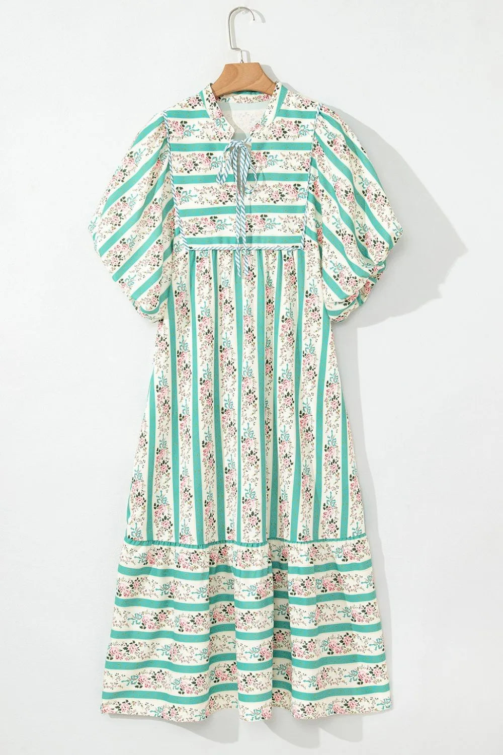Women's Striped Floral Print Tie Neck Puff Sleeve Midi Dress One hundred percent polyester Fabric versatile daily wear