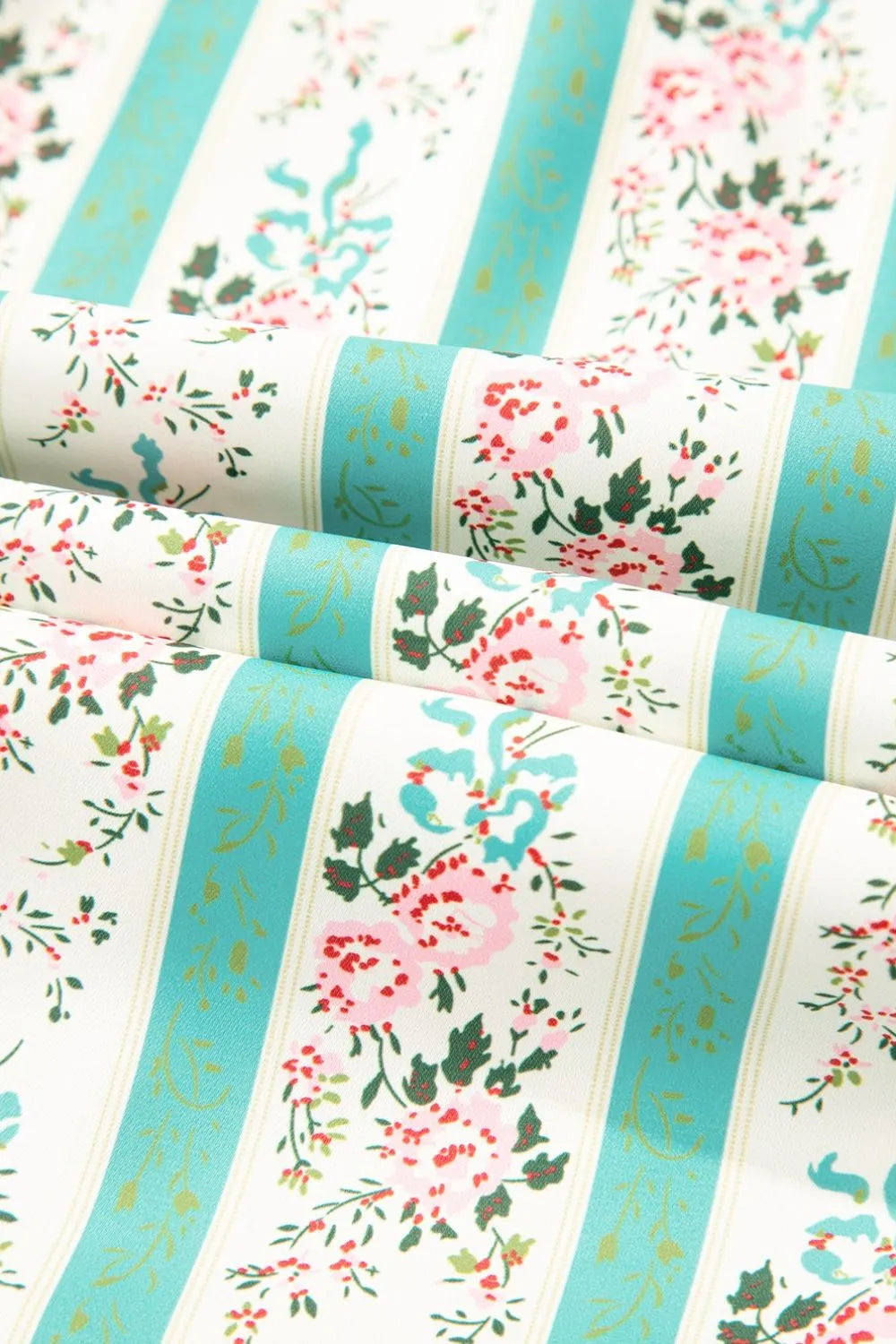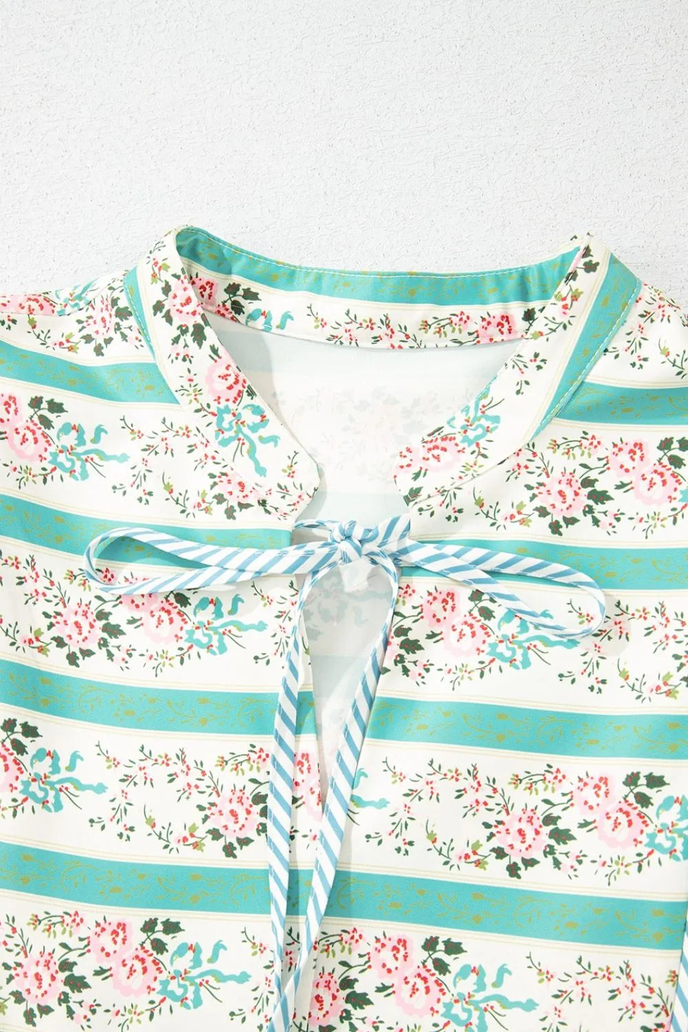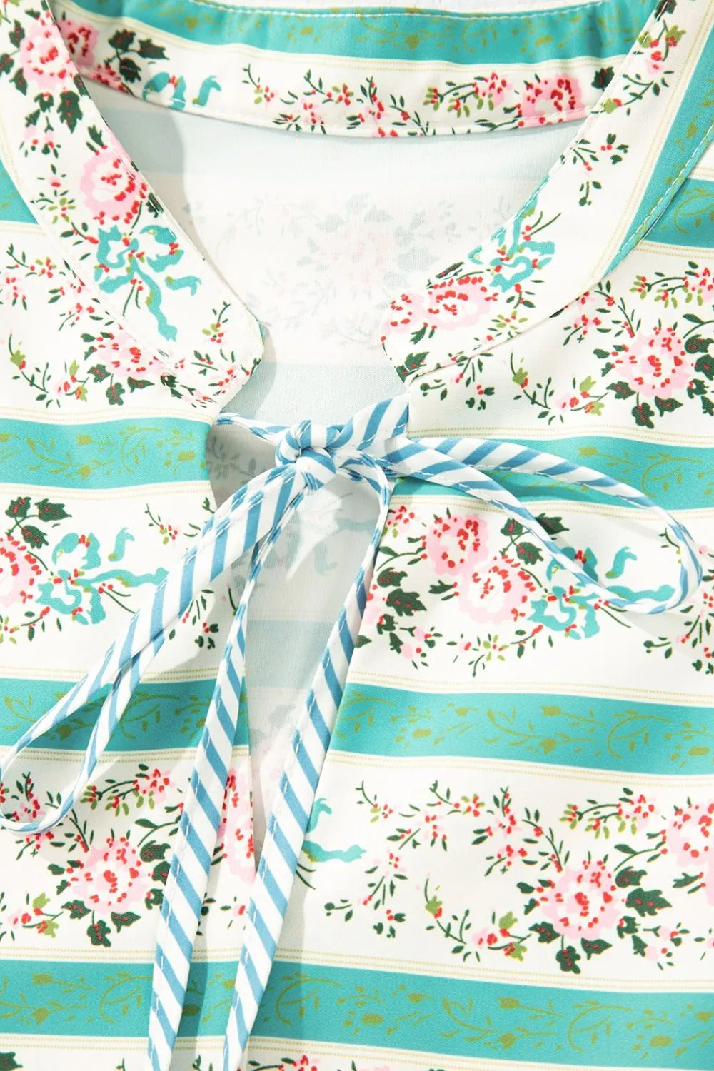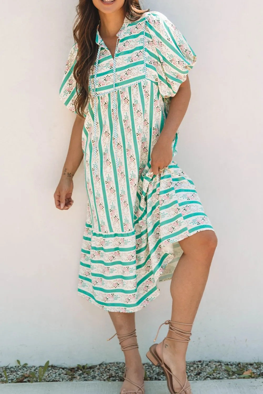 Women's Striped Floral Print Tie Neck Puff Sleeve Midi Dress One hundred percent polyester Fabric versatile daily wear