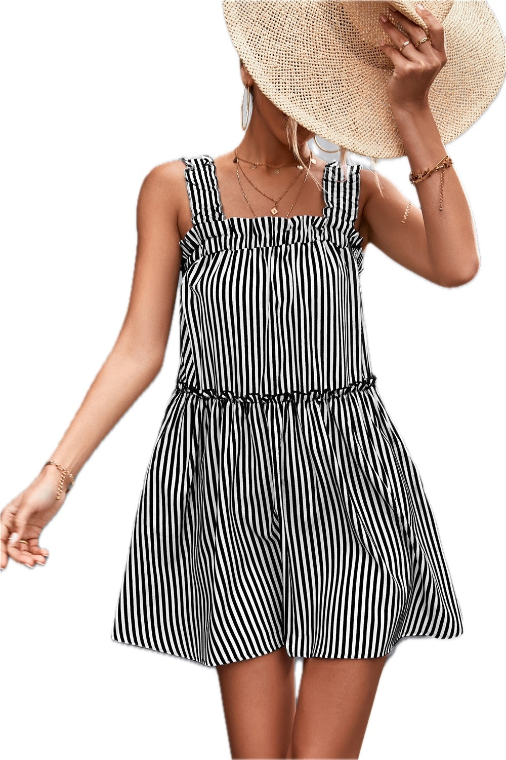 Women's Striped Frill Trim Square Neck Dress 95% Polyester and 5% Spandex for Everyday Wear Perfect Casual Day Out