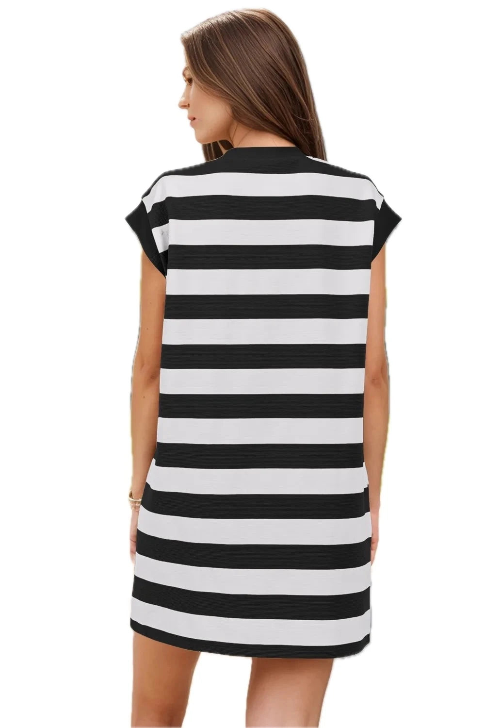 Women's Striped Round Neck Cap Sleeve Mini Dress with Pockets Ninety Five Percent Polyester and Five Percent Spandex