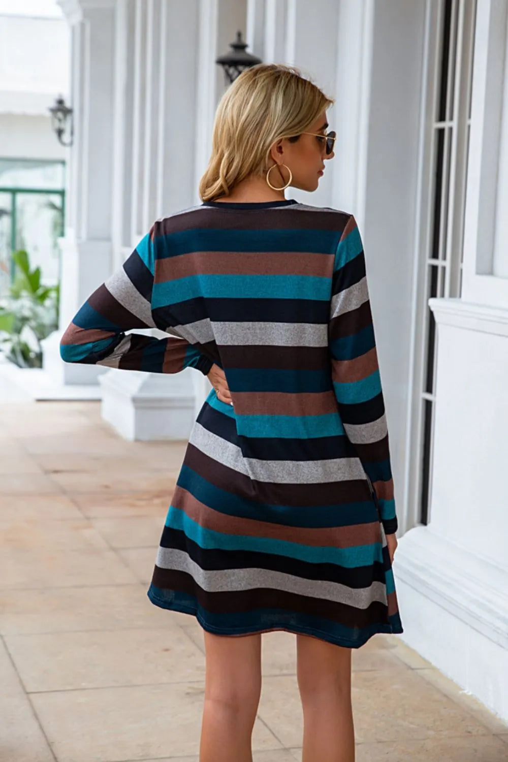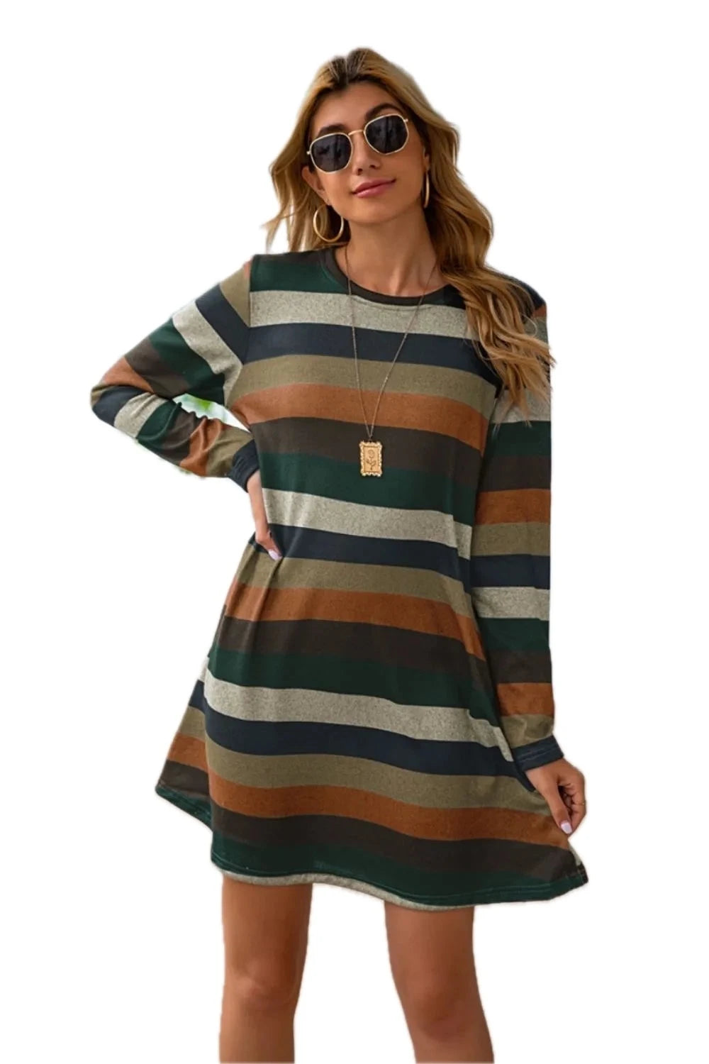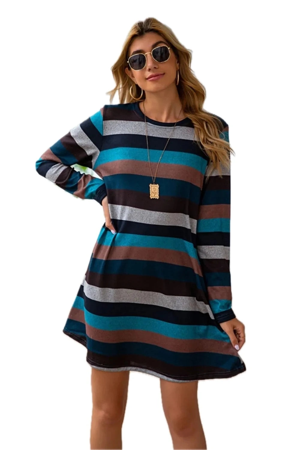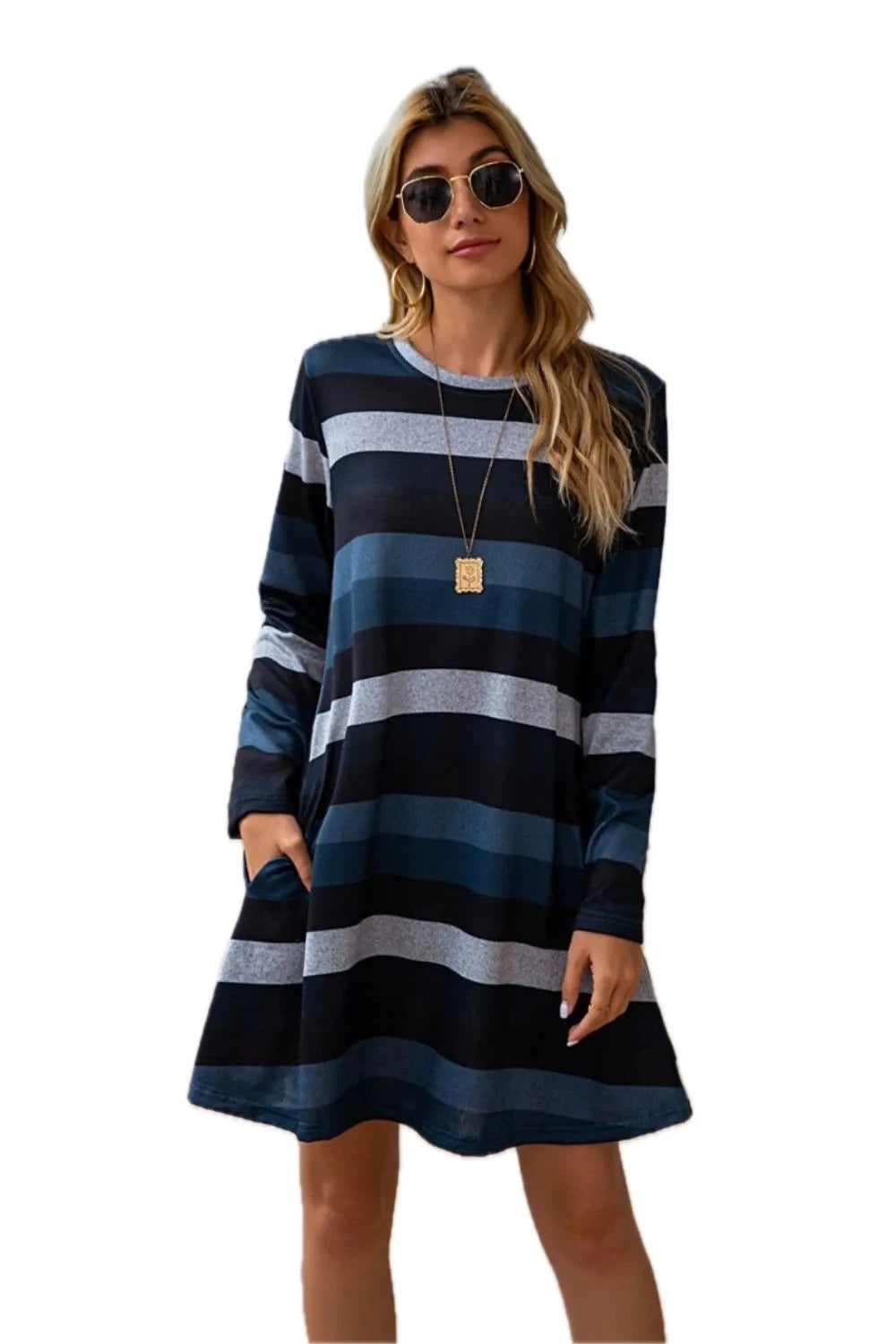 Women's Striped Round Neck Long Sleeve Dress with Subtle Sheer Look and Classic Silhouette for Everyday Wear 35% Polyester 65% Cotton Fabric Easy Care Machine Wash Cold Versatile