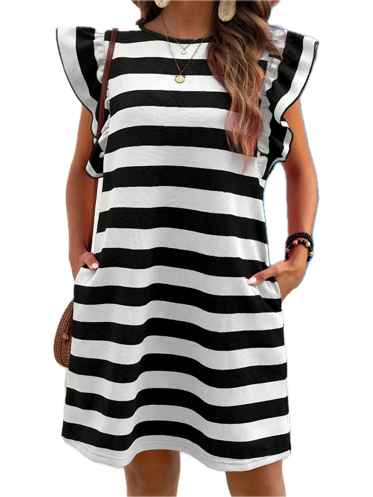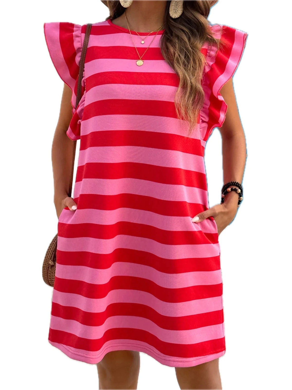 Women's Striped Ruffle Sleeve Casual Summer Dress with Pockets 100% Polyester Lightweight Everyday Travel Outfit