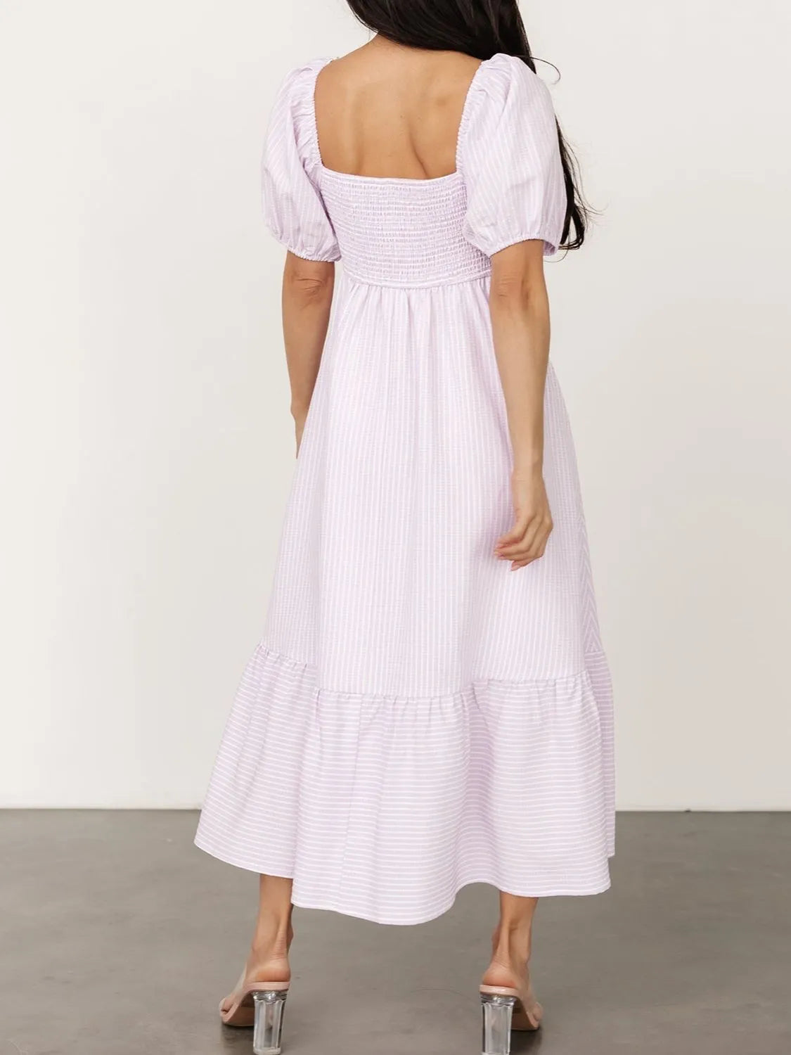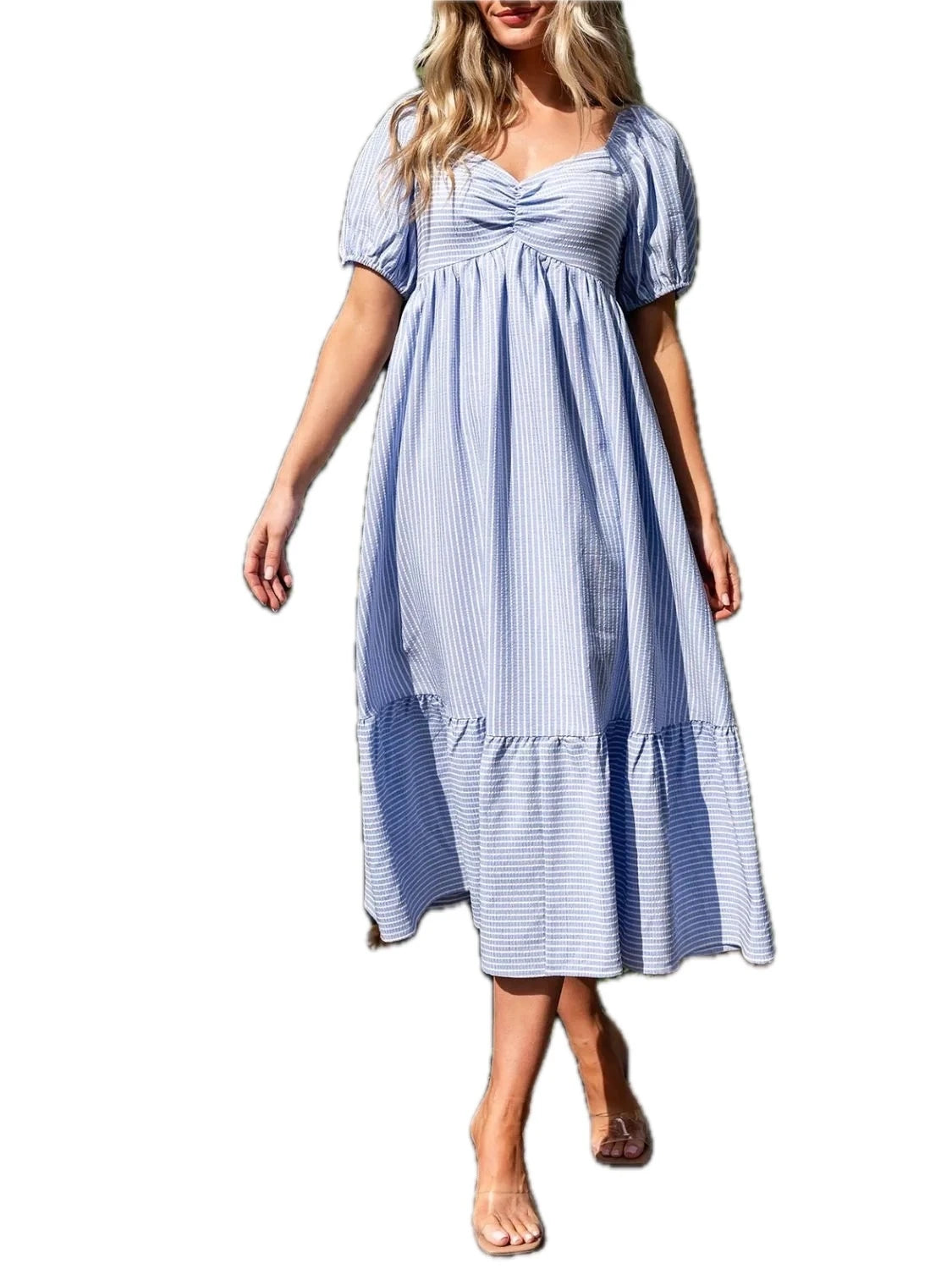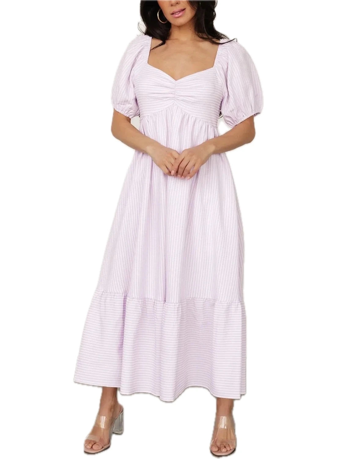 Women's Striped Sweetheart Neck Puff Sleeve Midi Dress Ruched Pocketed 95% Polyester 5% Spandex No Stretch Not Lined