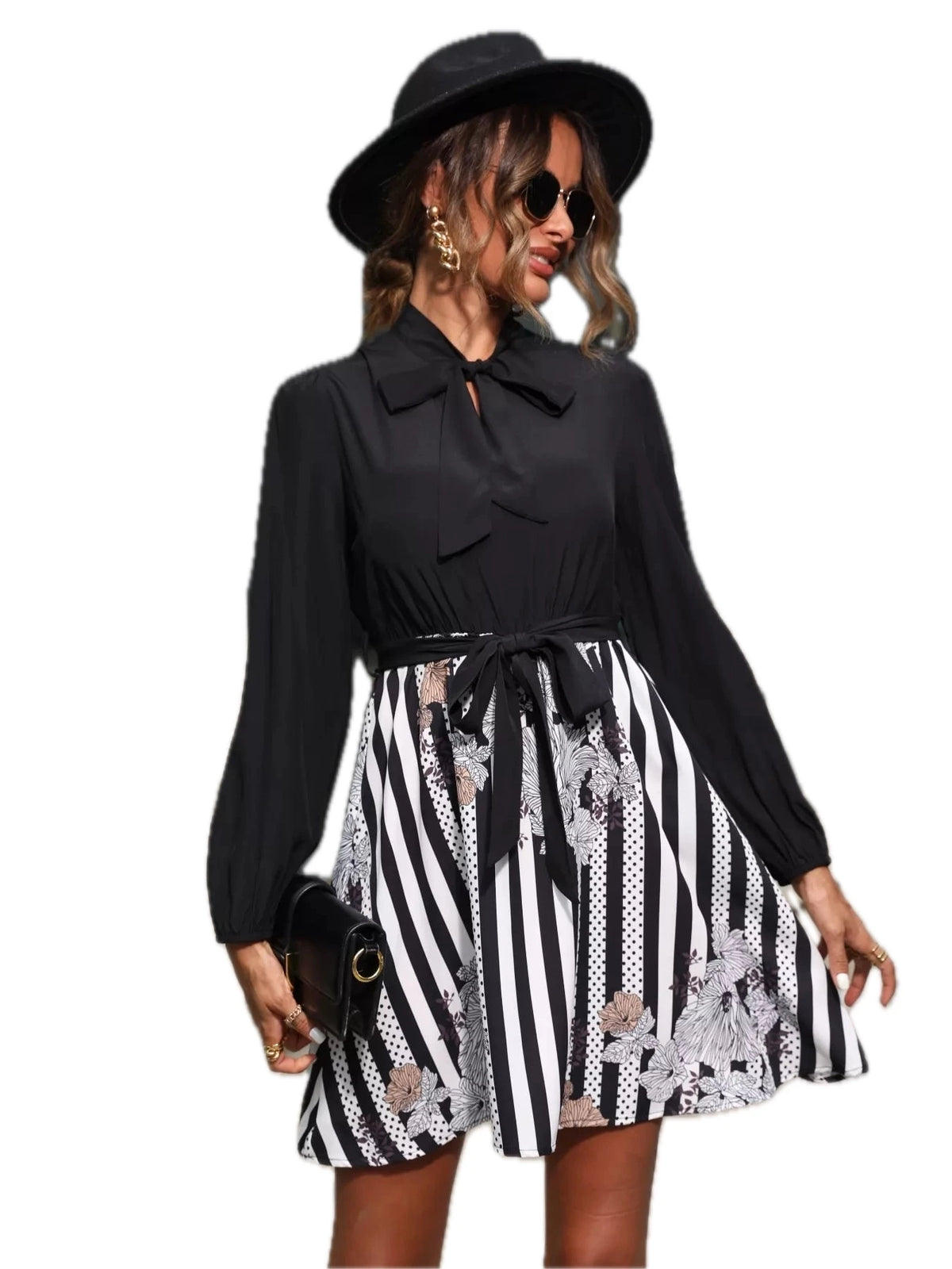 Women's Striped Tie Front Long Sleeve Mini Dress 95% Polyester 5% Spandex Easy Care Flattering Silhouette Feminine Fit