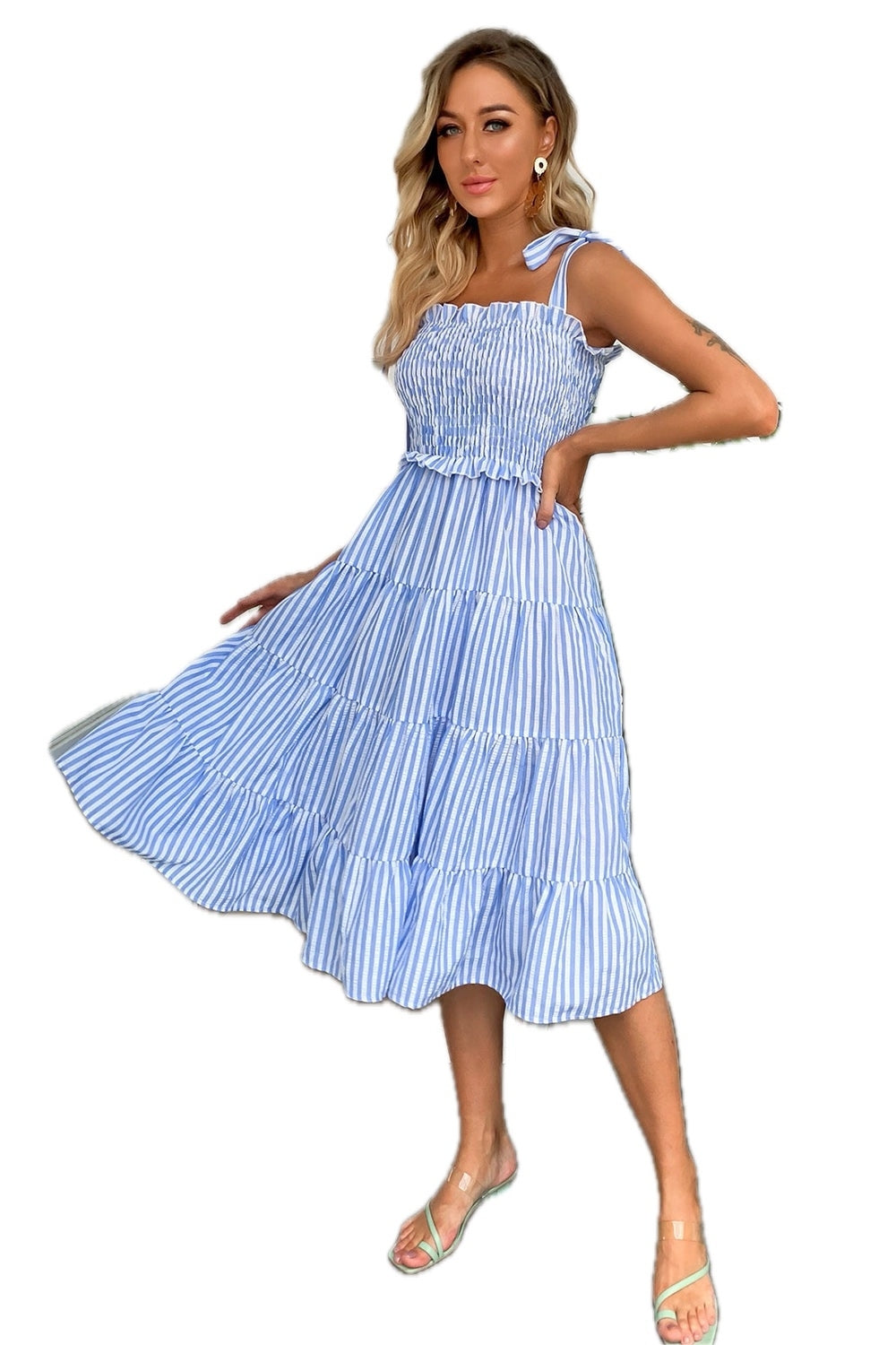 Women's Striped Tie Shoulder Tiered Dress 100% Polyester Smocked Ruffled Sheer Details Easy Everyday Wear Lightweight