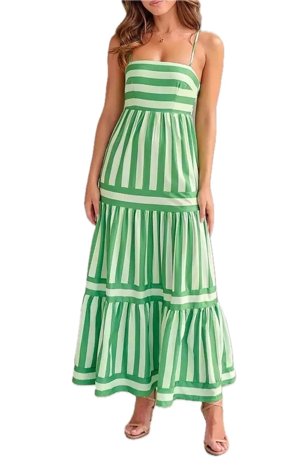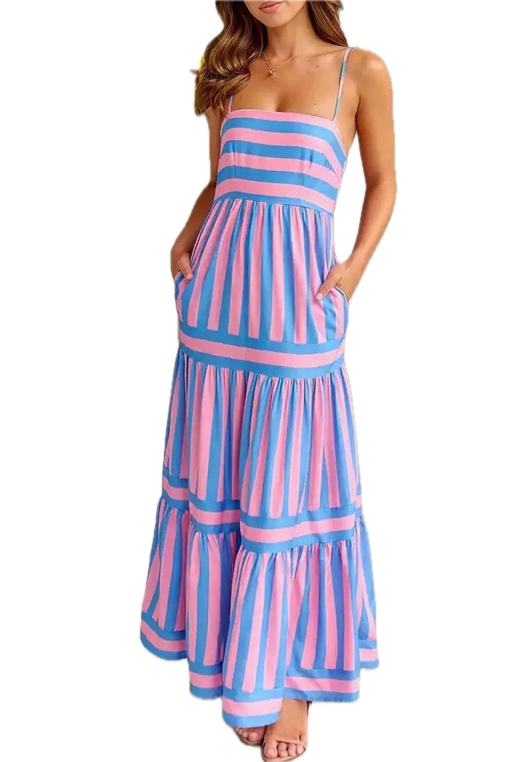 Women's Striped Tiered Maxi Cami Dress with Pockets Ruched Smocked 95% Polyester 5% Elastane for Summer Casual Edition