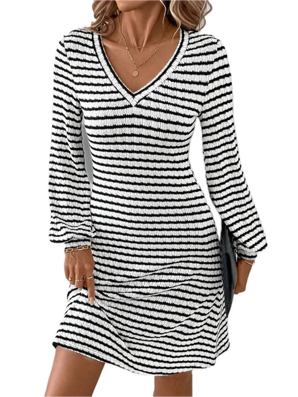 Women's Striped V Neck Dress with Stretch ninety five percent polyester five percent spandex Machine Washable