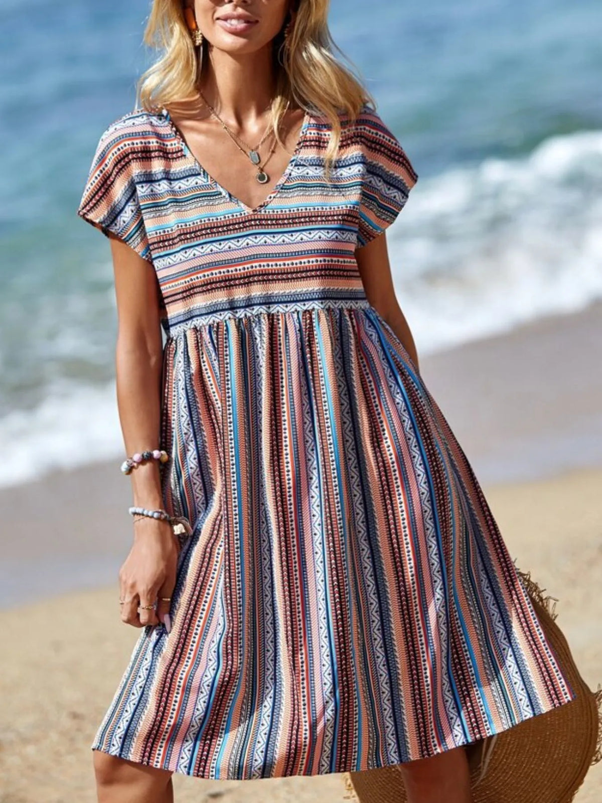 Women's Striped V Neck Short Sleeve Dress for Everyday Wear with Classic Silhouette 100% Polyester Fabric Easy Care
