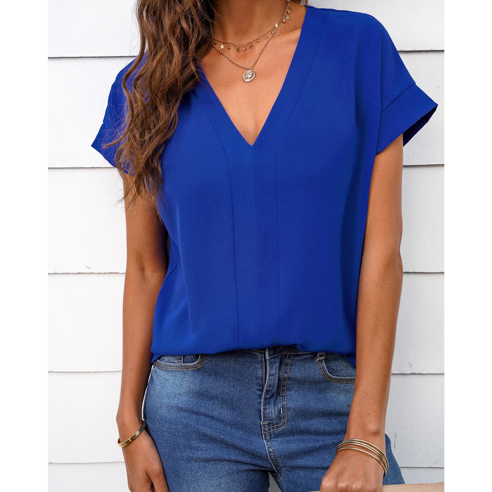 - Neckline & Fit: V-neck with short sleeves and a relaxed loose cut for comfortable movement and airflow.