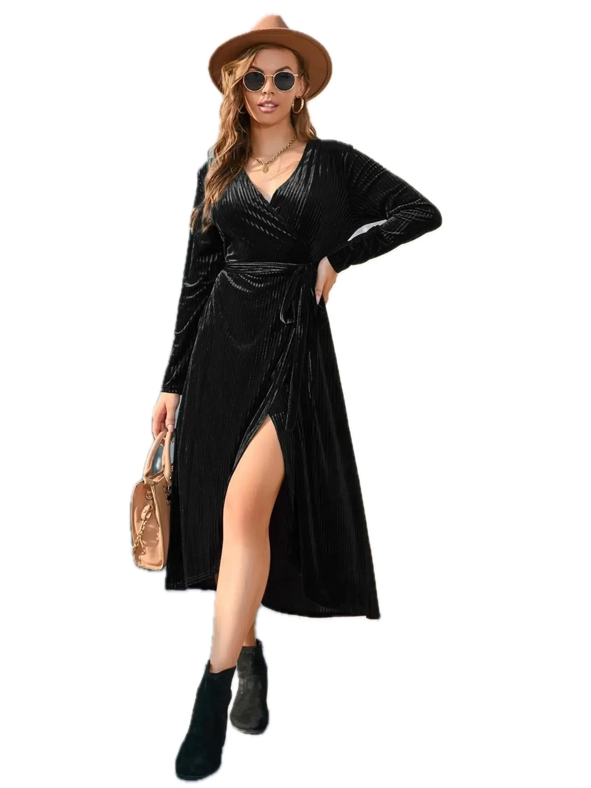 This sophisticated Surplice Long Sleeve Midi Dress features premium black velvet fabric that offers both luxury and comfort. The wrap-style surplice neckline creates a flattering V-neck silhouette while the long sleeves provide elegant coverage. The midi length with side slit adds movement and allure. The adjustable tie waist allows for a customized fit that accentuates the waistline. Perfect for both casual and dressy occasions, this dress combines timeless elegance with modern style. The stretch velvet material ensures comfort throughout the day while maintaining its sophisticated appearance.
