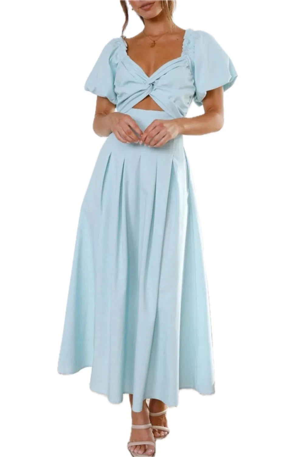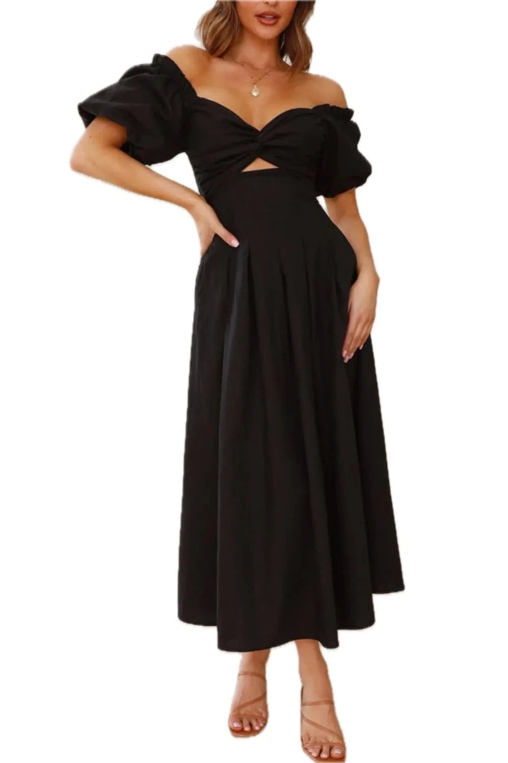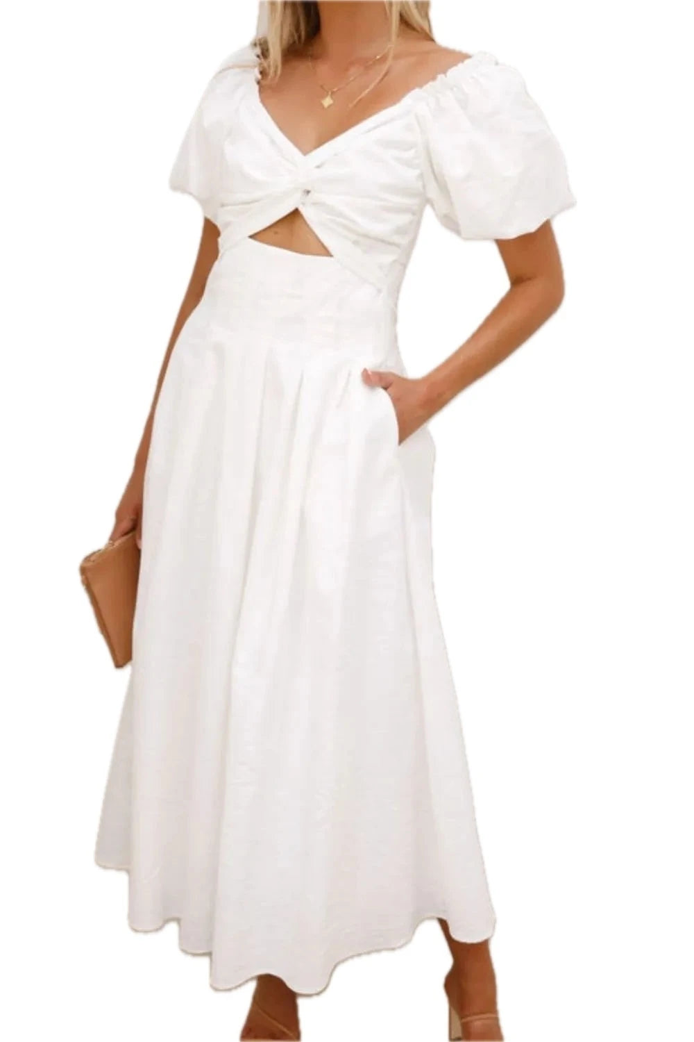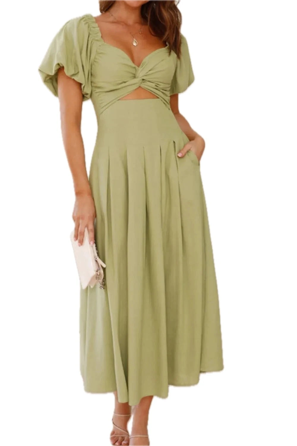 Women's Sweetheart Neck Puff Sleeve Dress with Ruched Cutout Pockets for Everyday Wear Flattering Fit 100% Cotton