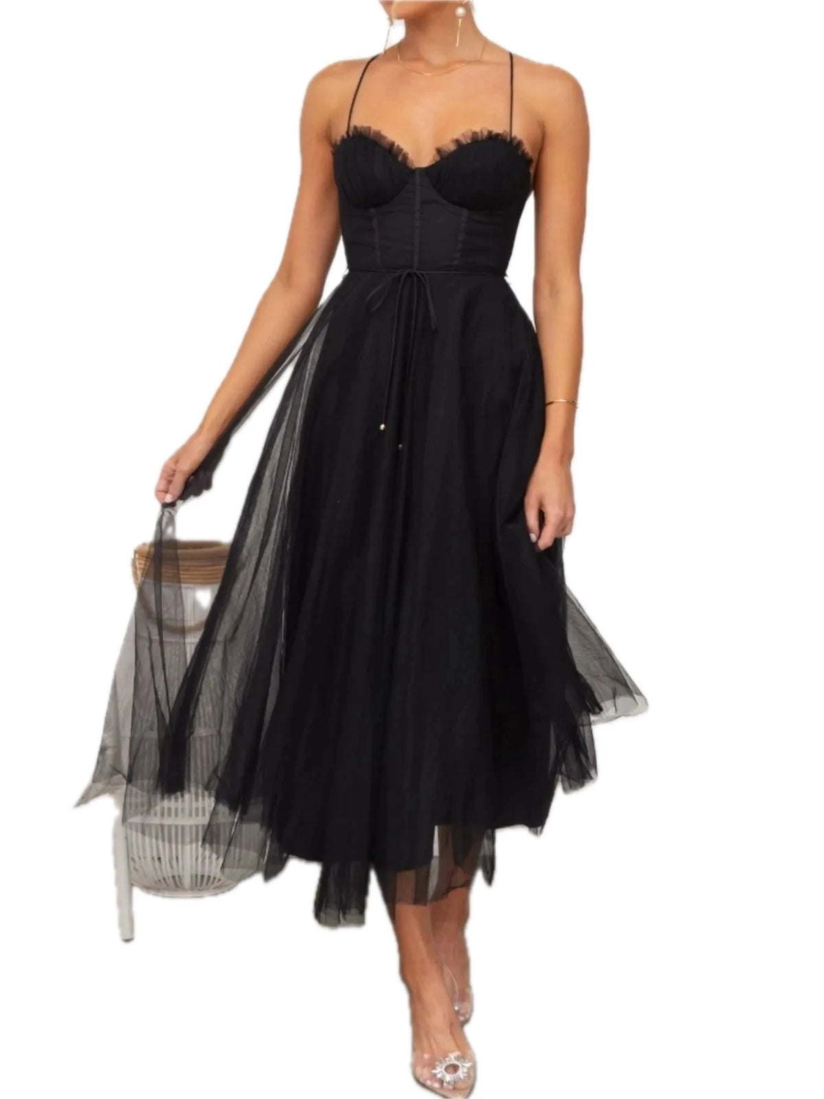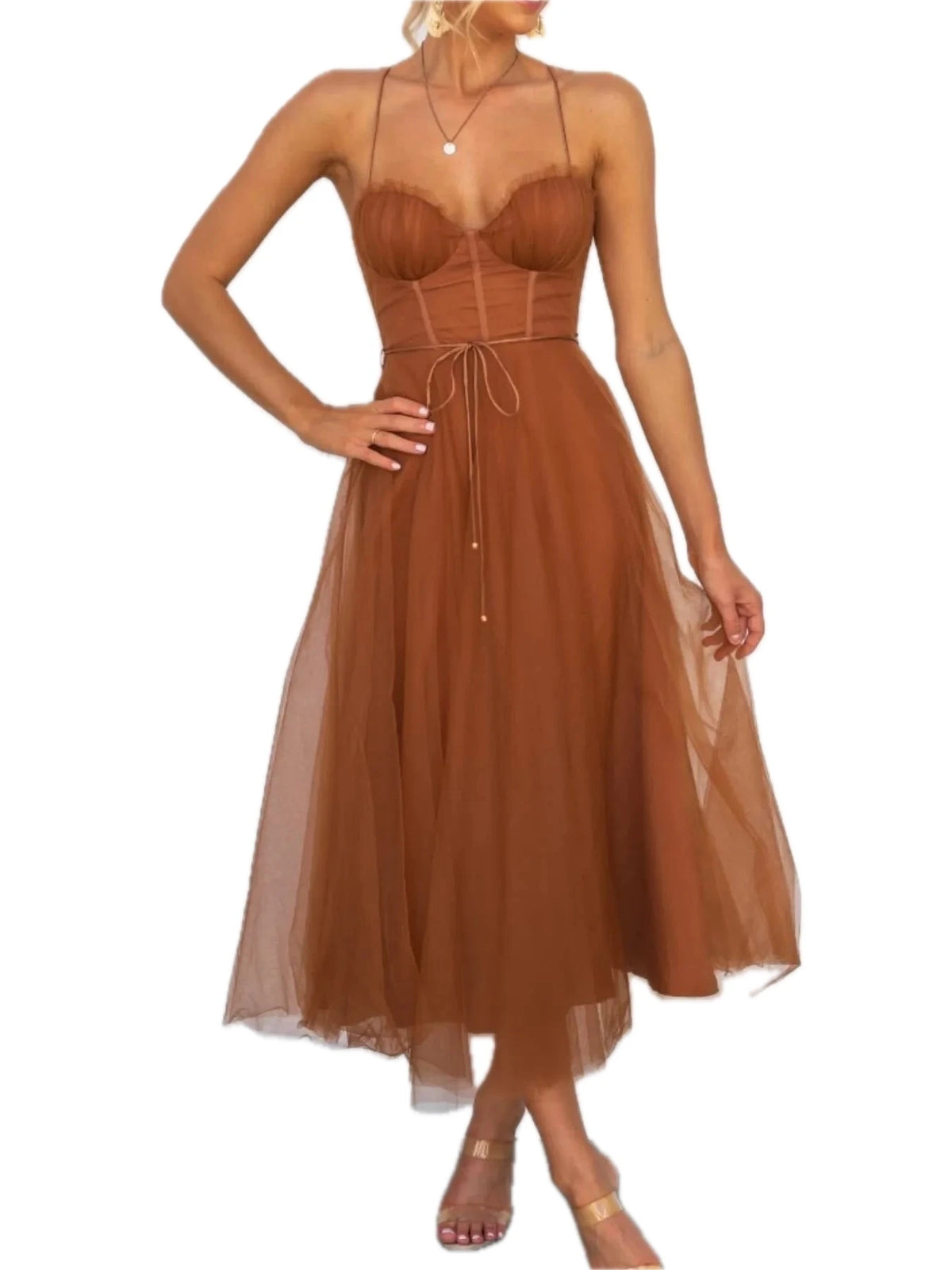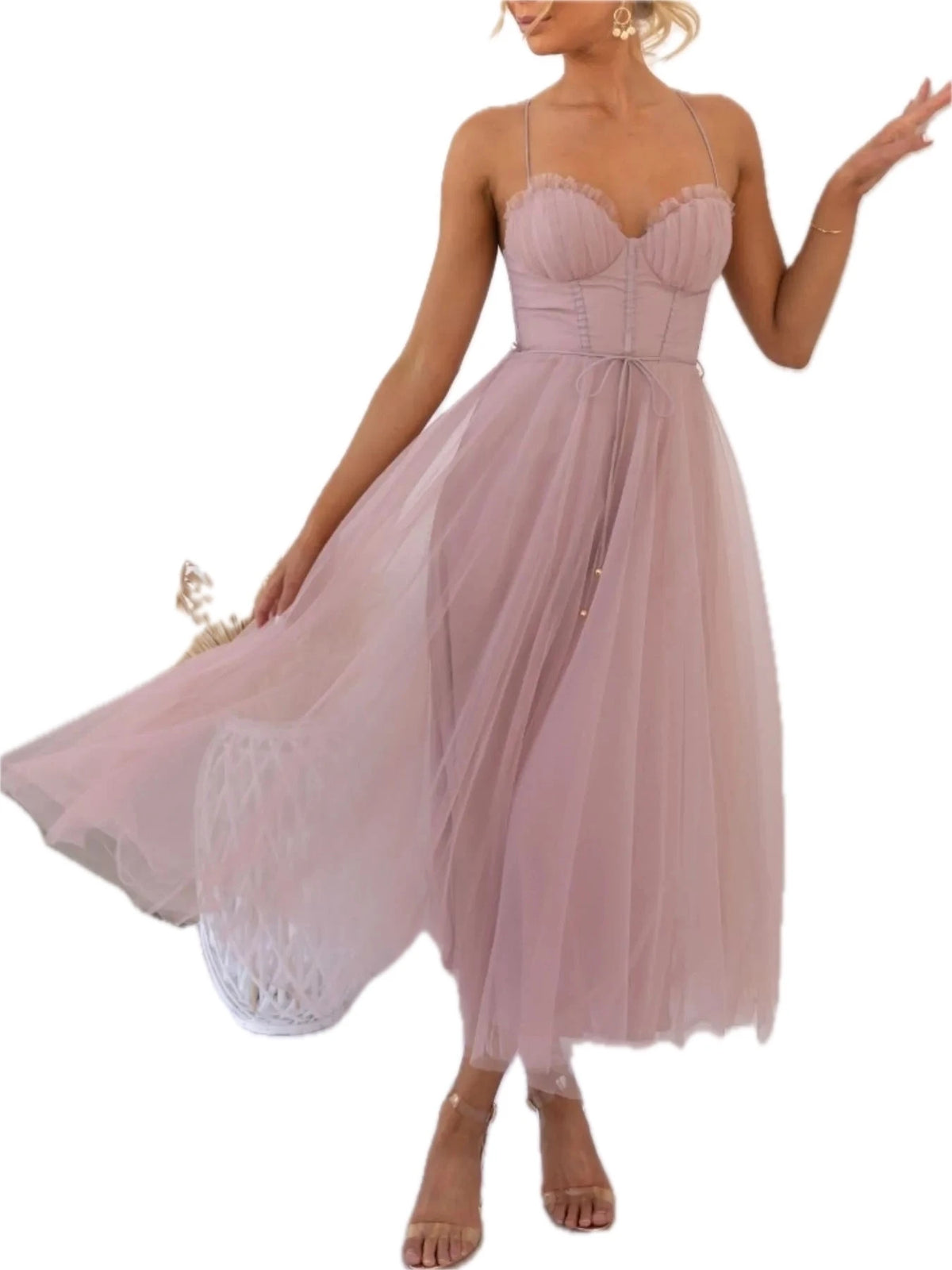 Women's Sweetheart Neck Tulle Midi Dress 100% Polyester Lined Crisscross Tied Mesh Zipper Ideal Evening Formal Wear
