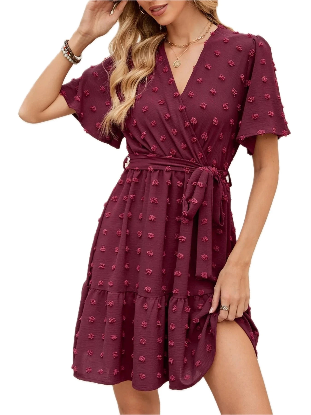 Womens Swiss Dot Flutter Sleeve Wrap Dress with Tie Waist 100% Polyester Fabric for Flowy Comfortable Fit Everyday