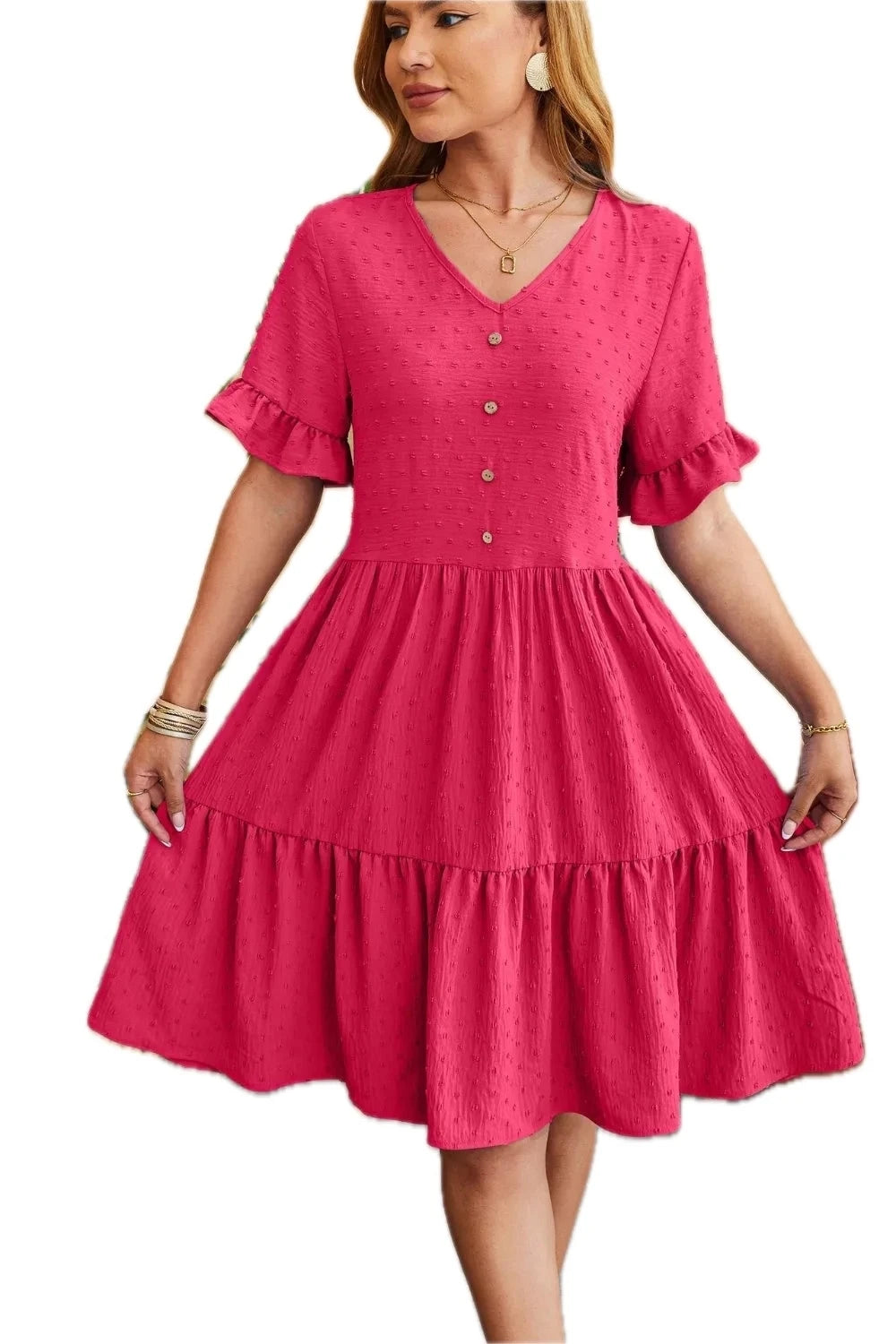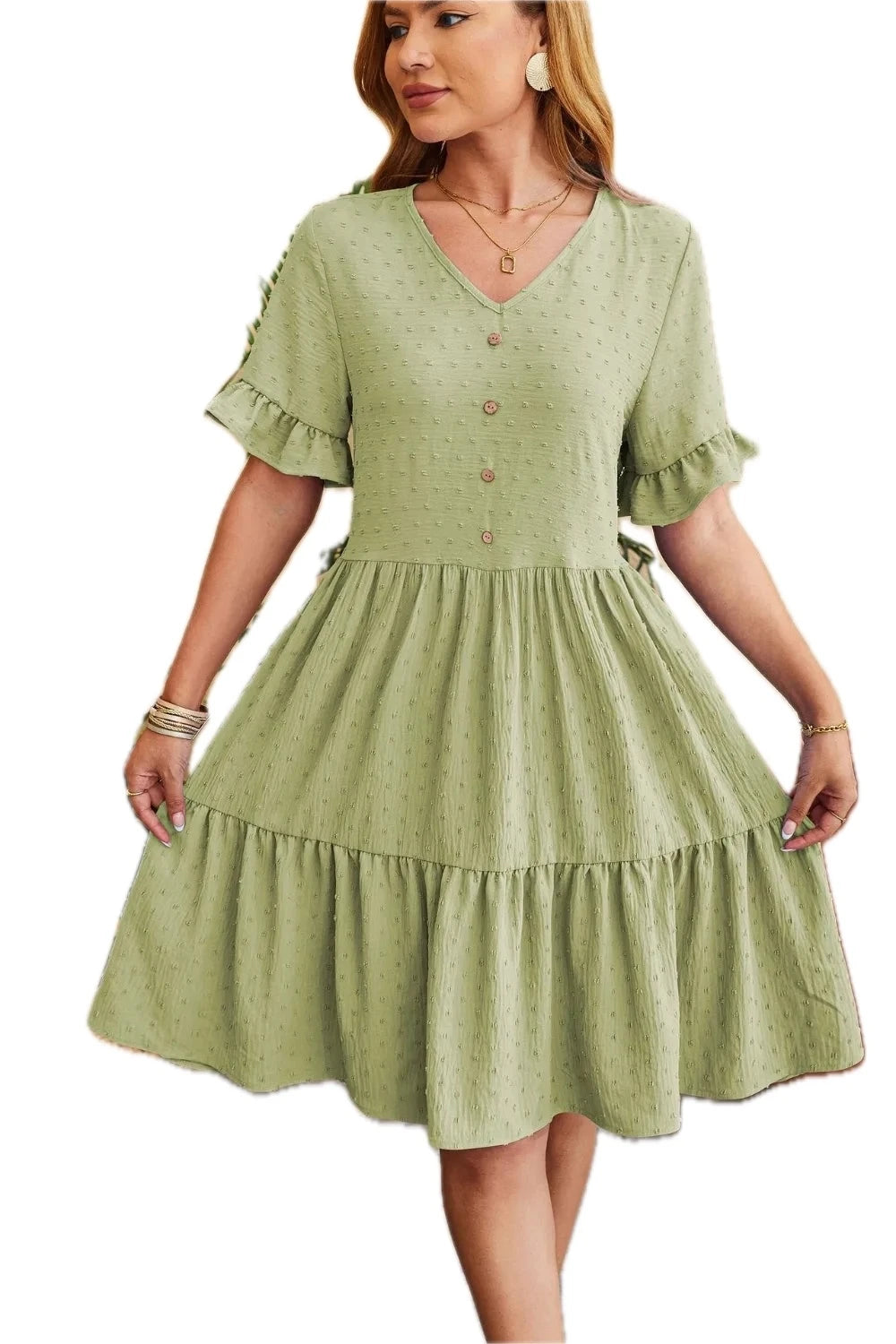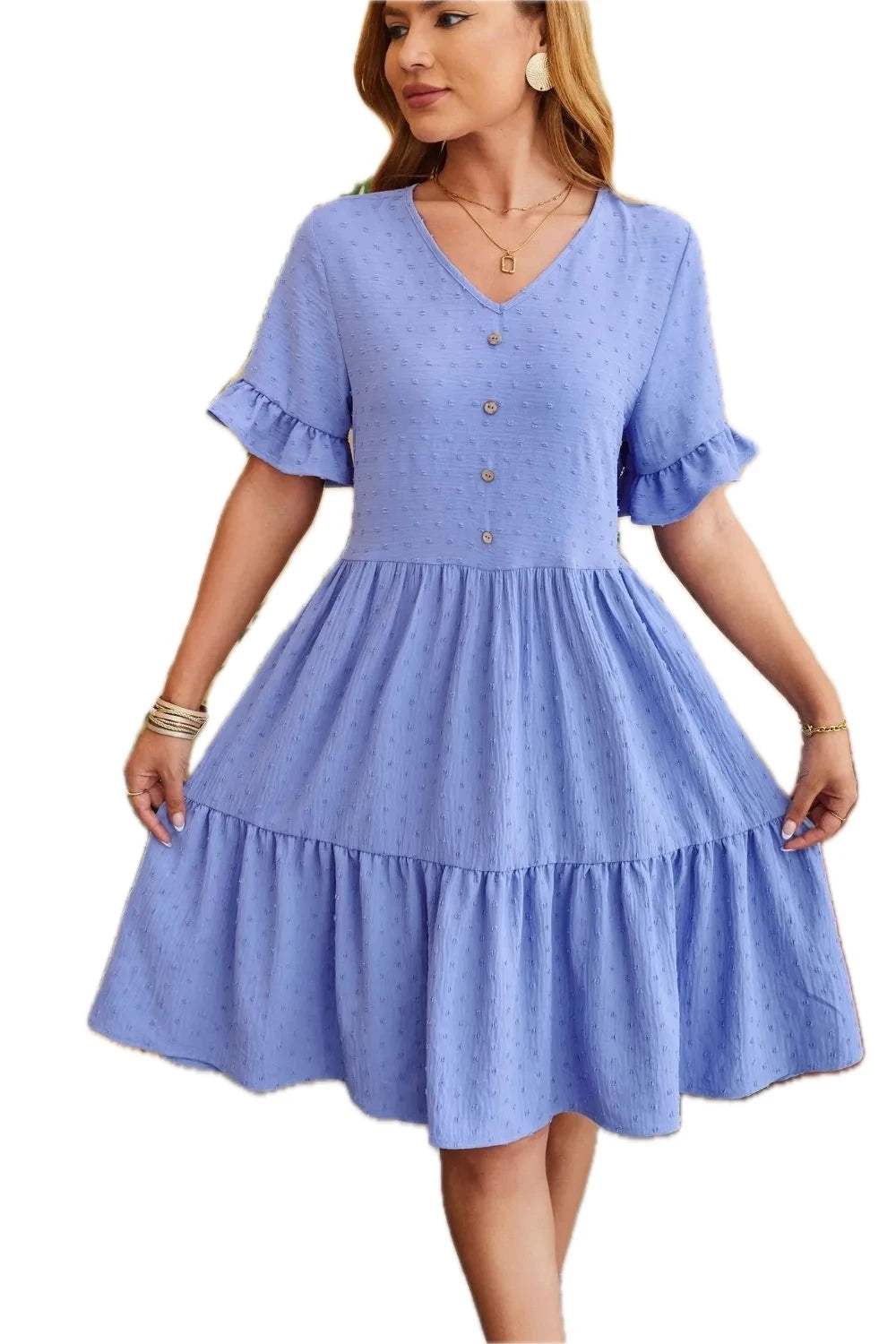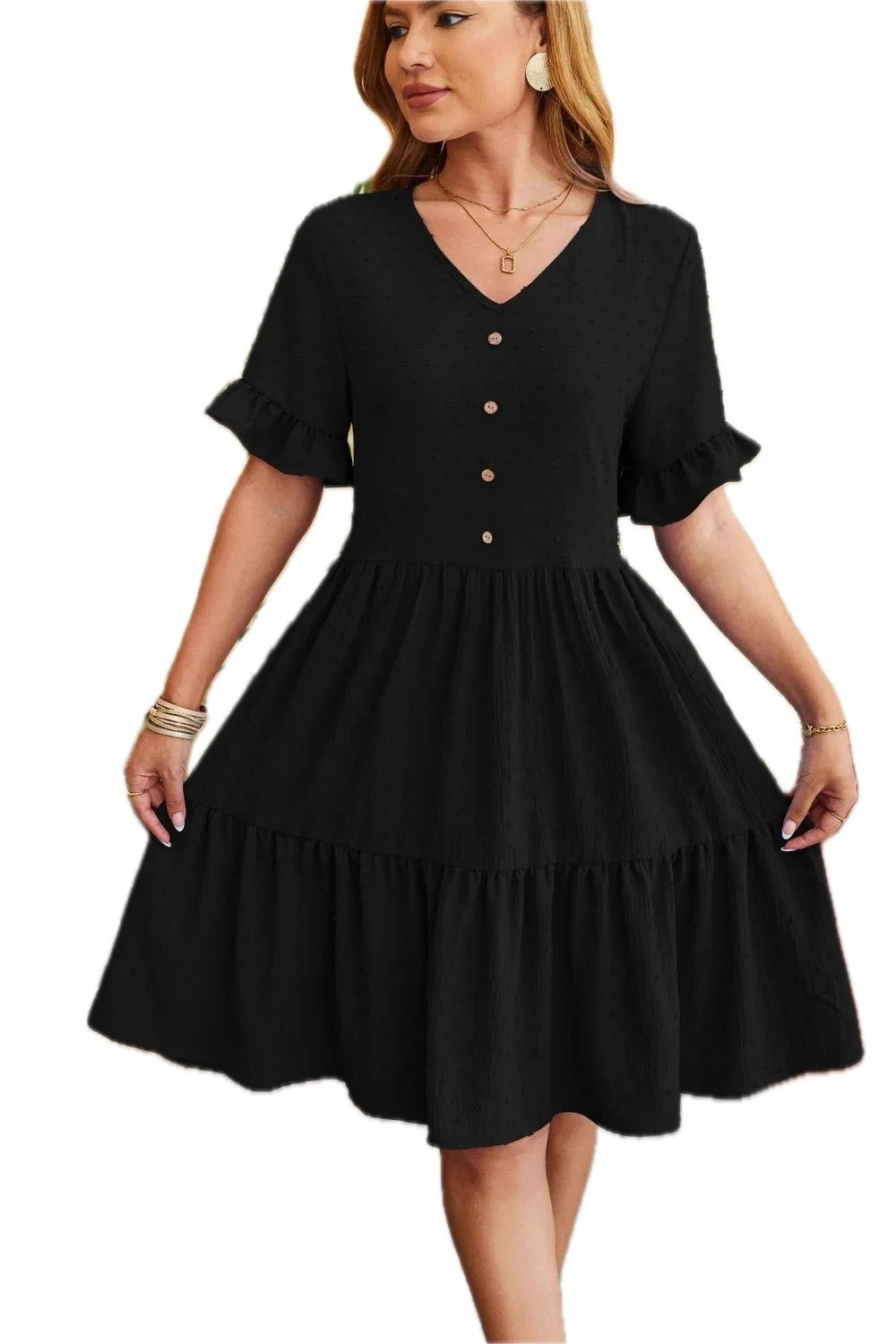 Women's Swiss Dot Ruffled V Neck Tiered Dress with Sheer Overlay 100% Polyester Fabric for Elegant Occasion Party