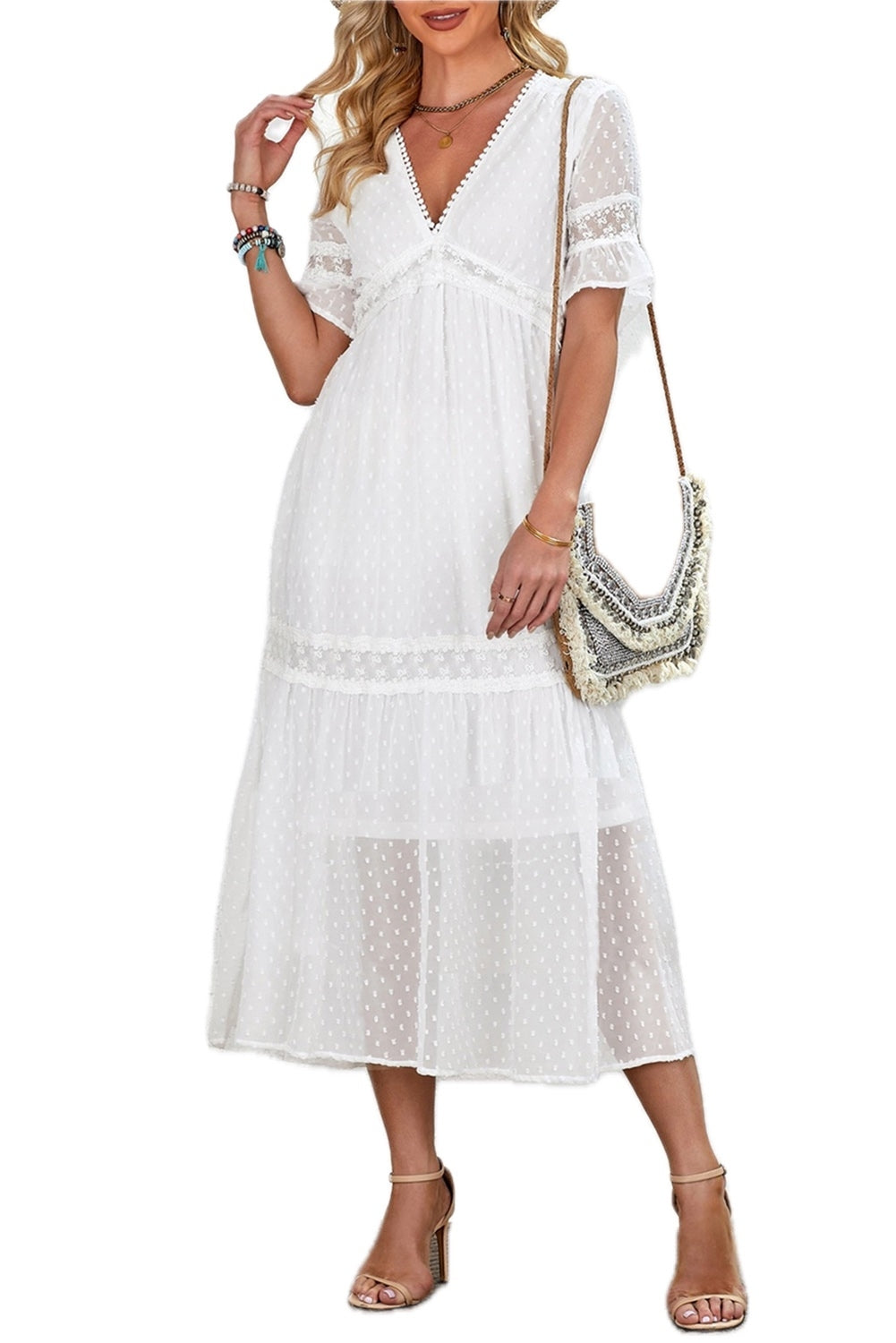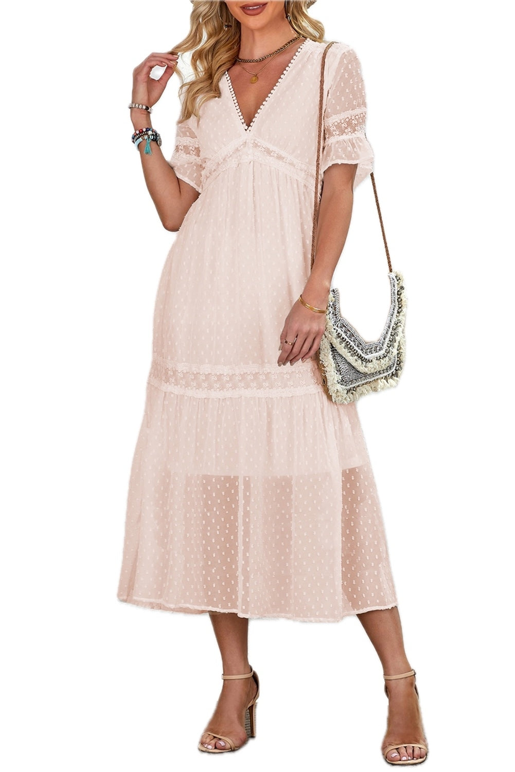 Women's Swiss Dot V Neck Short Sleeve Midi Dress Lined Body 100% Polyester Fabric for Elegant Everyday Wear Style