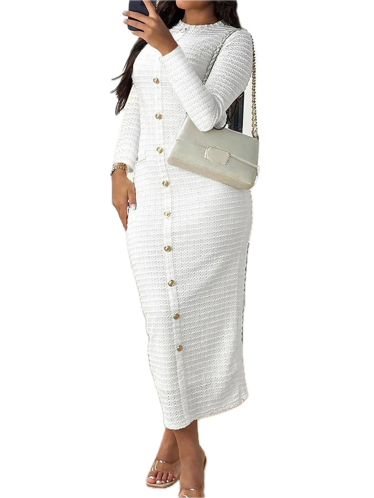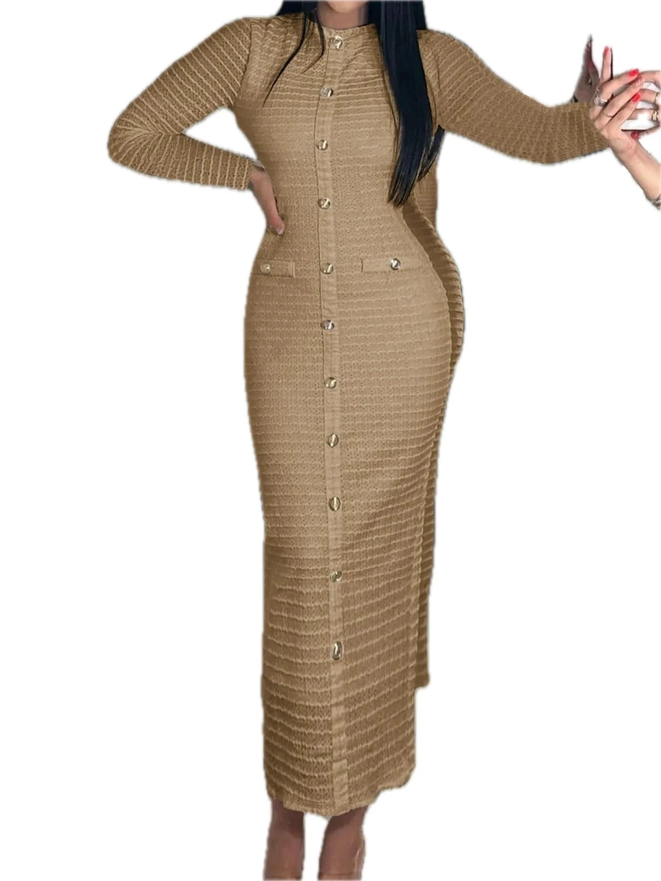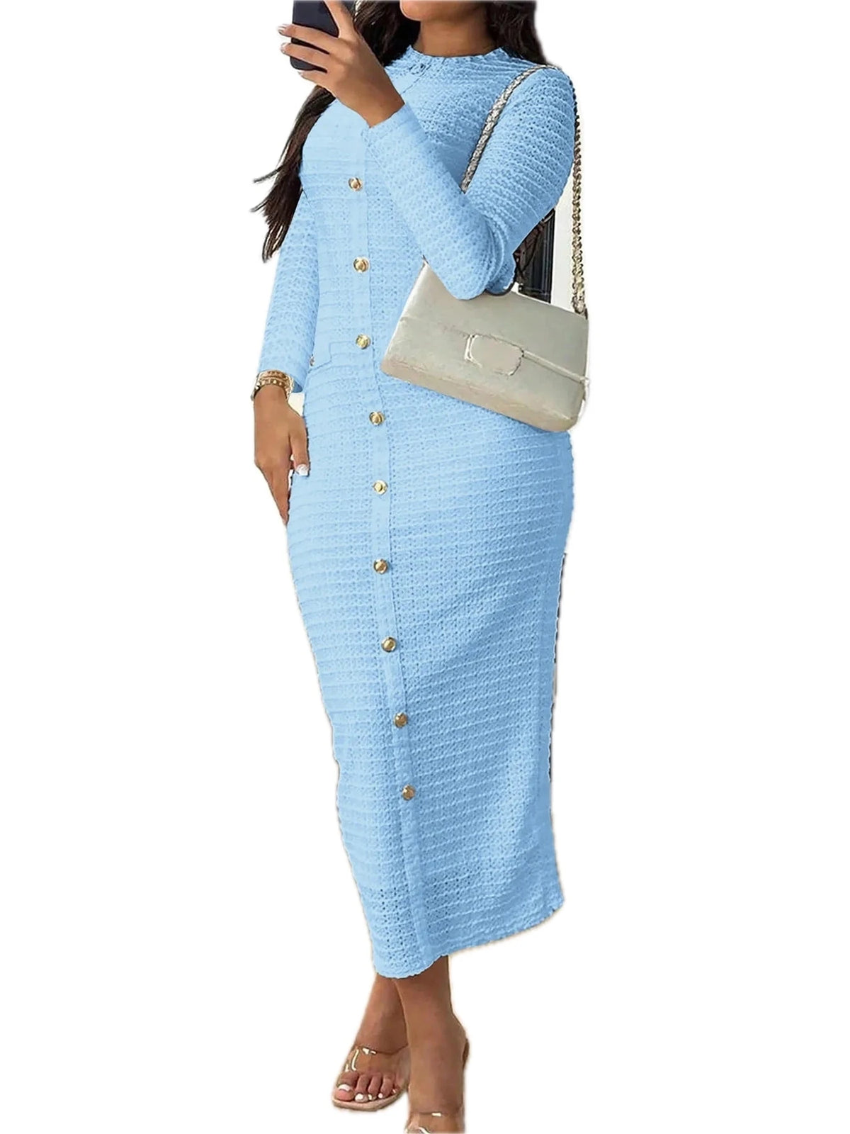 Women's Textured Long Sleeve Midi Dress Buttoned Stretch Bodice Lined Day to Night Wear 95% Polyester 5% Elastane