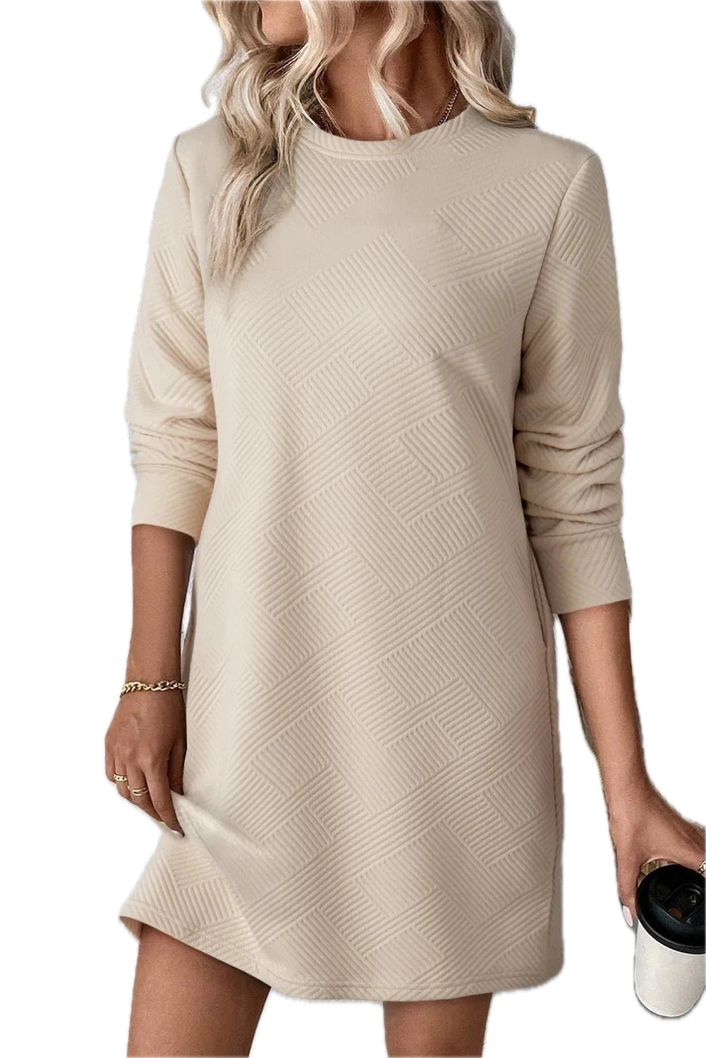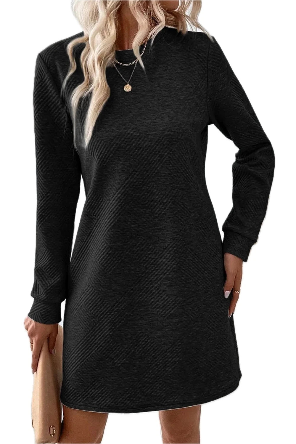 Women's Textured Round Neck Long Sleeve Mini Dress with Subtle Stretch Day to Night Wear 97% Polyester 3% Elastane Care