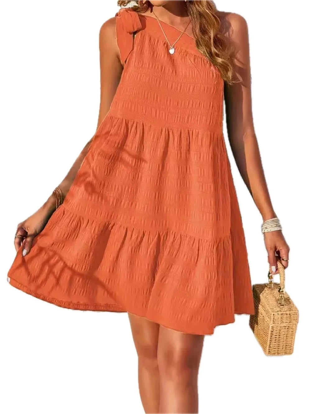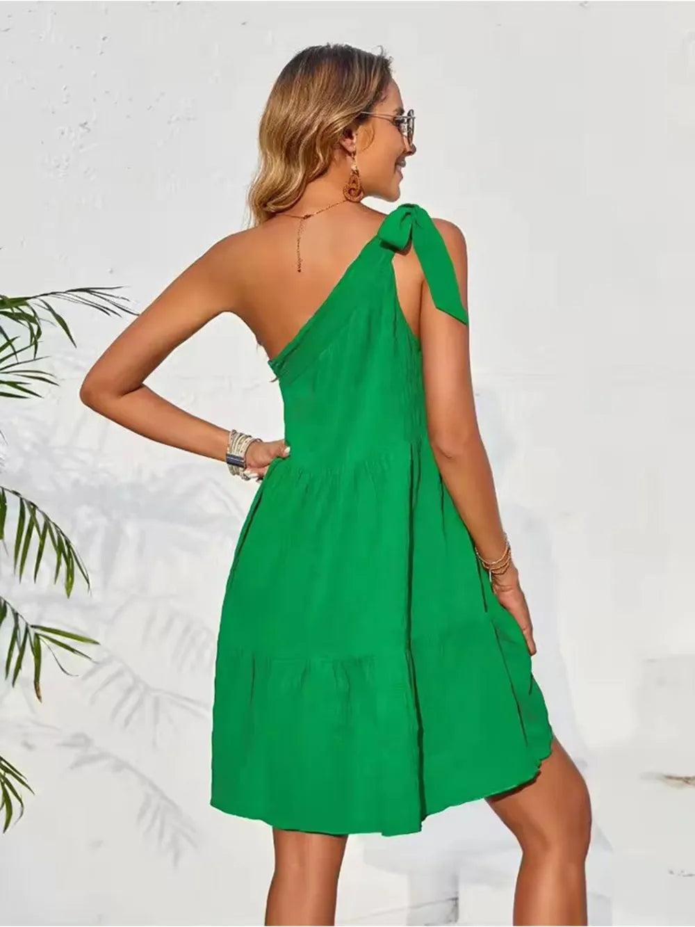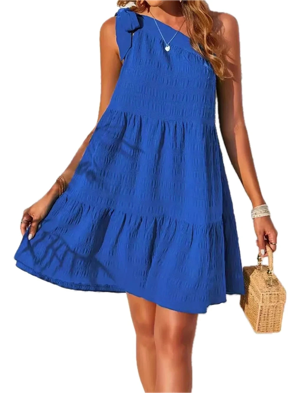 Women's Textured Tied Single Shoulder Mini Dress 95% polyester 5% spandex Sheer Detail Not Lined Elegant Silhouette