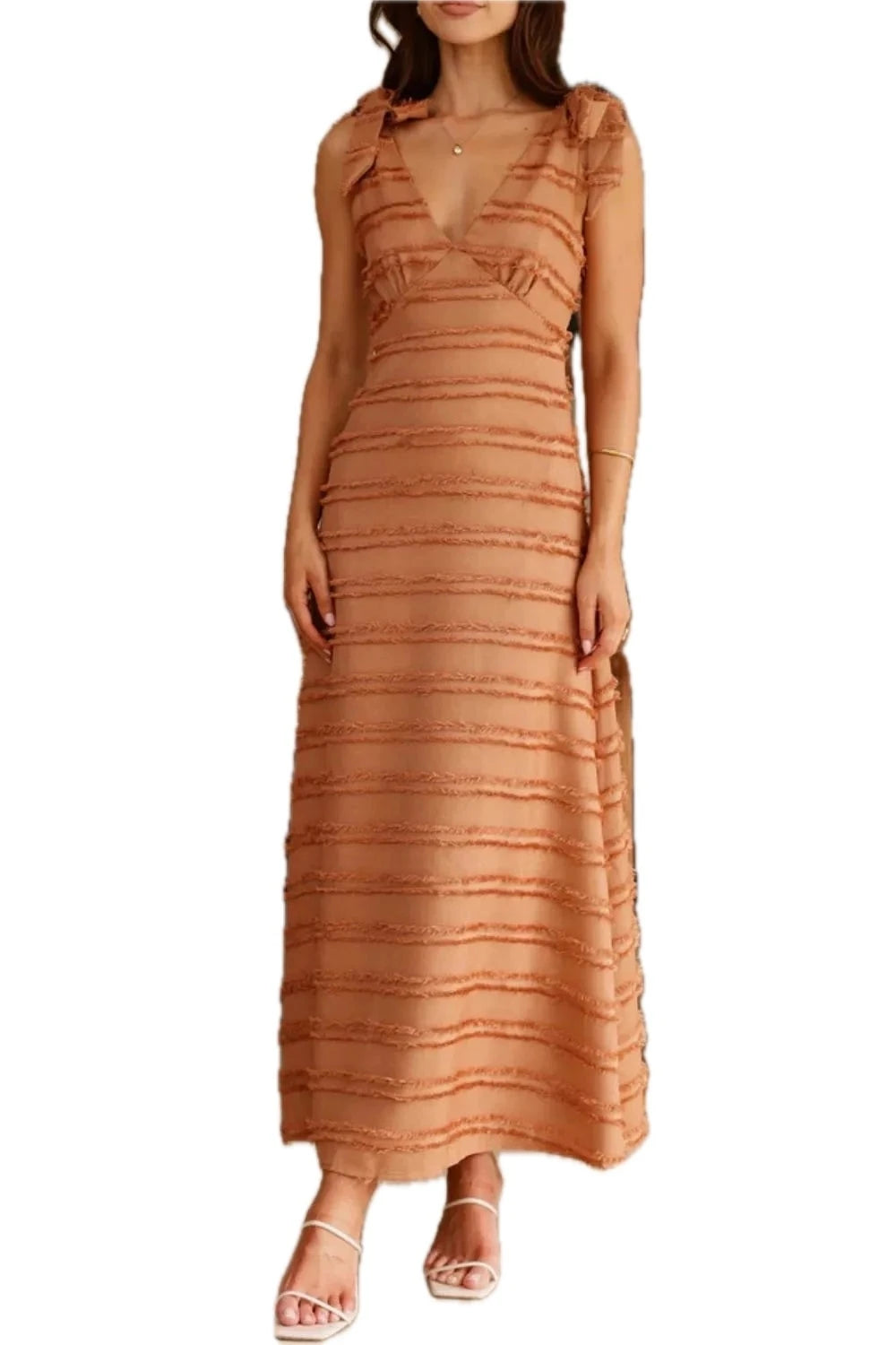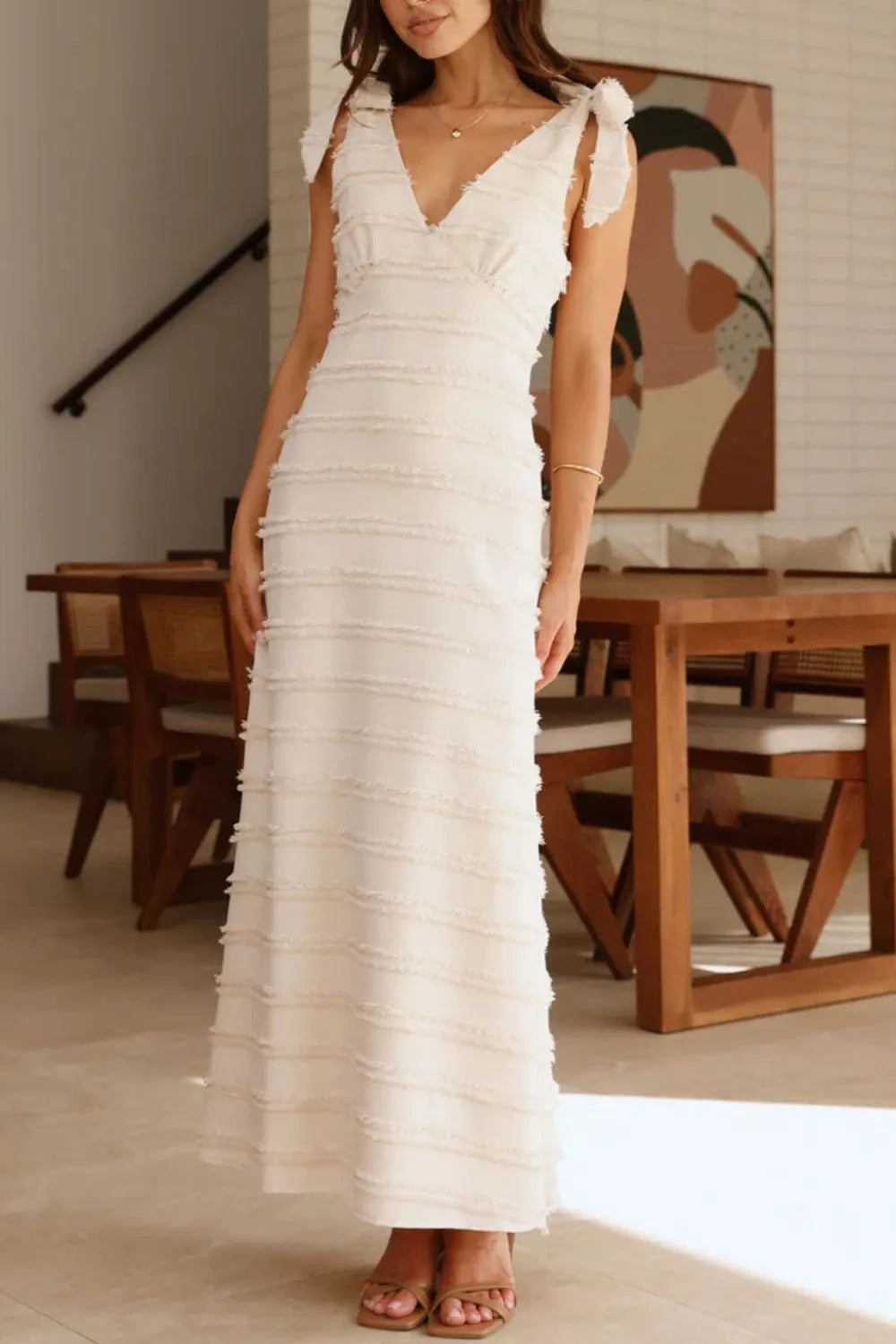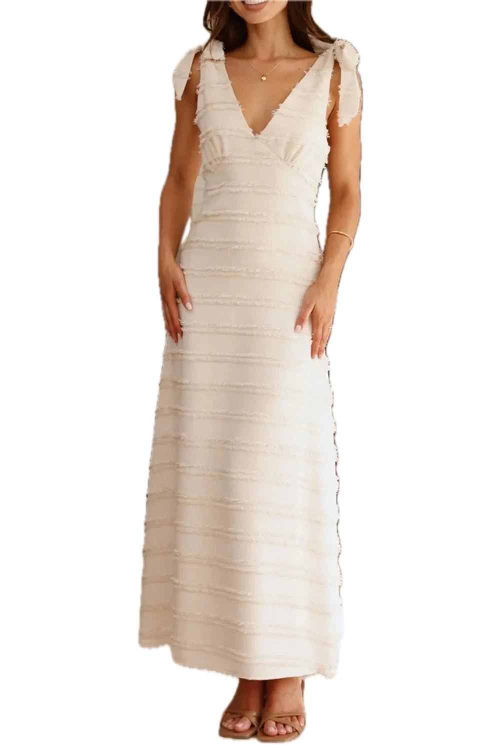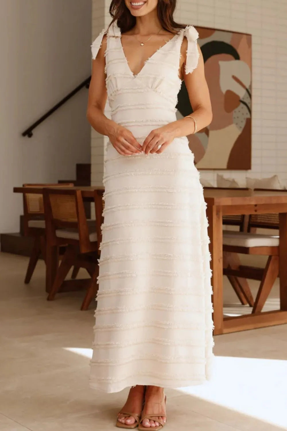 Women's Textured V Neck Tie Shoulder Dress with Bow Accent Ruched Silhouette Made of 100% Polyester Easy Care Washable