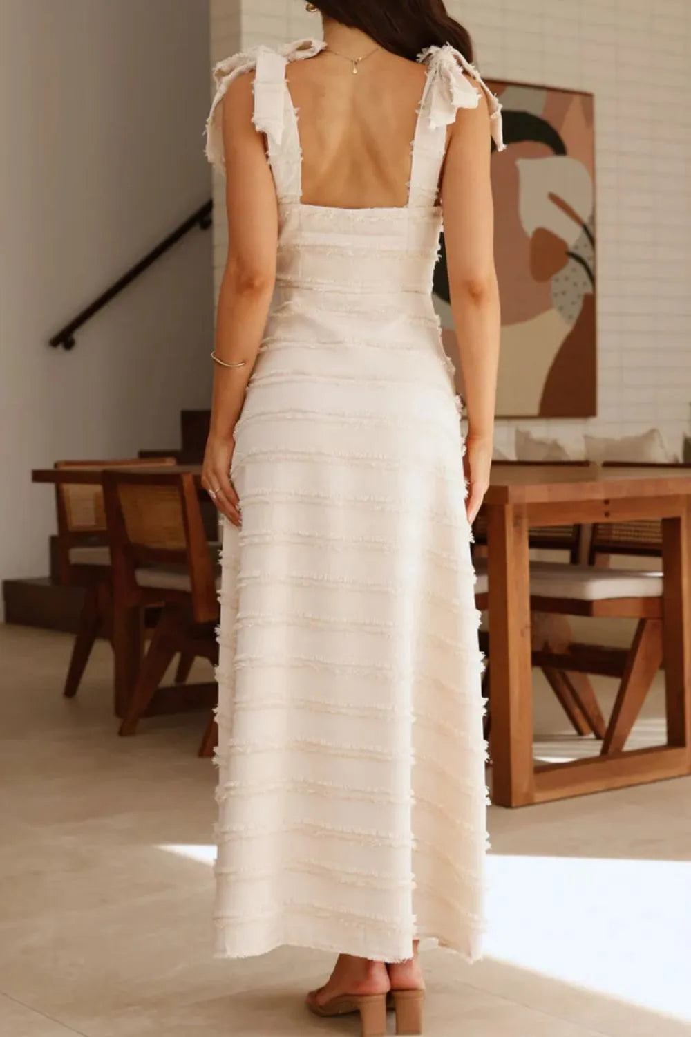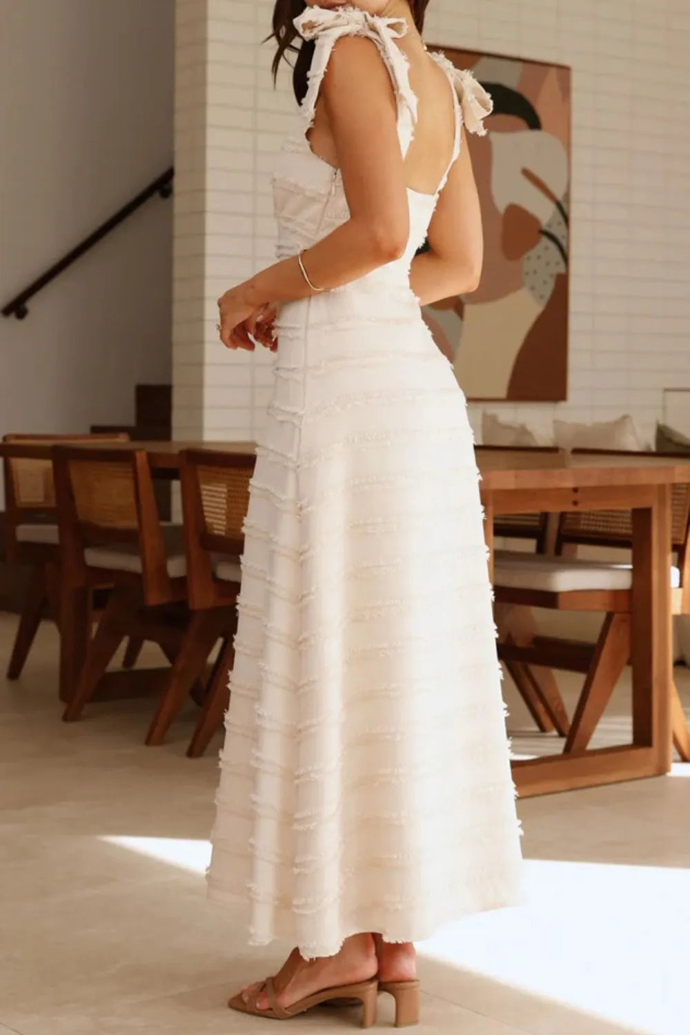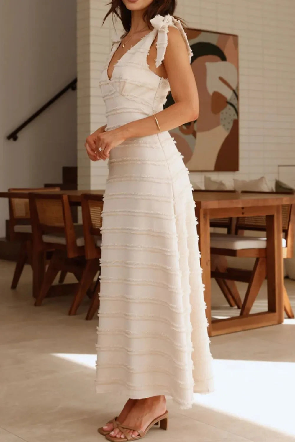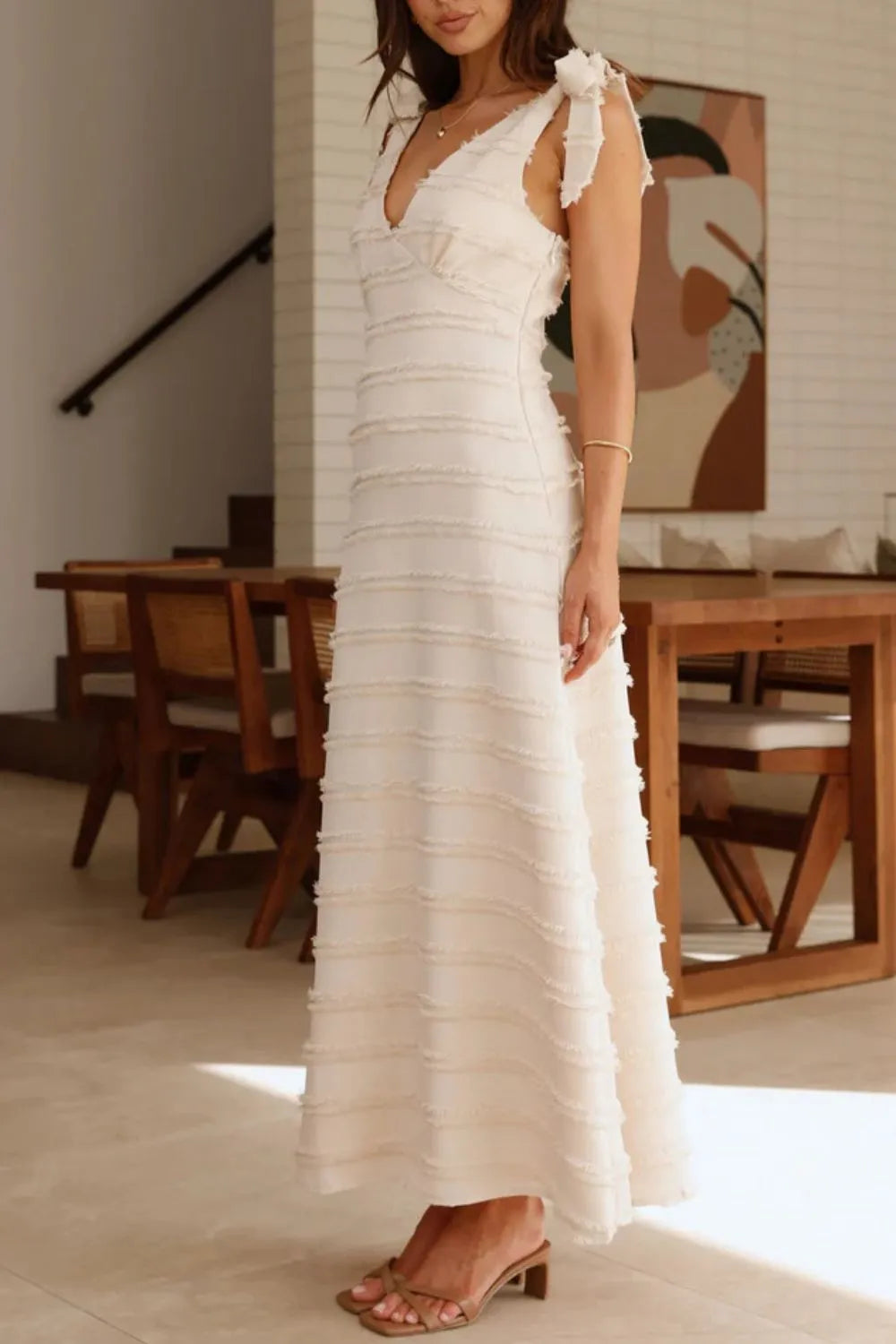 Women's Textured V Neck Tie Shoulder Dress with Bow Accent Ruched Silhouette Made of 100% Polyester Easy Care Washable