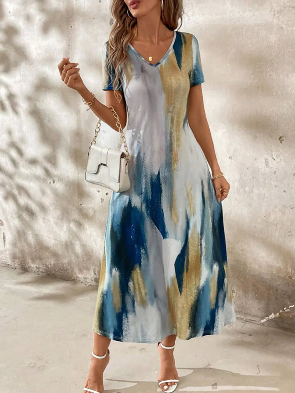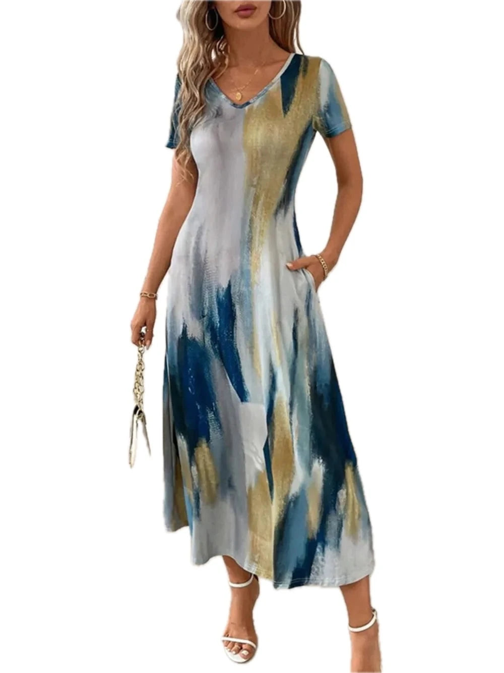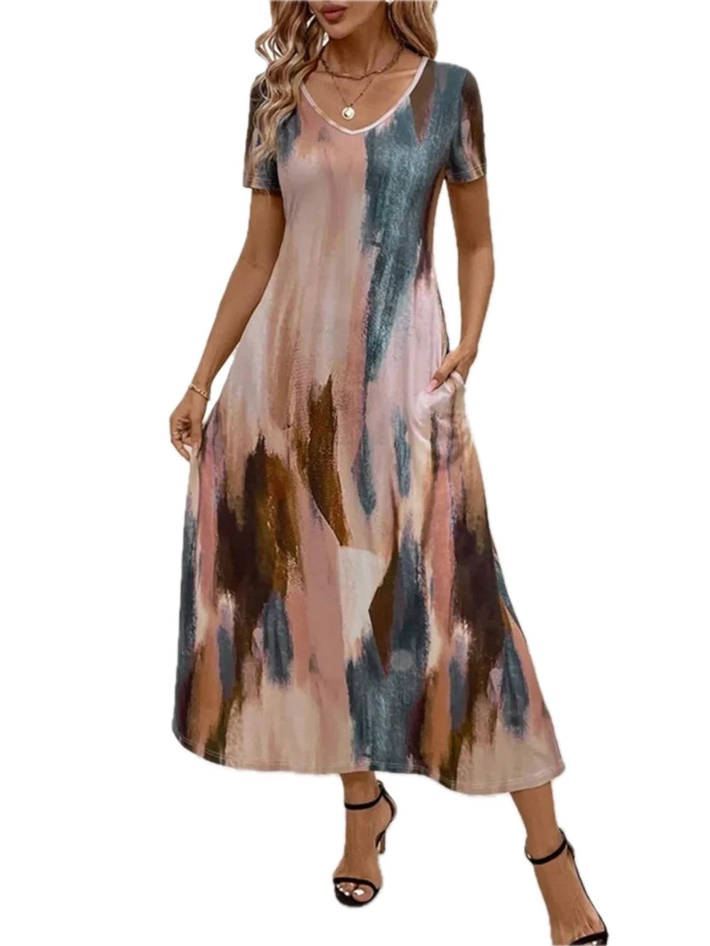 Women's Tie Dye V Neck Short Sleeve Midi Tee Dress with Pockets Sheer Stretch Fabric 95% Polyester 5% Spandex