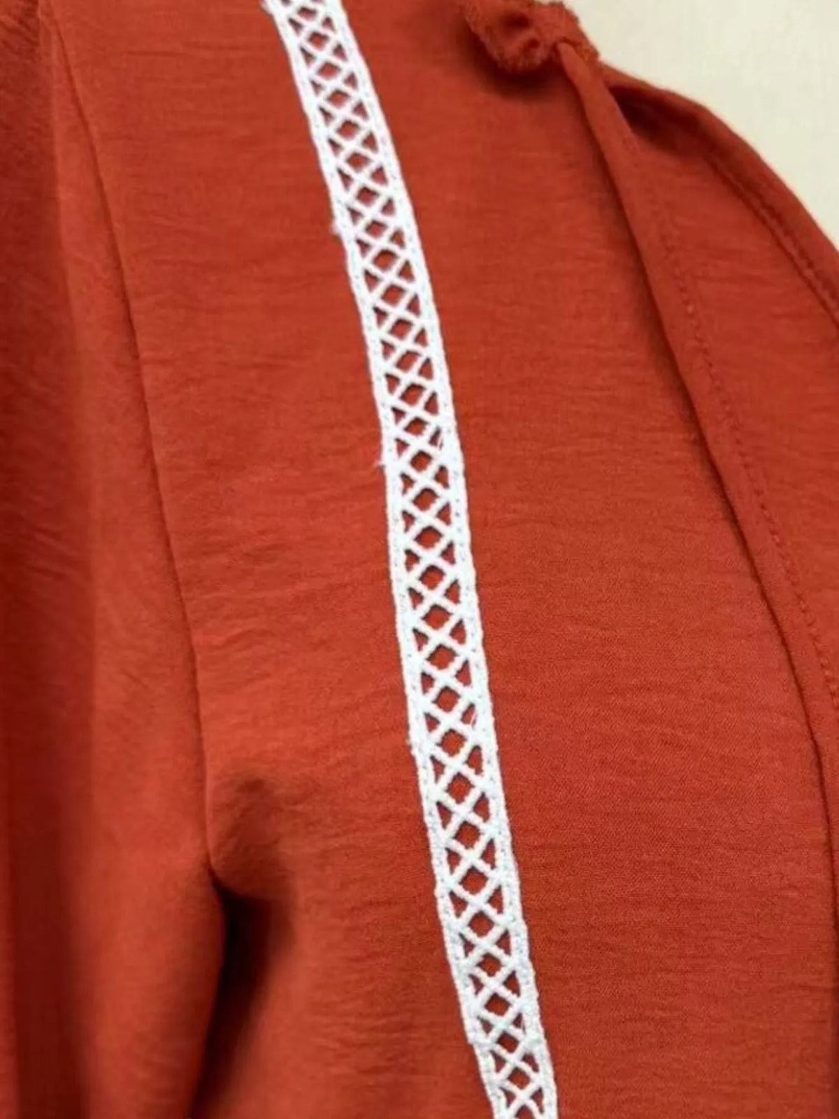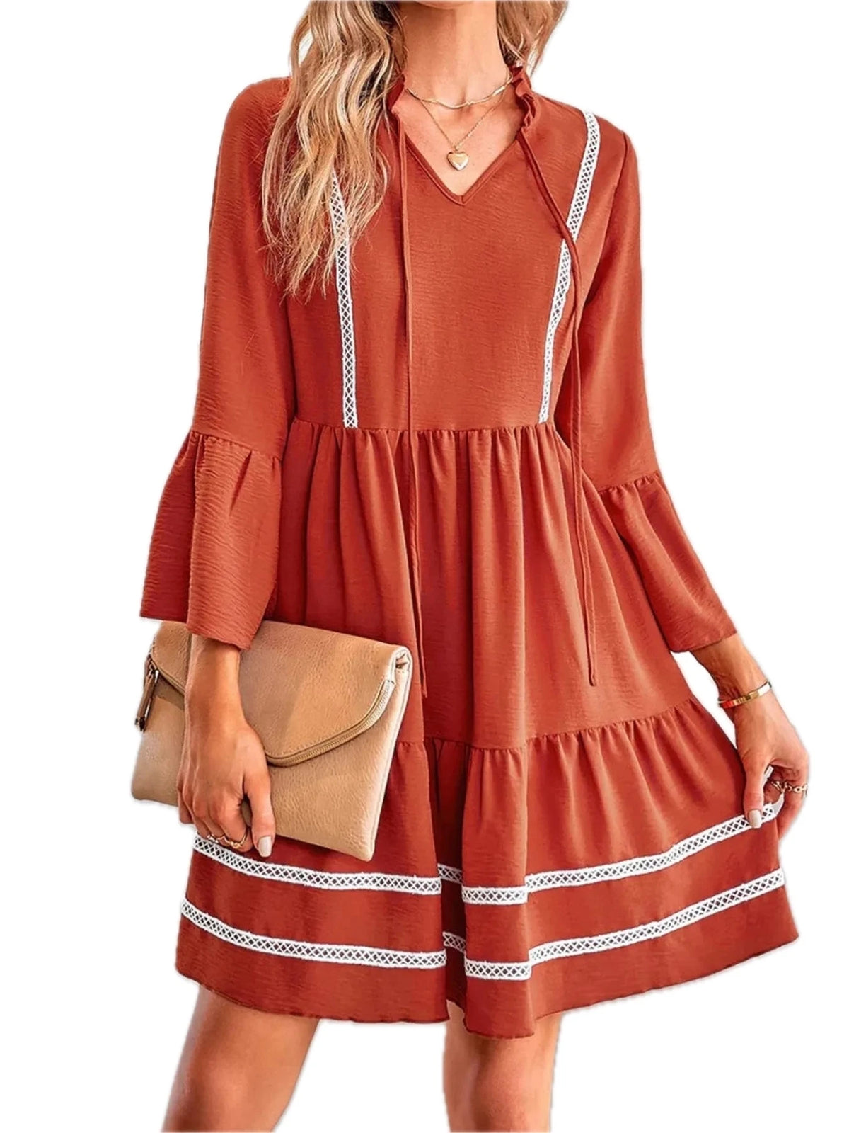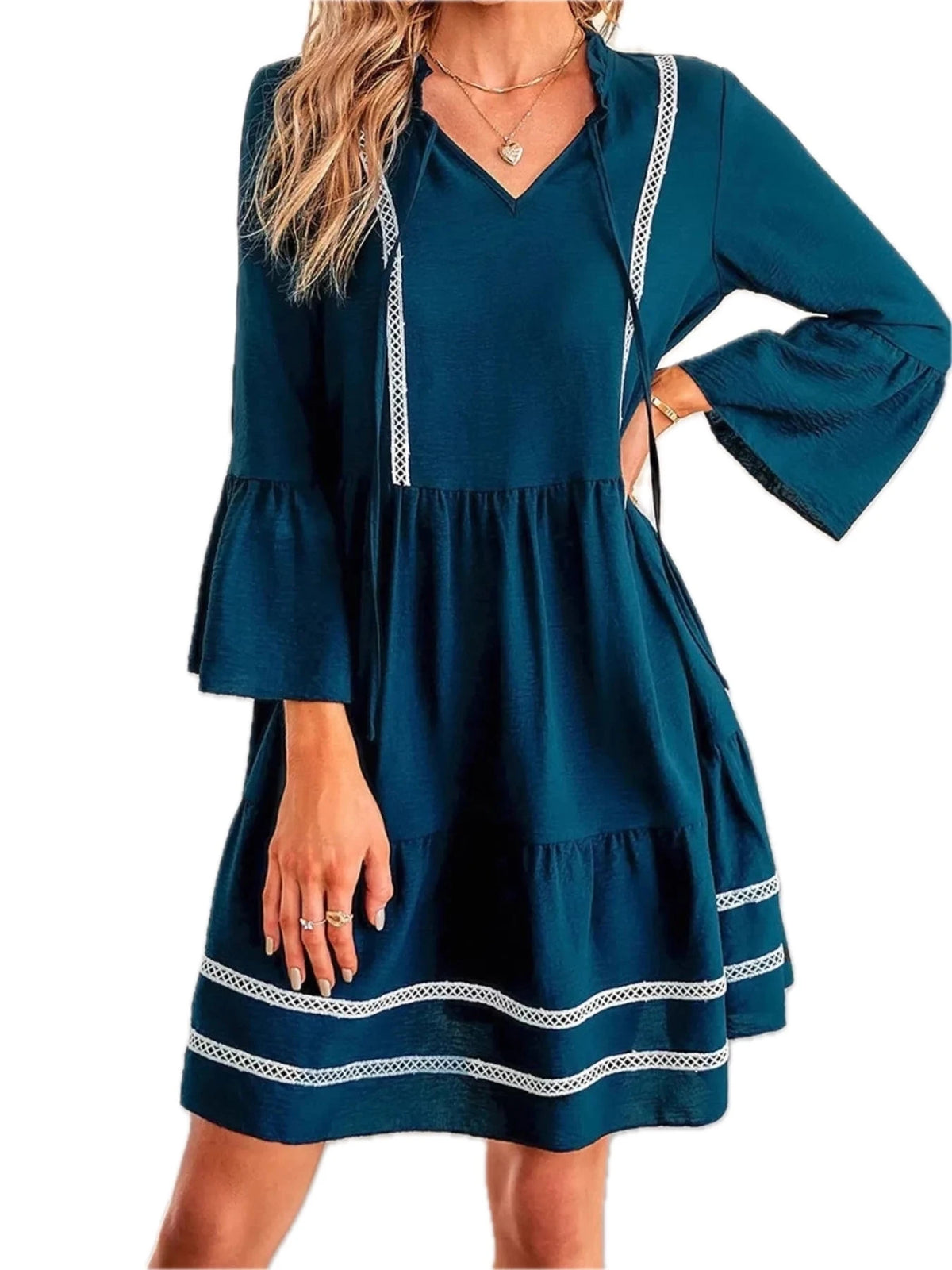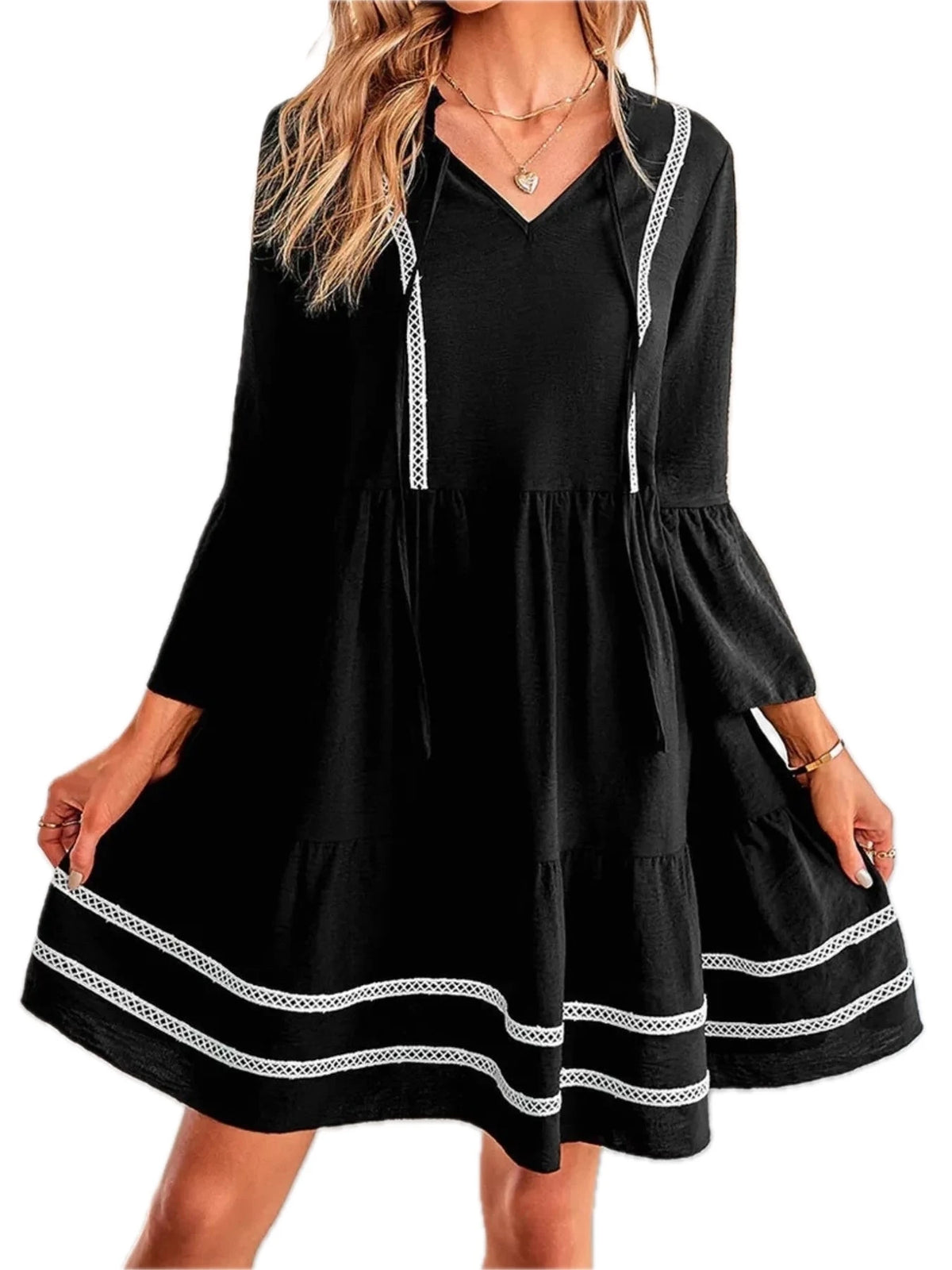 Women's Tie Neck Long Sleeve Mini Dress with Tiered Trim Detailing for Evening Wear 95% Polyester 5% Spandex Casual Wear