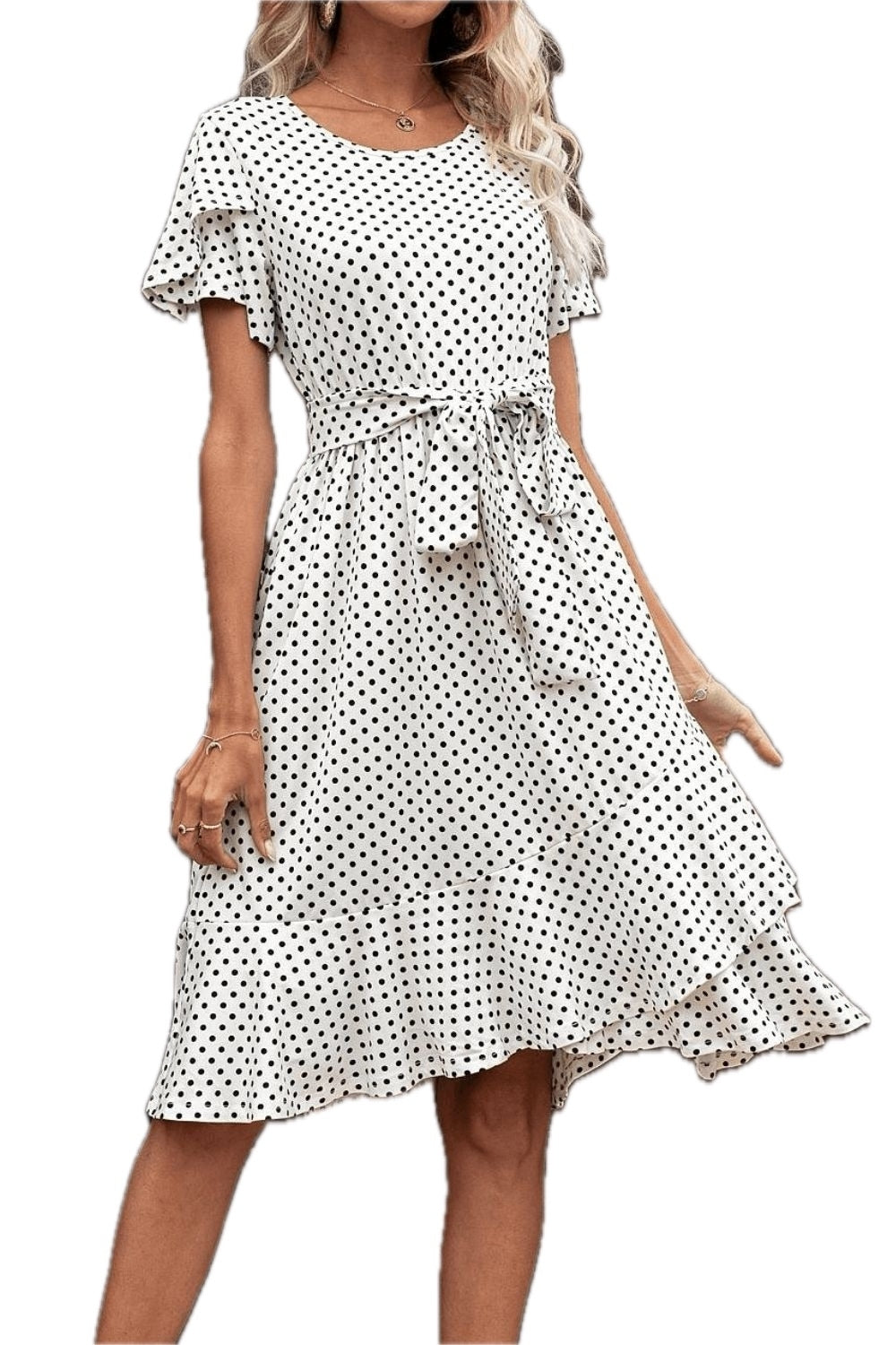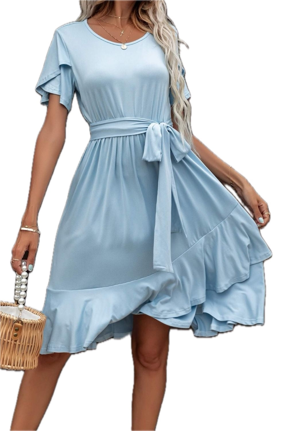 Women's Tie Waist Petal Sleeve Ruffle Hem Dress Round Neck Knee Length 95% Polyester 5% Spandex Casual Everyday