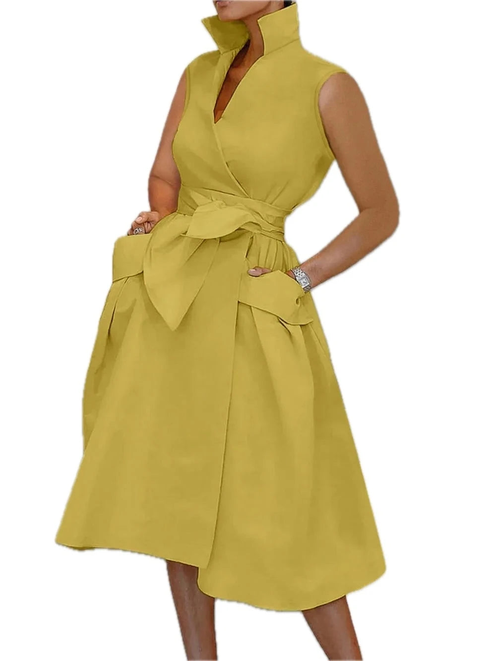 Women's Tie Waist Sleeveless Midi Dress with Pockets 95% Polyester 5% Elastane for Day to Night Everyday Wardrobe