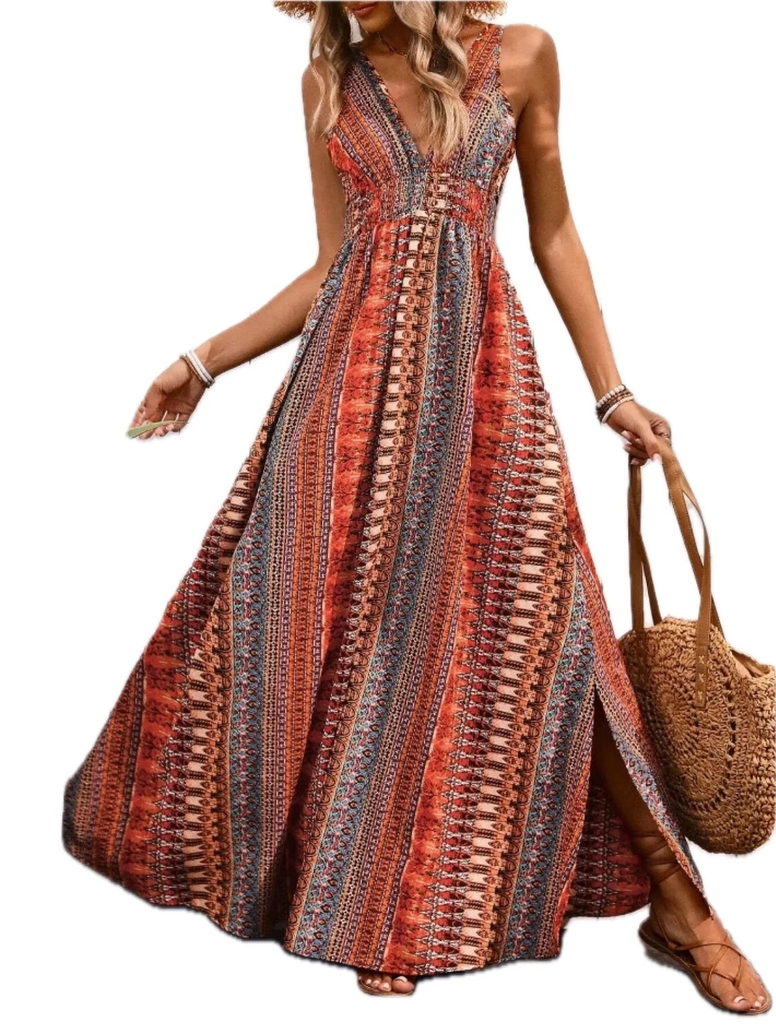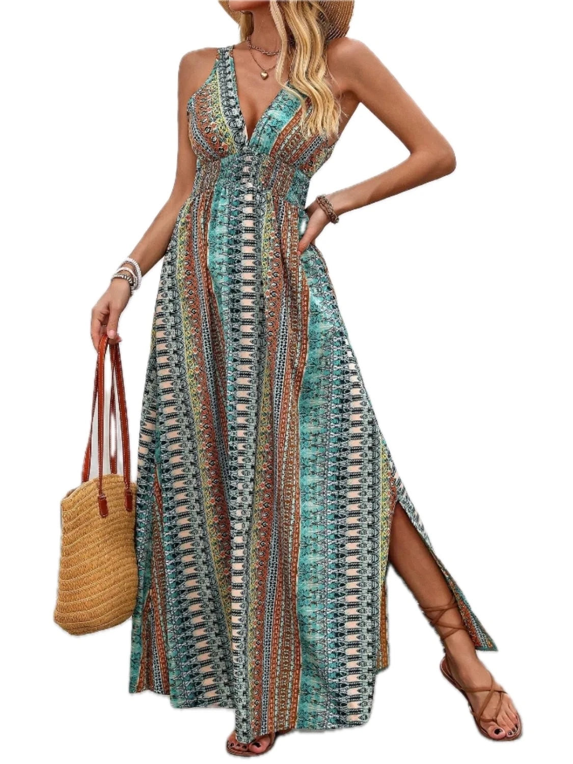 Women's Sleeveless Tied Back Printed Maxi Dress with Slit Front for Everyday Wear one hundred percent polyester