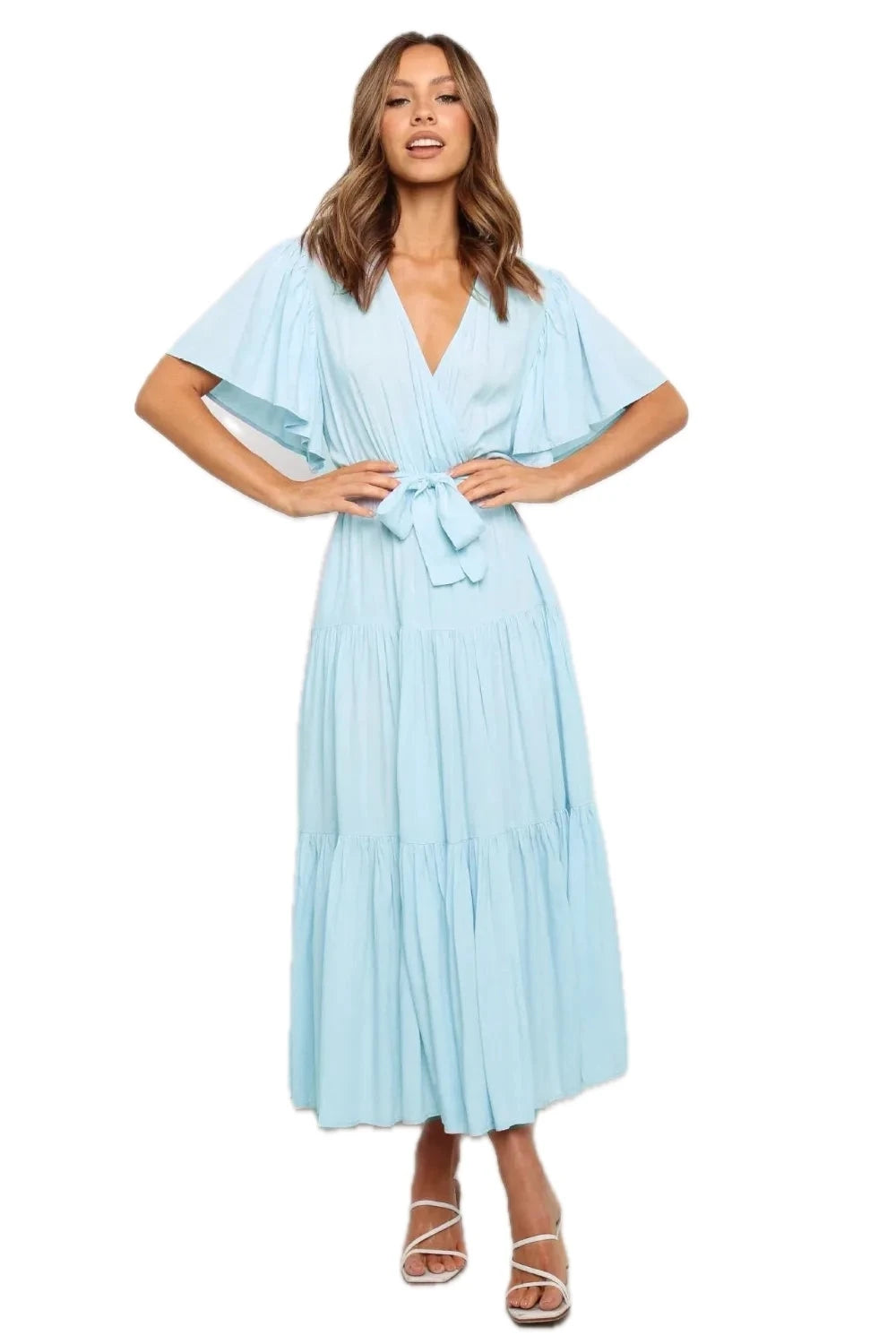 Women's Tied Back Tiered Short Sleeve Midi Dress with 65% Polyester and 35% Cotton for Everyday Wear Layered Silhouette