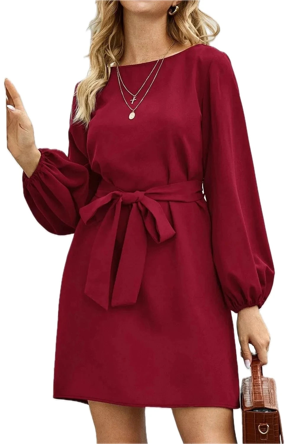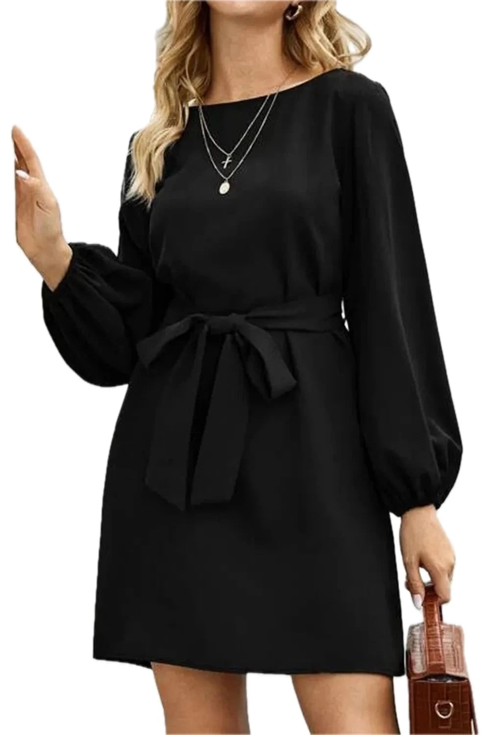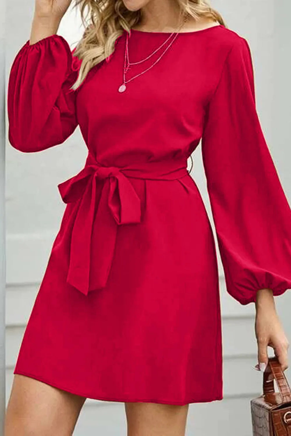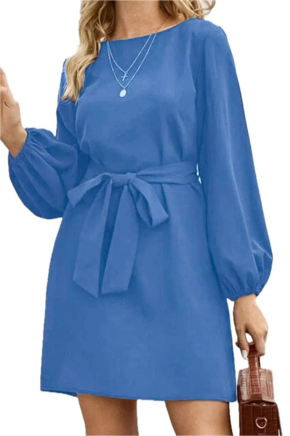 Women's Tied Boat Neck Balloon Sleeve Mini Dress with Sheer Overlay and Tie Front 95% Polyester 5% Spandex Fabric