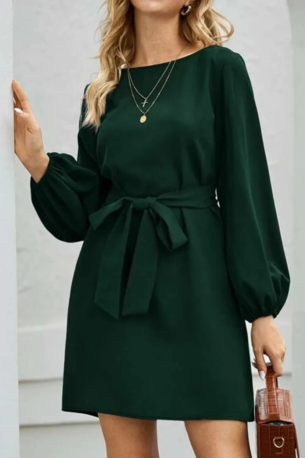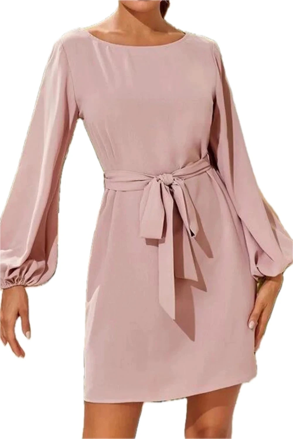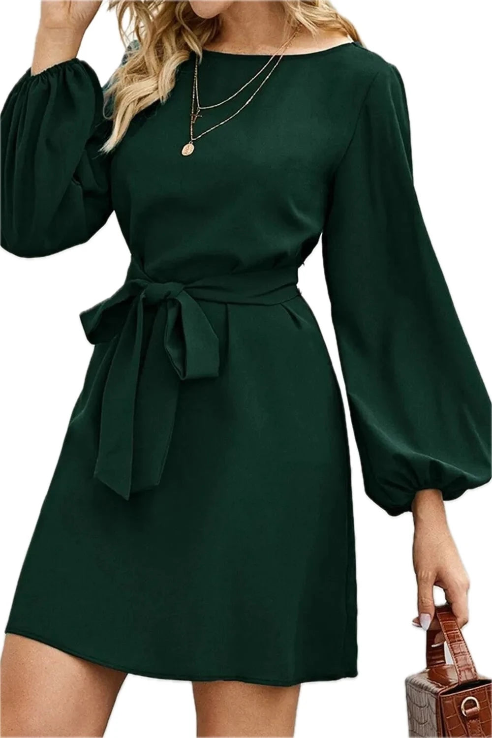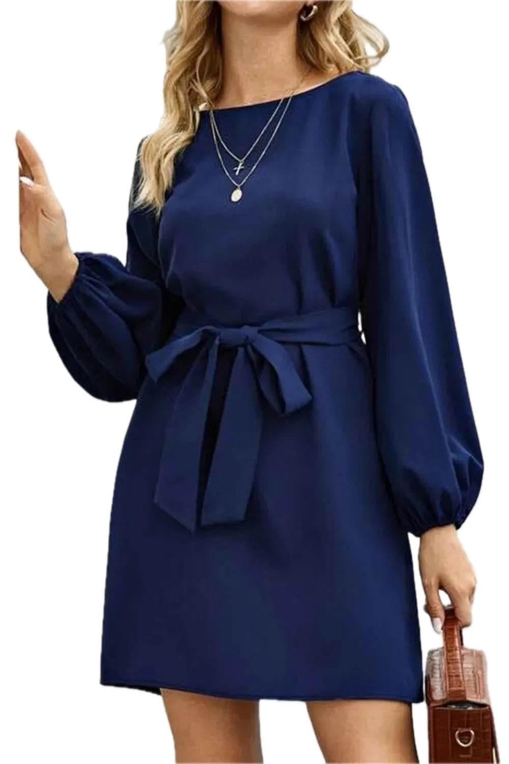Women's Tied Boat Neck Balloon Sleeve Mini Dress with Sheer Overlay and Tie Front 95% Polyester 5% Spandex Fabric