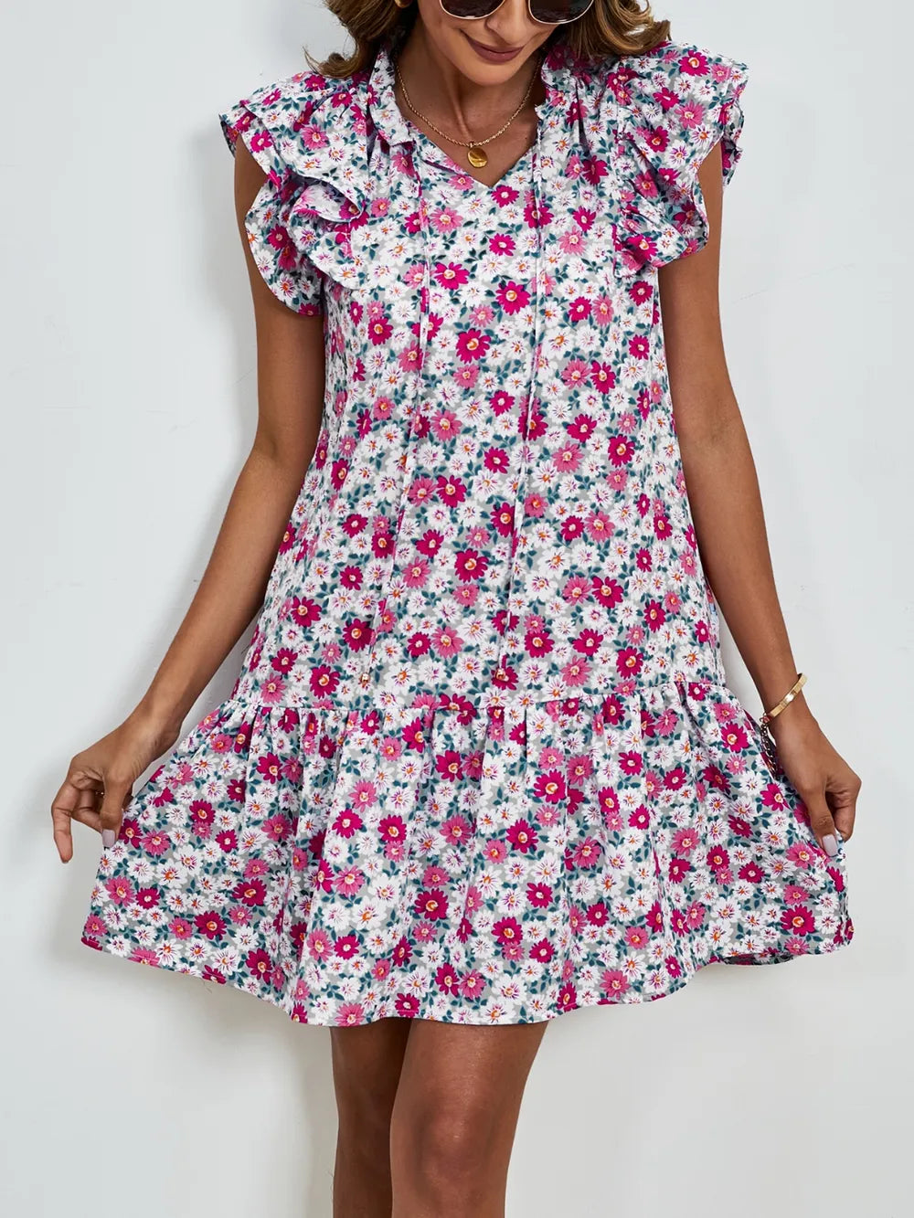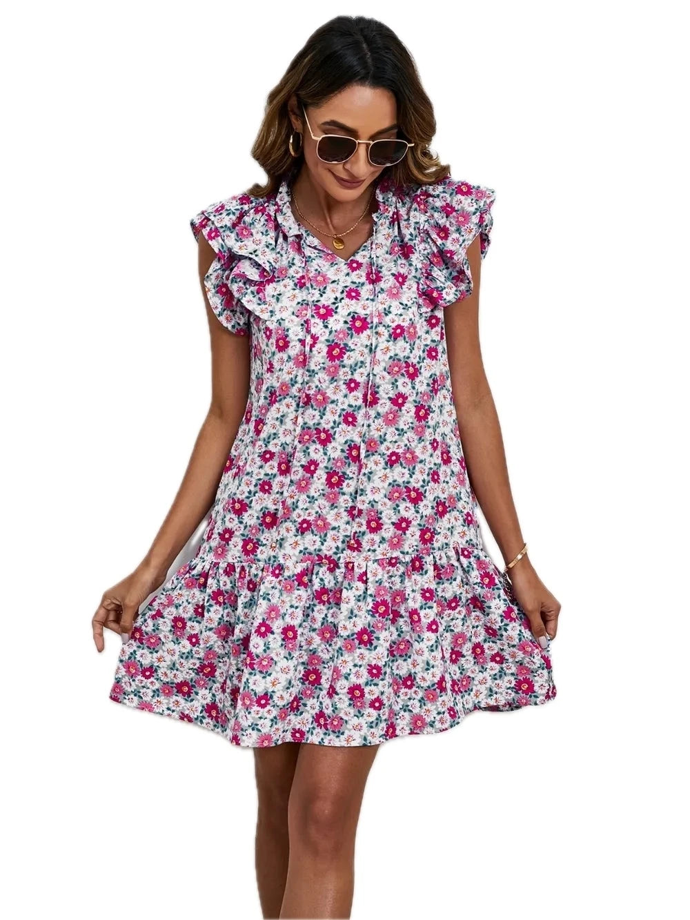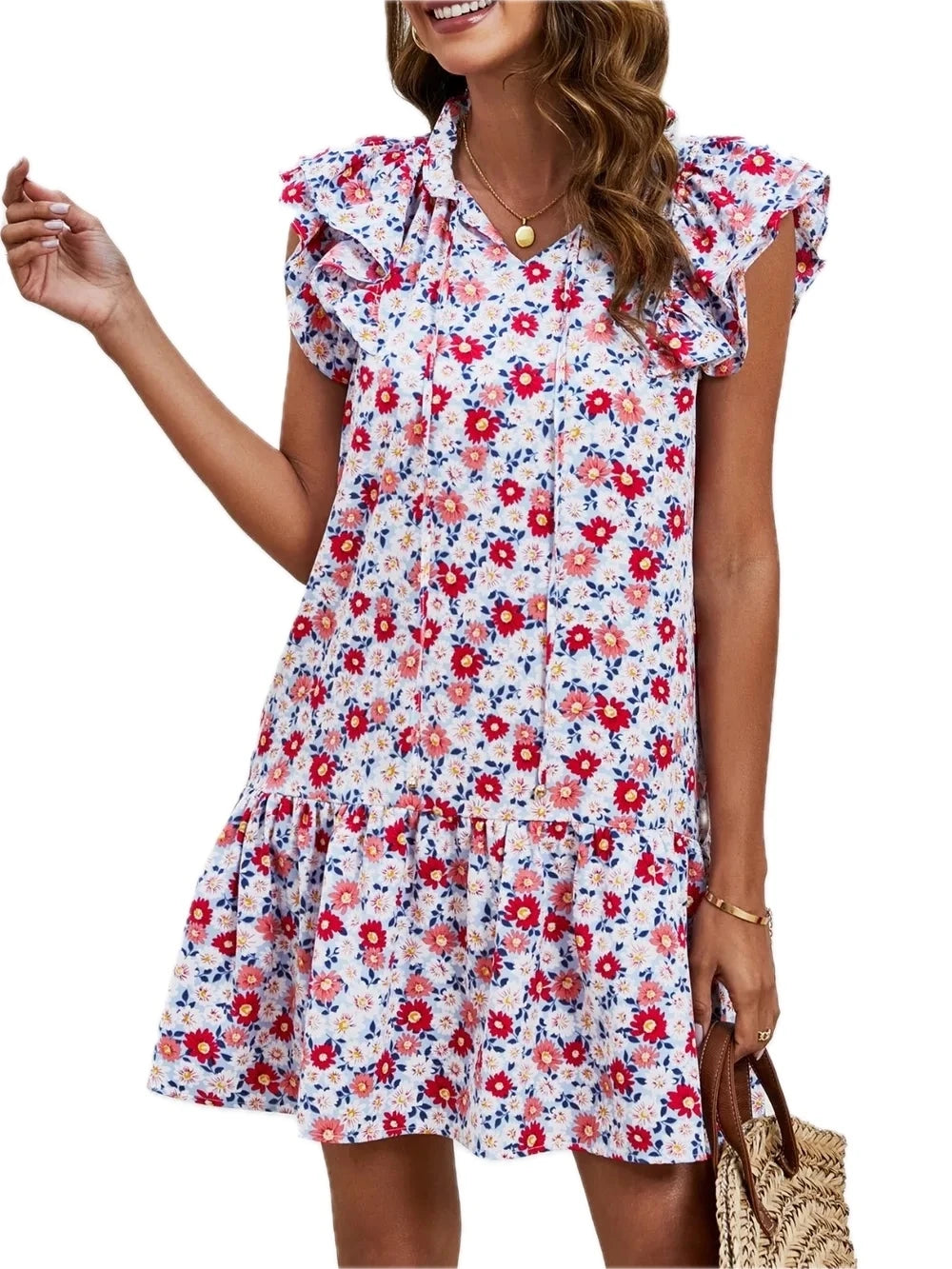 Women's Tied Floral Cap Sleeve Mini Dress 100% Polyester Lightweight Fabric for Summer Party Occasion Floral Print