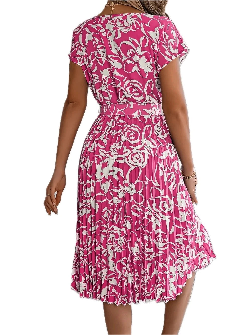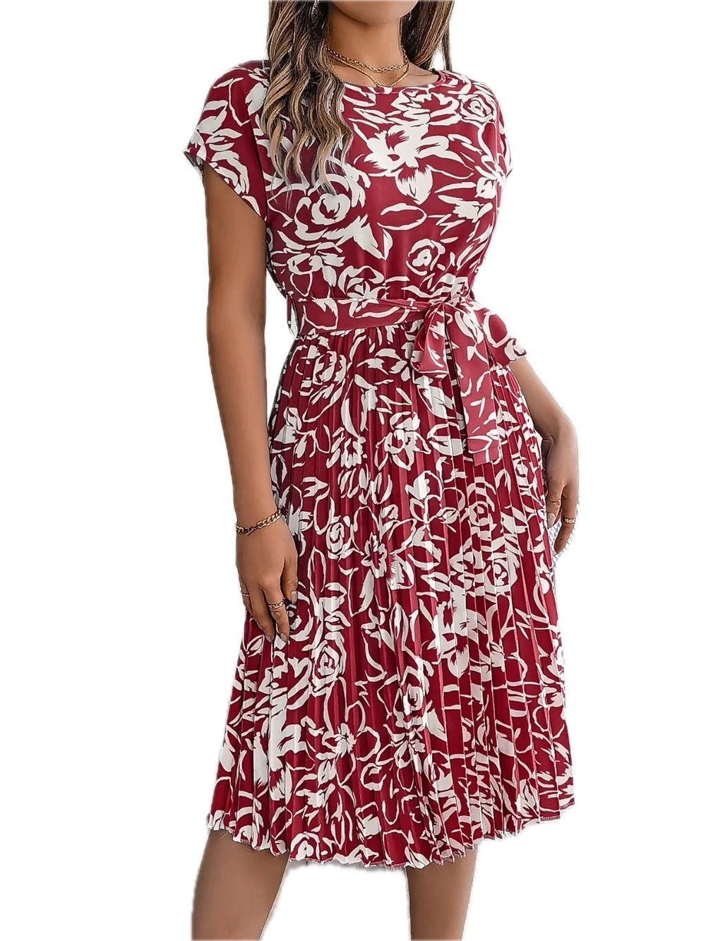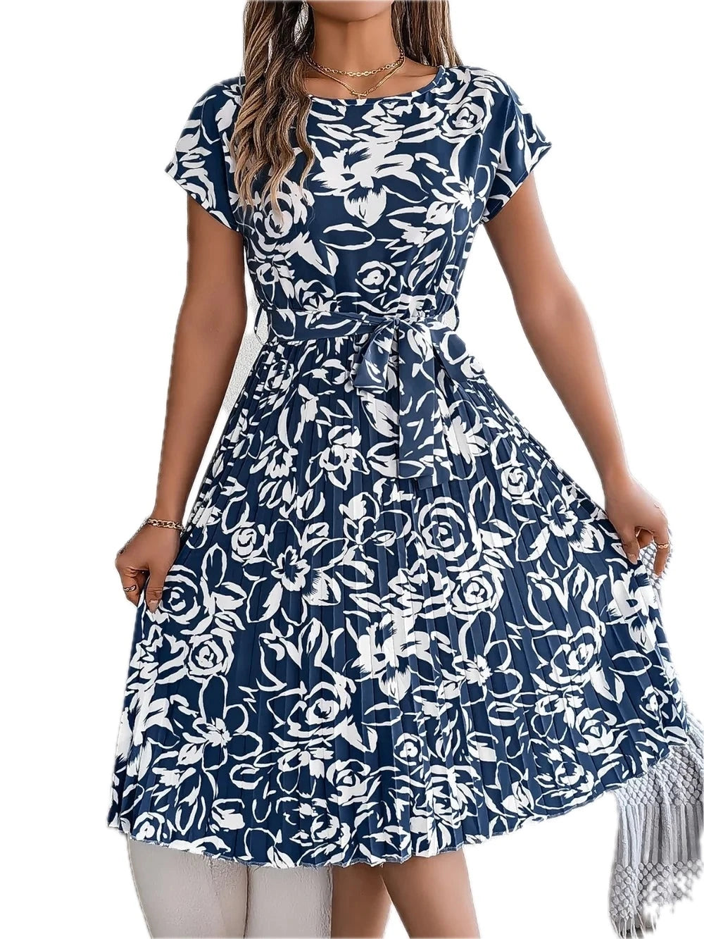 Women's Tied Pleated Printed Short Sleeve Dress 100% Polyester Lightweight Easy Care Everyday Wear Flowy Silhouette