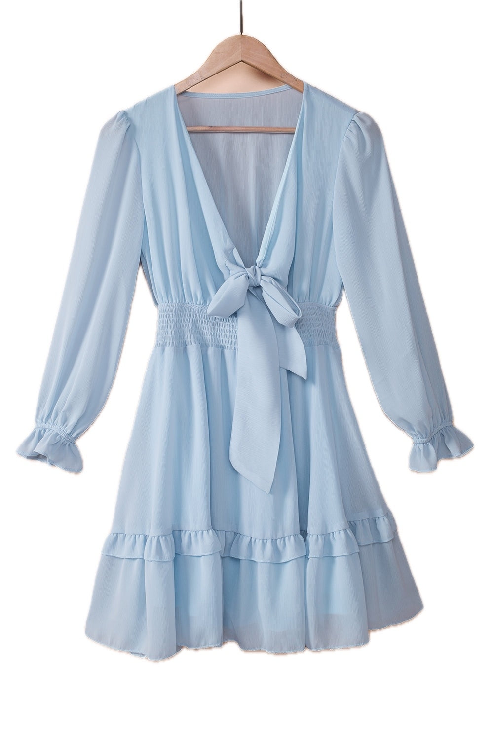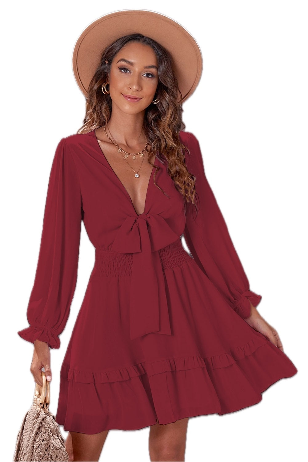 Womens Tied Plunge Smocked Waist Flounce Sleeve Dress 95% Polyester 5% Spandex Casual Mini Length Chic Party Ready