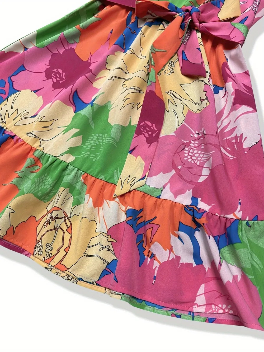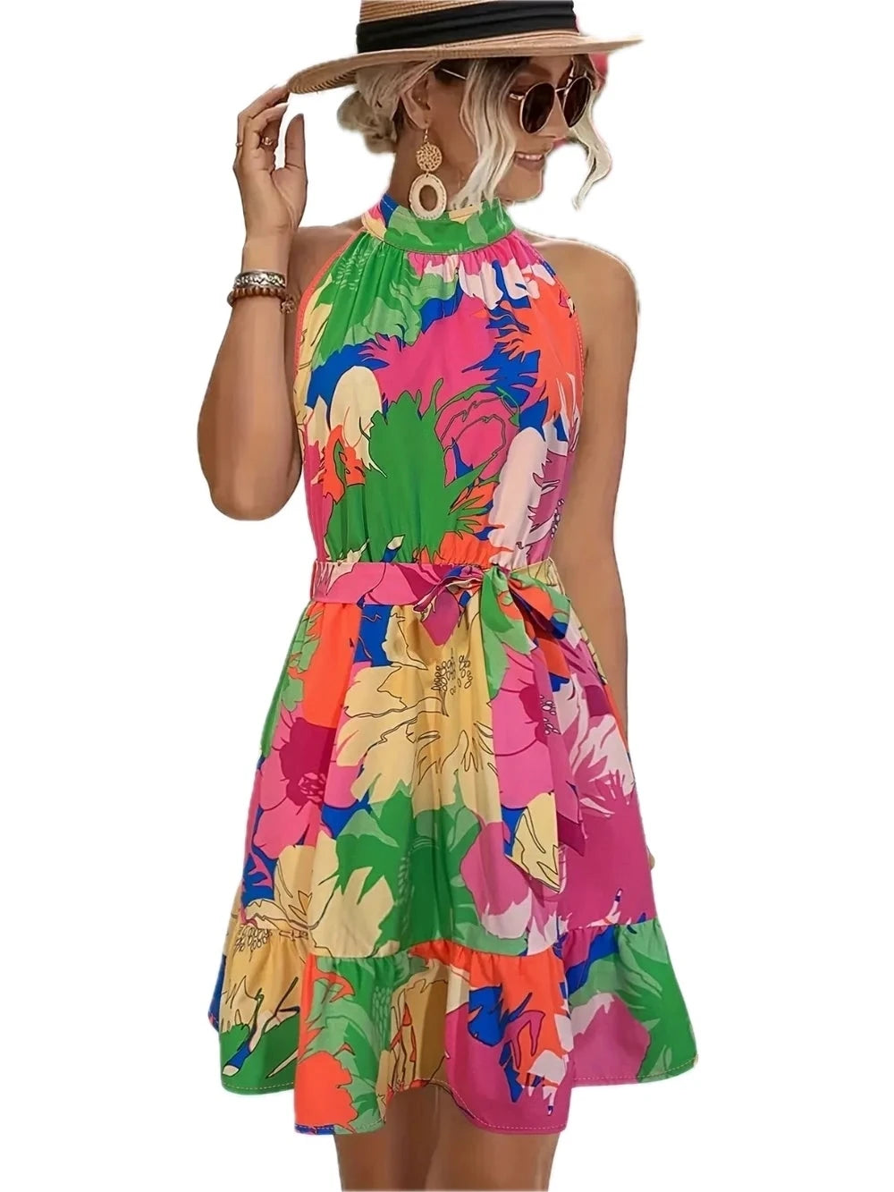 Women's Tied Printed Mock Neck Sleeveless Dress with Sheer Tie Detail and Opaque Stretch Fabric 95% Polyester 5% Spandex