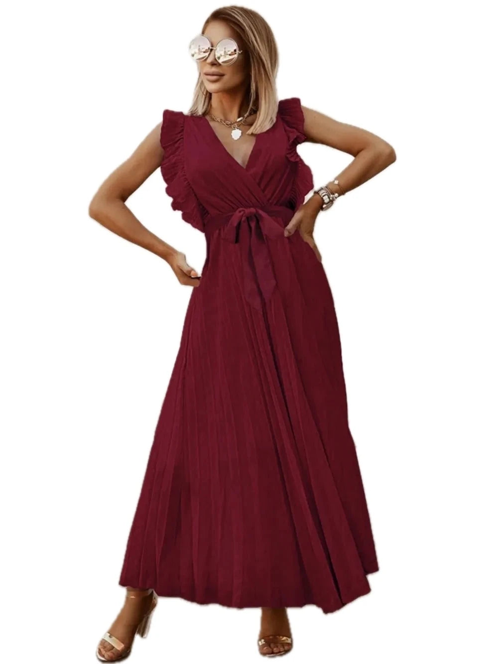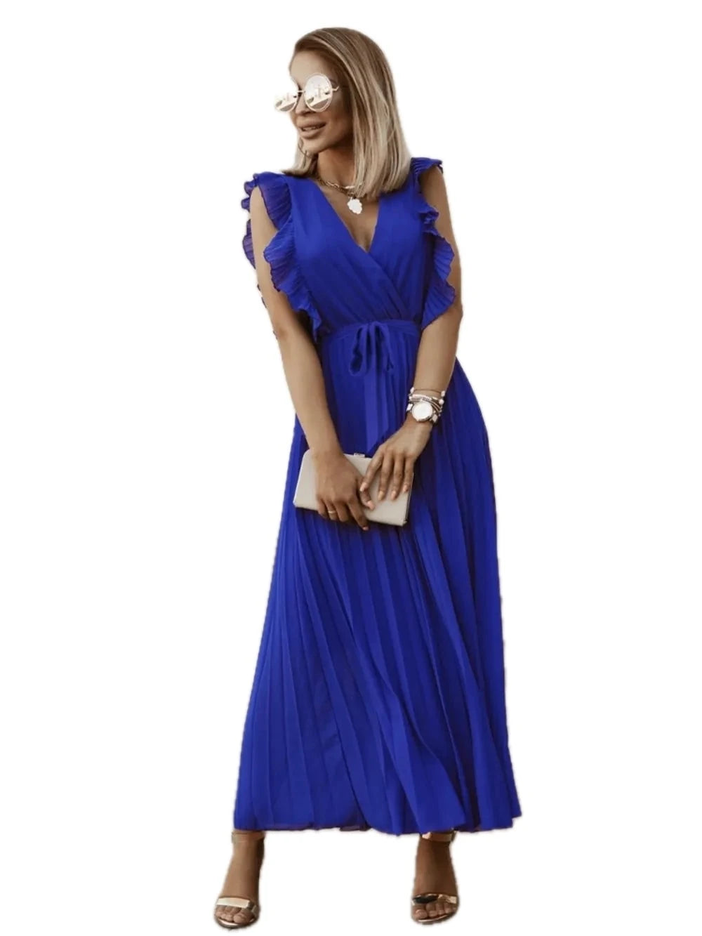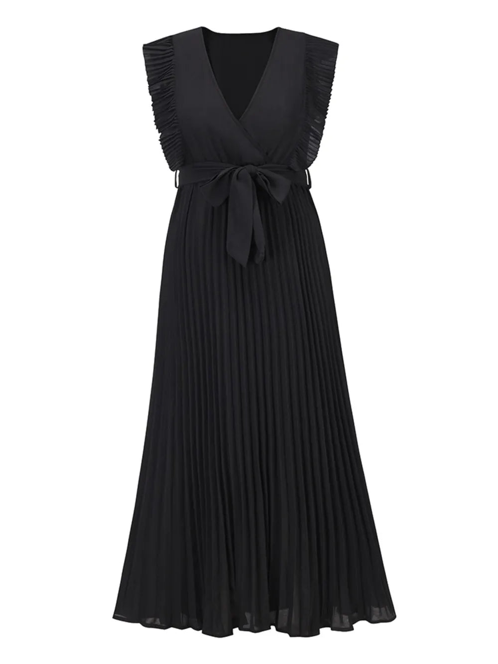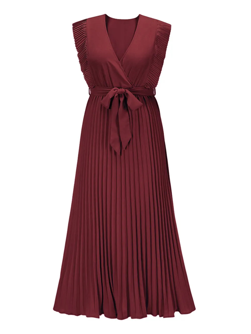 Women's tied surplice cap sleeve pleated dress 95% polyester 5% spandex fabric machine wash cold tumble dry low