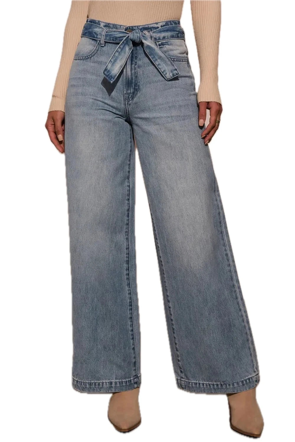 Women Wide Leg Jeans with Tie Front Belt High Waisted Casual Loose Fit Pockets Everyday Wear Comfortable Pants