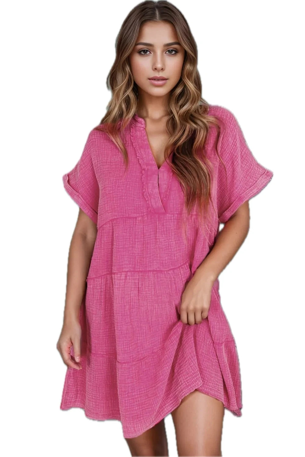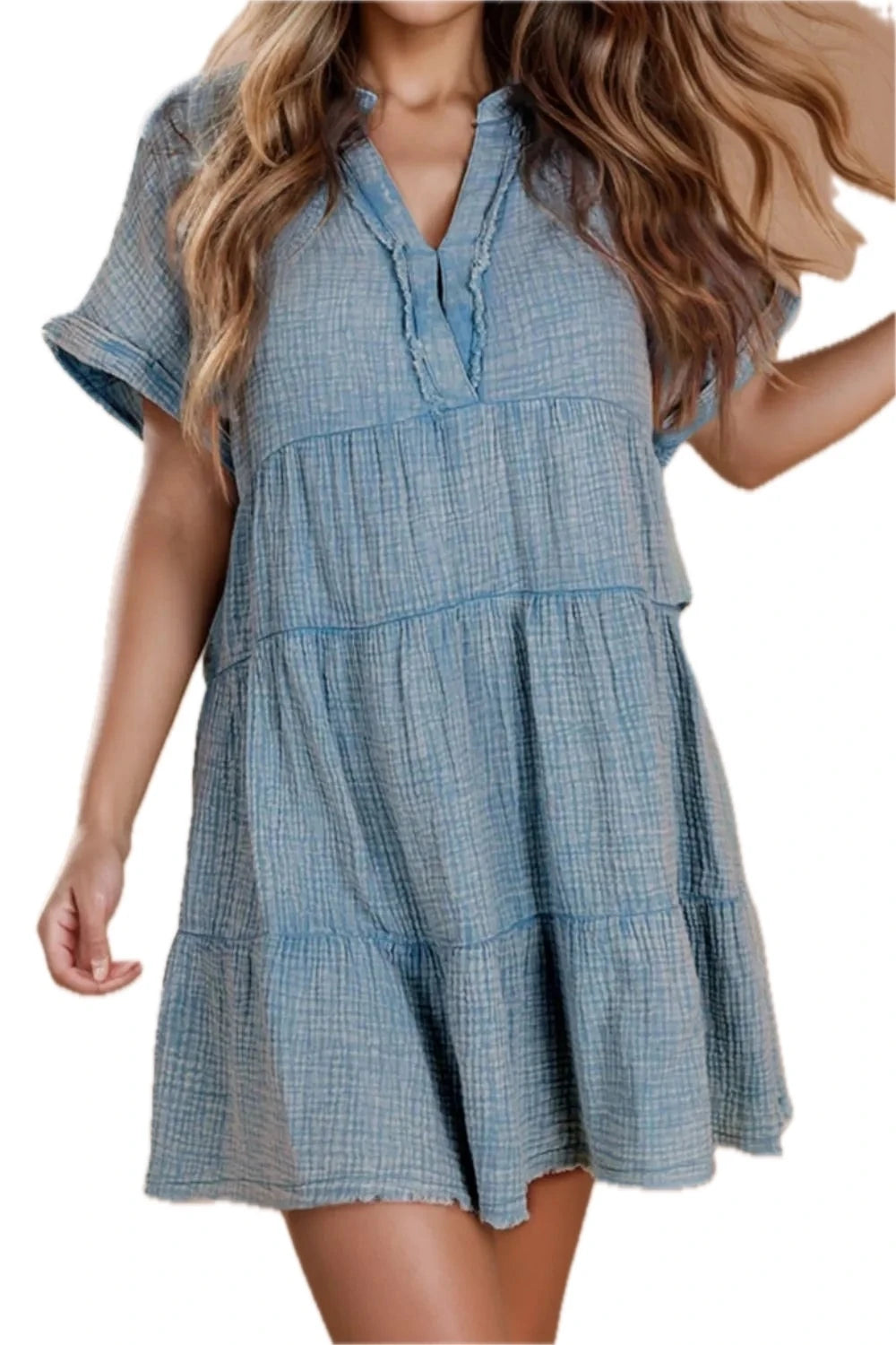 Women's Tiered Notched Short Sleeve Dress with Flattering Fit 70% Cotton Fabric Opaque Body Comfortable Everyday Wear