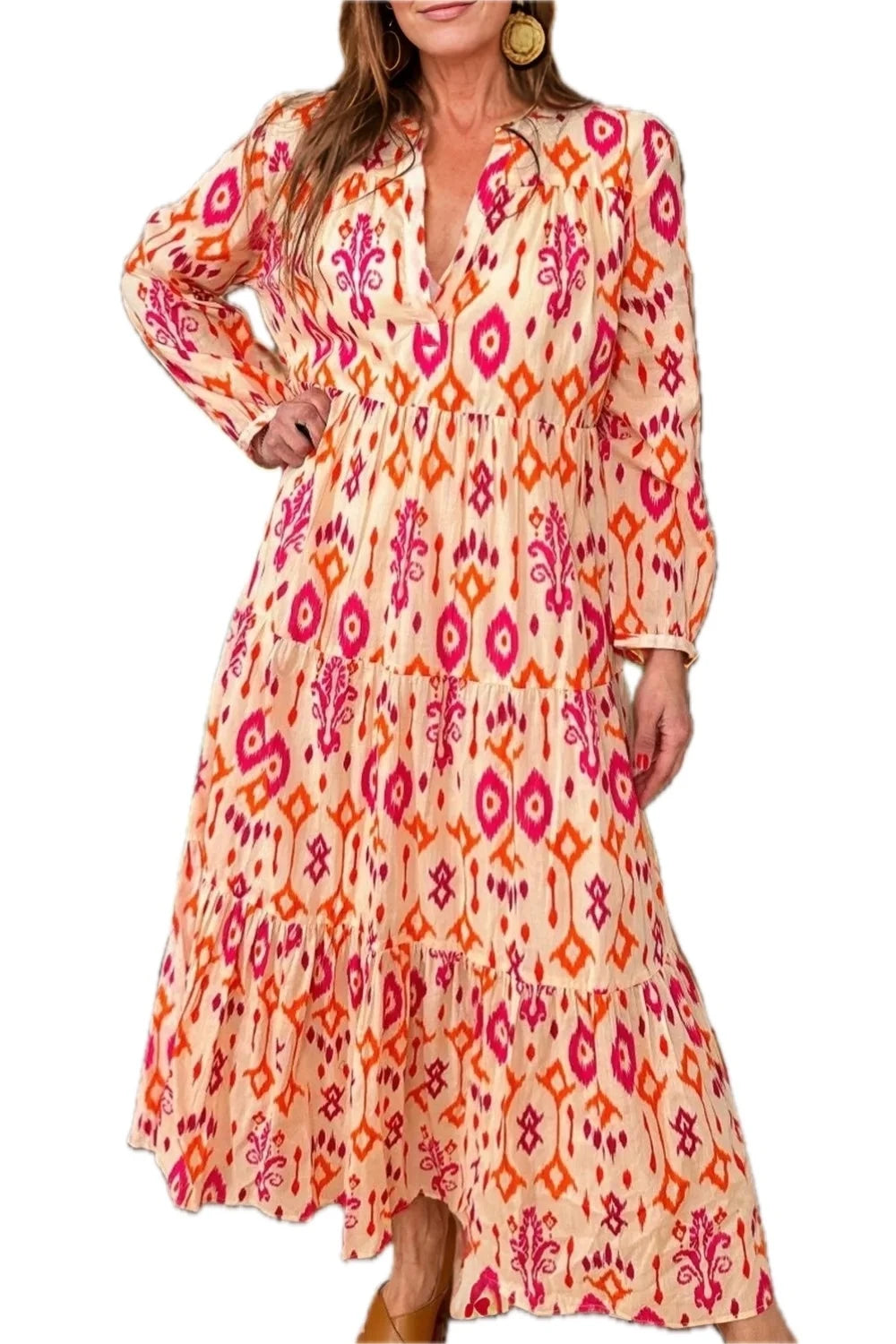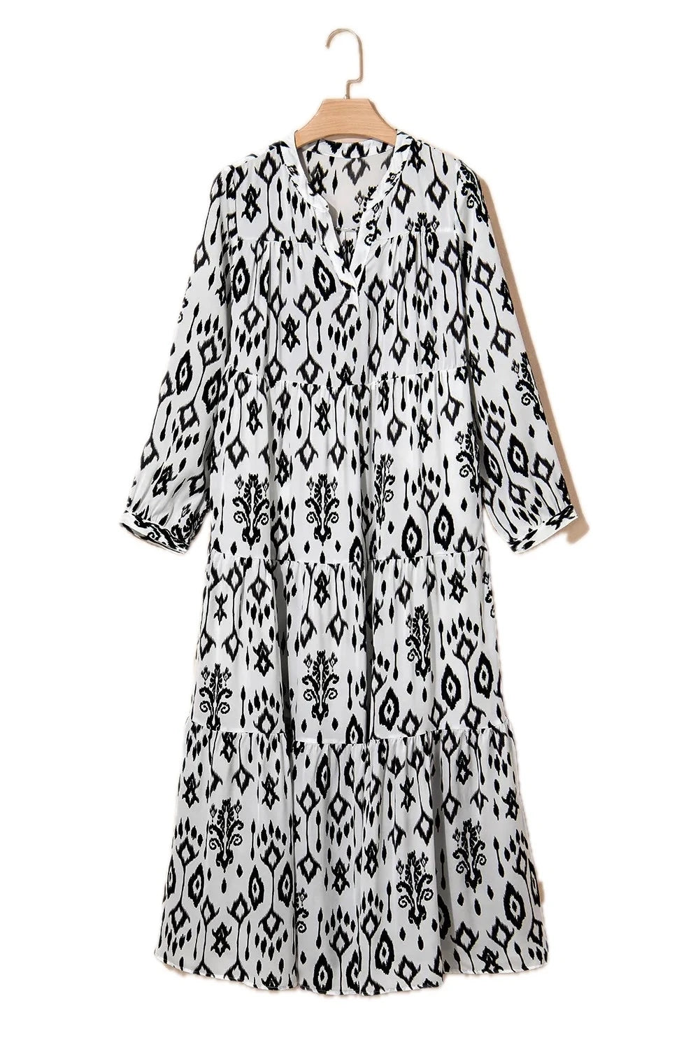 Women's Tiered Printed Notched Long Sleeve Midi Dress 100% Polyester Fabric Lightweight Elegant Everyday Dress Versatile