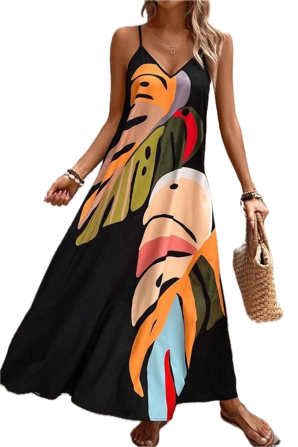 Women's Tropical Leaf Print V-Neck Maxi Cami Dress with Pockets 90% Polyester 10% Elastane for Daily Comfort and Style