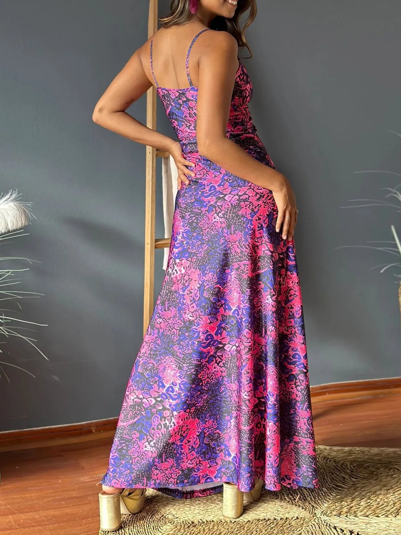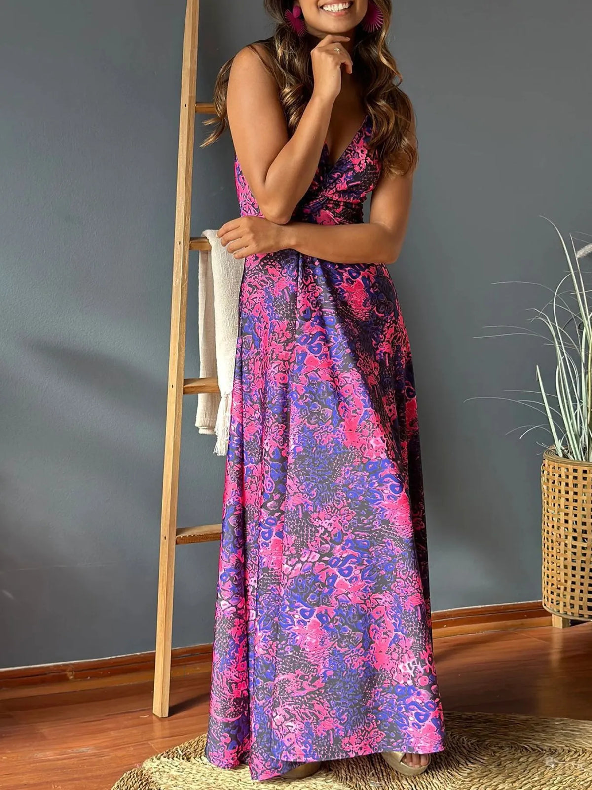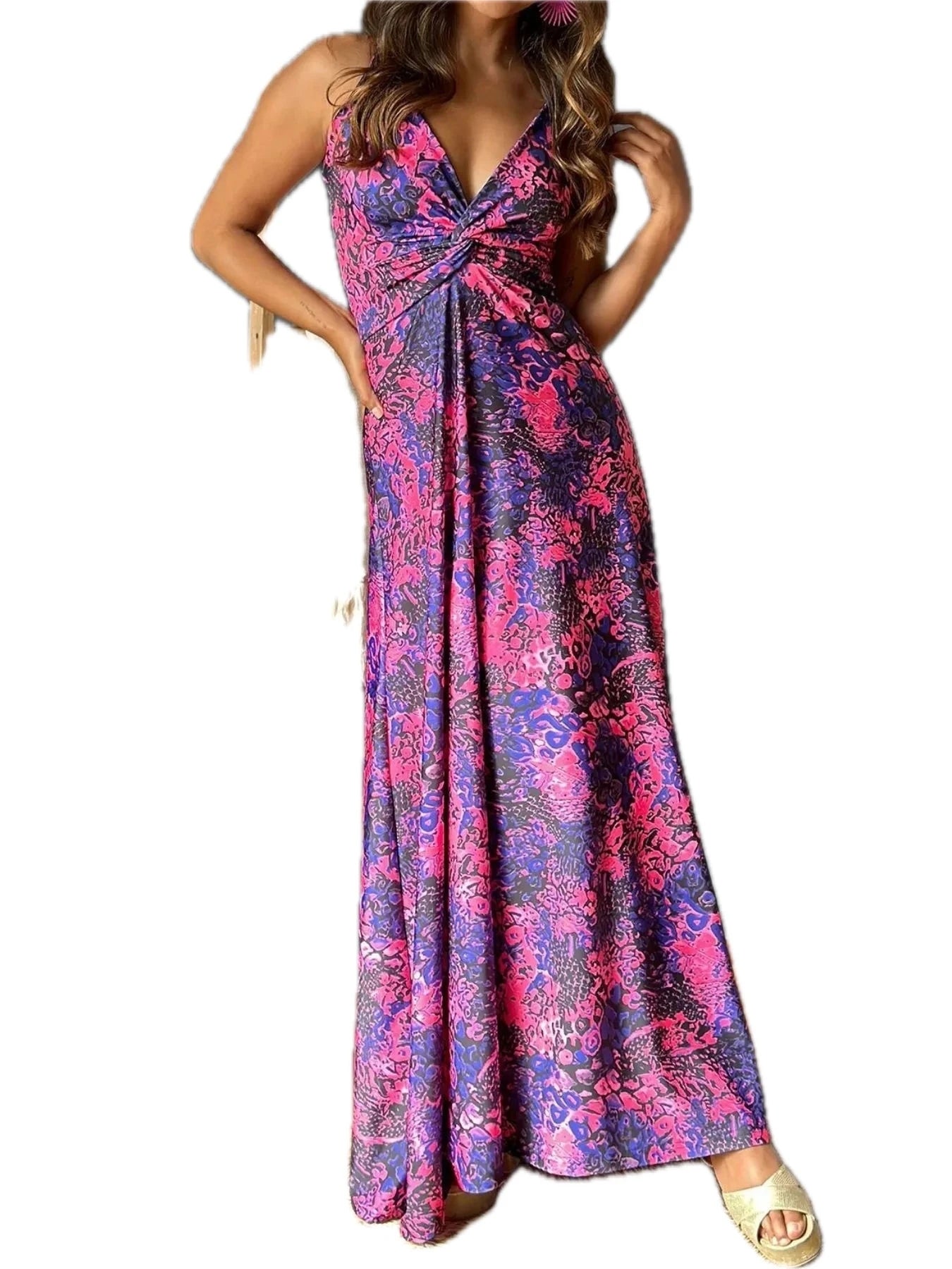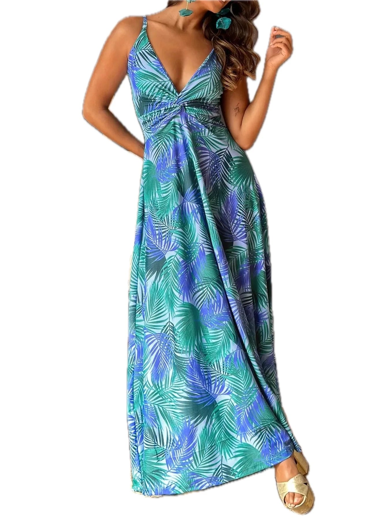 Women's Tropical Print V Neck Maxi Dress 100% Polyester Flowing Silhouette Perfect for Beach Vacation Everyday Ready