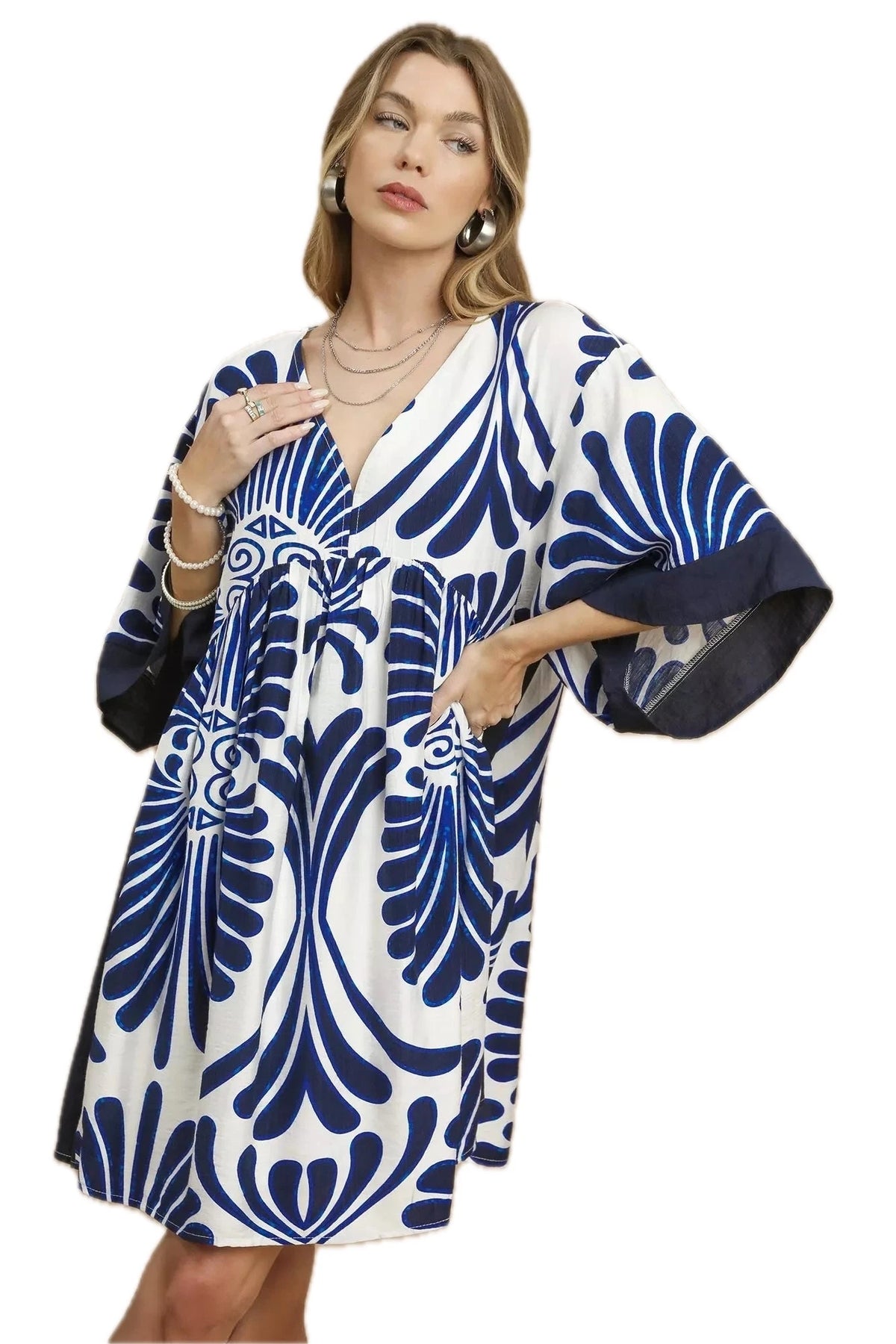 The abstract print kimono sleeve mini dress is a striking and fashionable choice for a bold and contemporary look. The abstract print adds a modern and artistic touch, making a statement with its unique design. The kimono sleeves provide a flowy and relaxed silhouette, adding a touch of elegance to the dress. This mini dress is perfect for both casual outings and special occasions, offering versatility in styling options. Pair it with heels for a dressed-up look or with sandals for a chic and relaxed ensemble that showcases your trendsetting style.